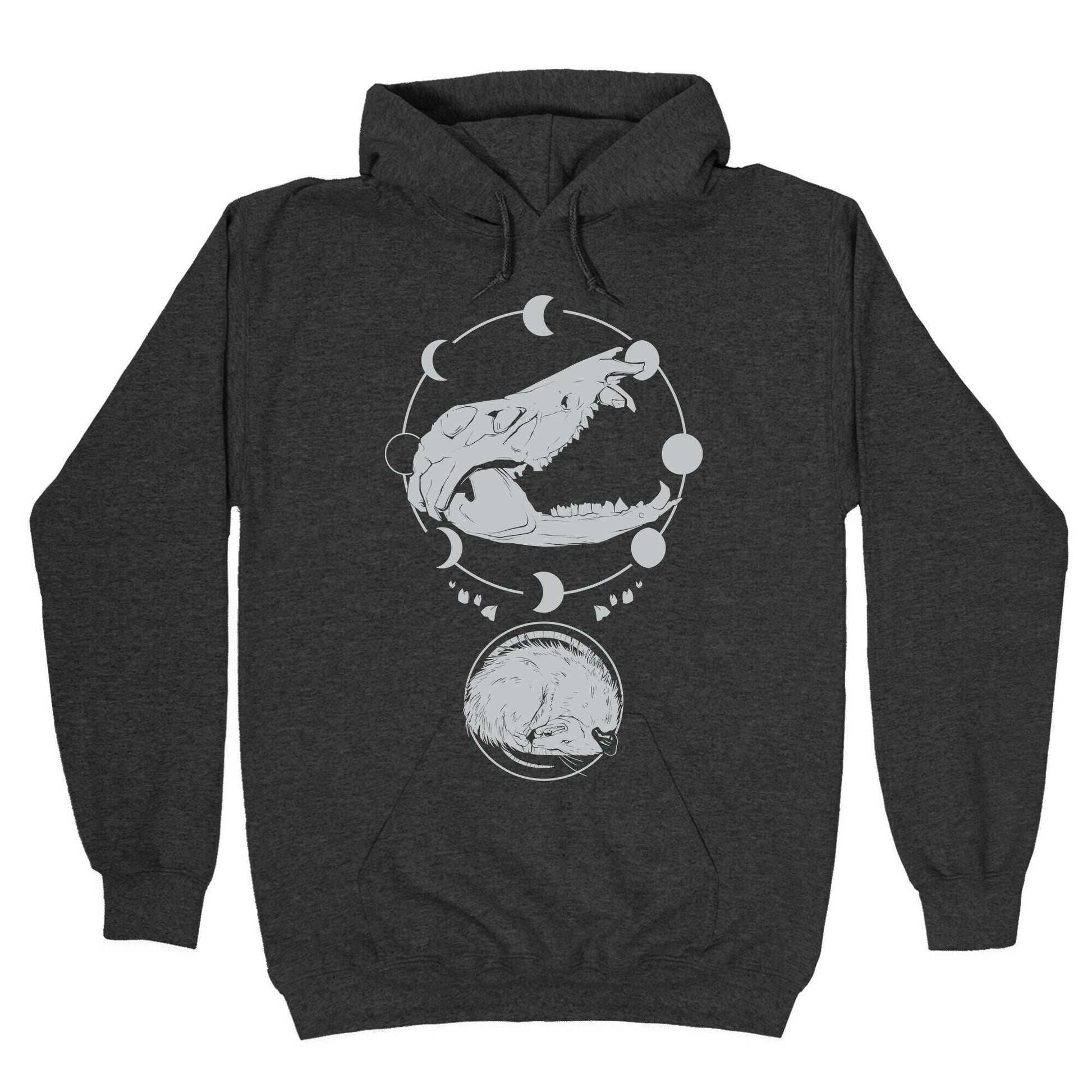 Unleash your inner witchy possum with this epic t-shirt design showcasing your love for all things occult. Featuring a viciously, beautiful possum skull emblazoned on the front with teeth bared, this design is not for the faint-hearted. The moon phases and a possum playing dead at the bottom complete the look of this artfully crafted piece, all inspired by images of the occult. Be the stand-out in any crowd with a shirt that speaks to your inner darkness, a true masterpiece of avant-garde style. Whether you're attending a black magic ritual or simply running errands around town, this shirt is the perfect way to show off your unique personality. Perfect for anyone with a touch of goth in their DNA, this shirt is sure to make a statement wherever you go. So, if you're looking for something that's both eerie and stylish, this is the tee for you. Wear it with pride and let your freak flag fly! Our Unisex Pullover Hoodie is made from a soft 8-ounce fabric They feature a drawstring hood and front kangaroo pocket. Great for layering! Preshrunk for your convenience! Printed in the USA. Made with 50% Cotton and 50% Polyester.