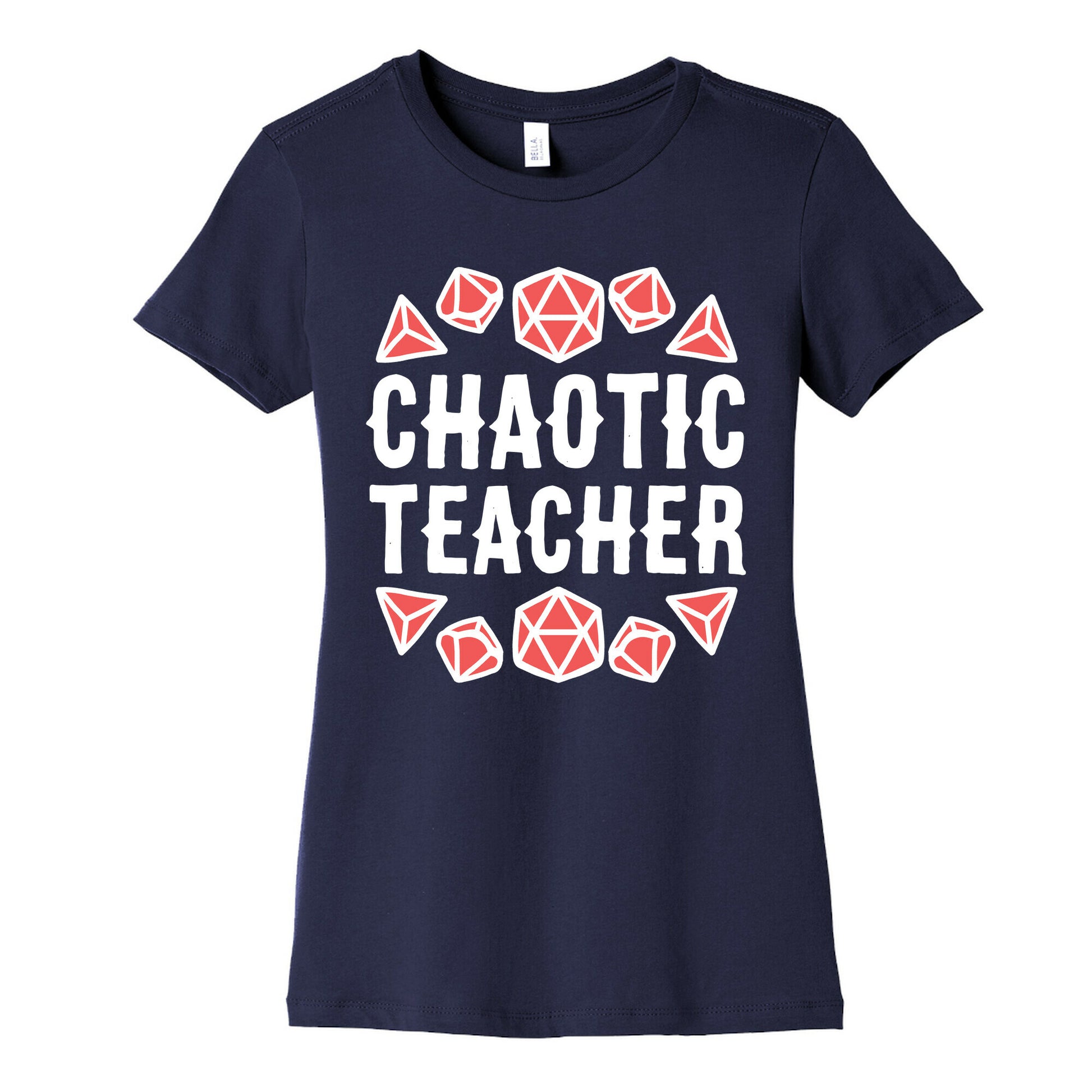 Are you a teacher with a chaotic energy? Show off your unique teaching style with our "Chaotic Teacher" t-shirt! Inspired by the imaginative world of Dungeons and Dragons, this design is perfect for nerdy educators who aren't afraid to think outside the box. With its eye-catching design and clever messaging, this shirt is a fun way to connect with your students and let them know that anything goes in your class! Whether you're teaching calculus or chemistry, this shirt is a great conversation starter and will have everyone wanting to join in on the fun. So let your freak flag fly and wear your pride on your sleeve (or chest!) with our Chaotic Teacher t-shirt. Trust us, your students will appreciate your cool and quirky style. Buy one now and add some fun to your daily lesson planning!Our slim fit Women’s Cotton Tees, are made with exceedingly soft 100% cotton. They feature a relaxed neckline, and the sleeves and bottom, are hemmed for durability. Preshrunk for your convenience! Printed in the USA. Made with 100% Cotton. Colors such as gray, is made up of 90% cotton and 10% polyester, and deep pink is made up of 50% cotton and 50% polyester.