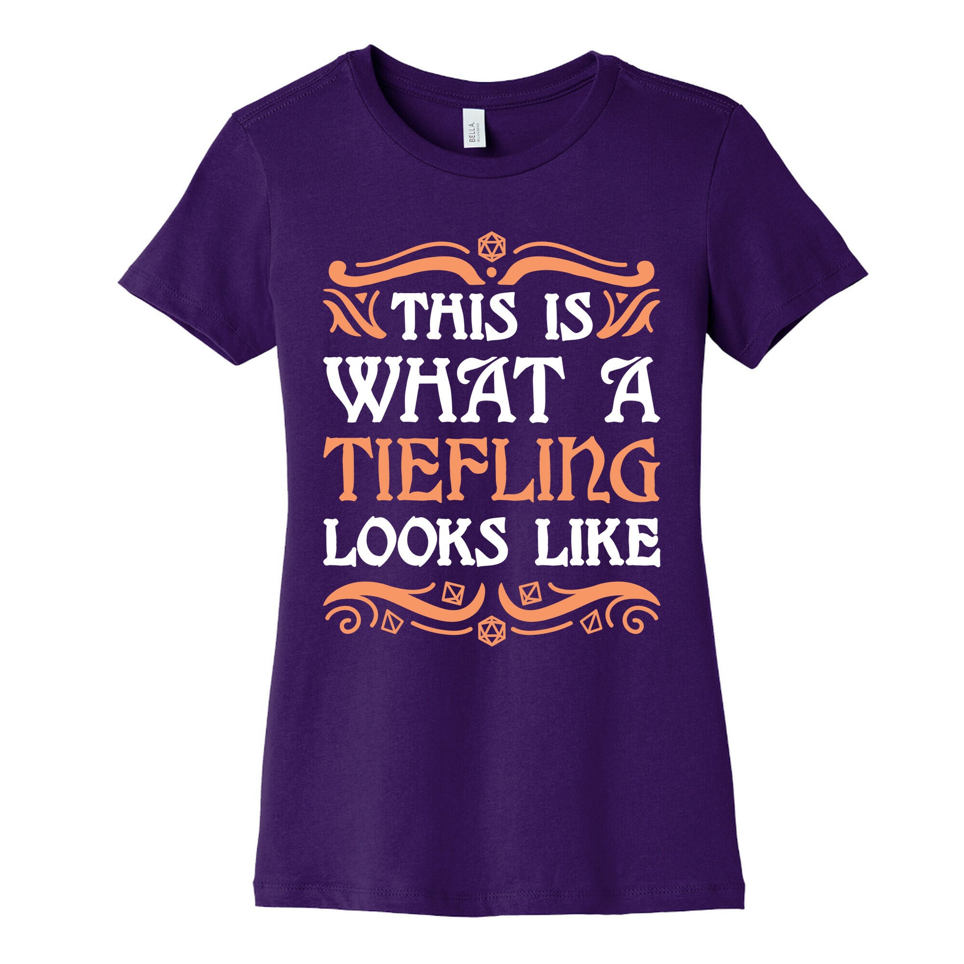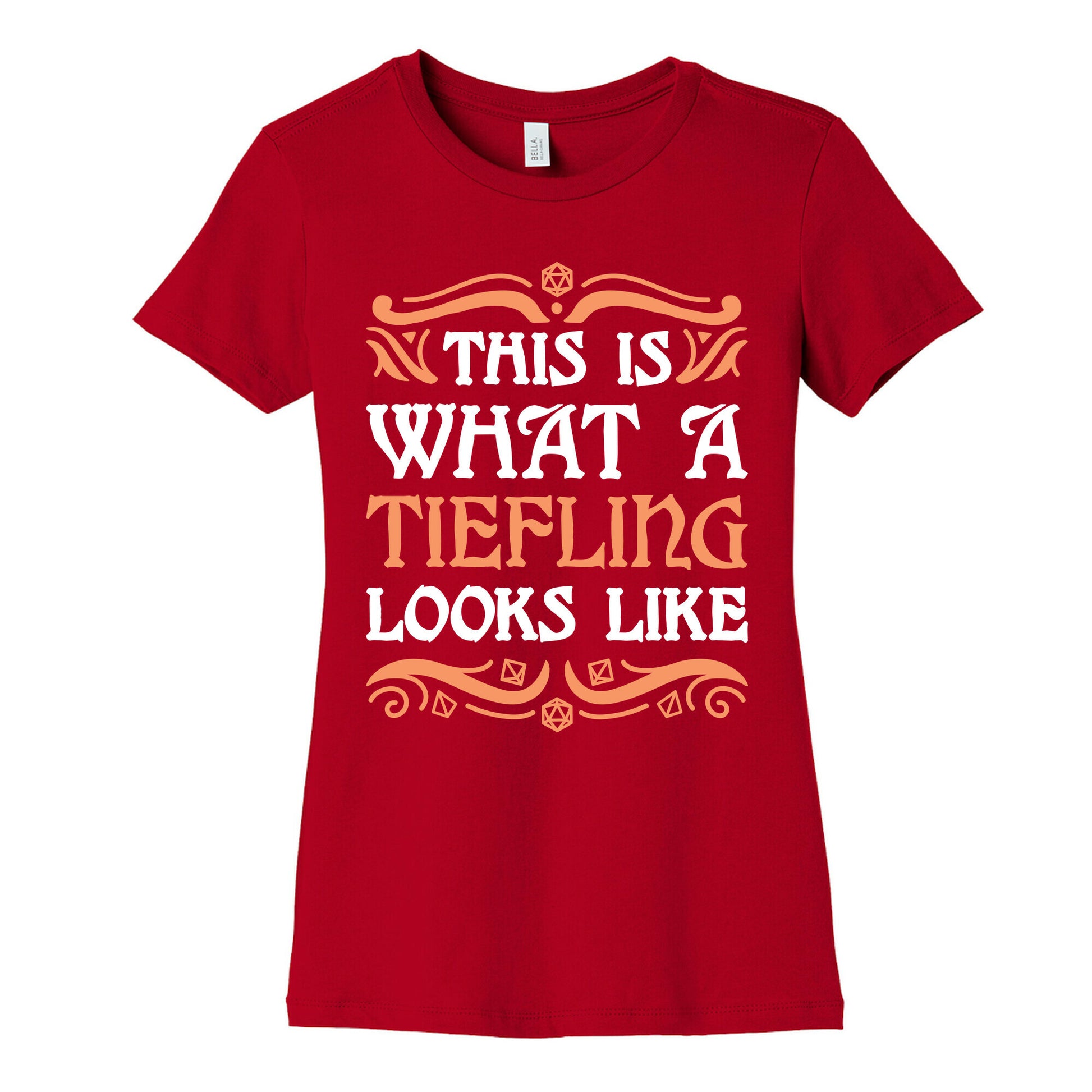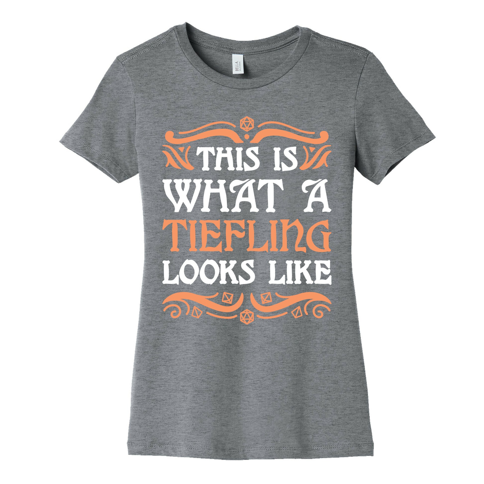 Proudly show your D&D race as a Tiefling with this, "This Is What A Tiefling Looks Like" nerd pride design! Reclaim nerd culture and show that anyone can proudly love fantasy role playing, no matter what they look like. Perfect for a lover of Dungeons and Dragons who plays as a tiefling!Our slim fit Women’s Cotton Tees, are made with exceedingly soft 100% cotton. They feature a relaxed neckline, and the sleeves and bottom, are hemmed for durability. Preshrunk for your convenience! Printed in the USA. Made with 100% Cotton. Colors such as gray, is made up of 90% cotton and 10% polyester, and deep pink is made up of 50% cotton and 50% polyester.