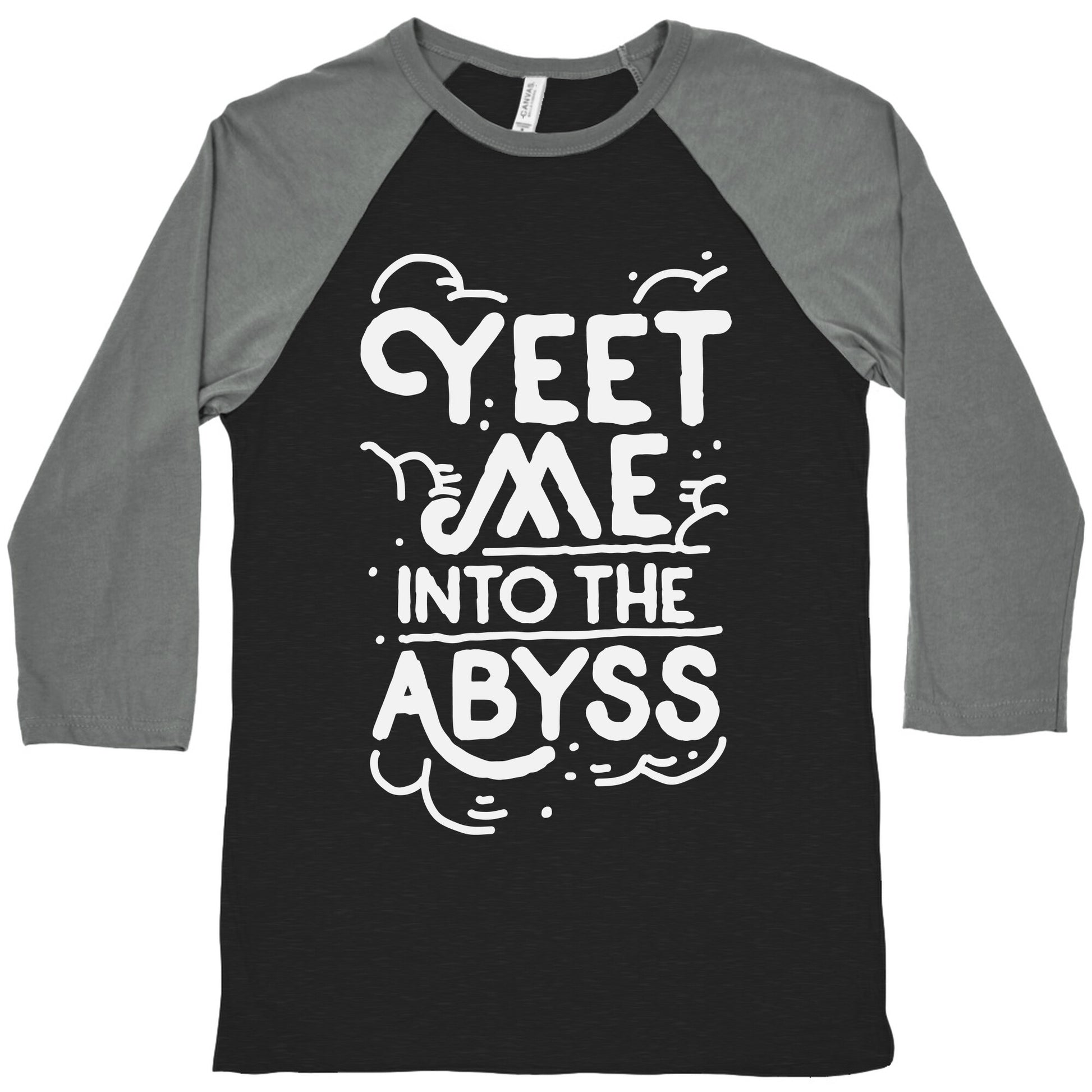Get ready to dive deep into the abyss with this hilariously edgy t-shirt design, featuring the iconic phrase "Yeet Me into the Abyss". Whether you're feeling down in the dumps or just need a good laugh, this shirt is bound to turn heads and spark some conversations. With its bold font and eye-catching design, it's the perfect addition to any stylish and irreverent wardrobe. Let your inner emo shine through with this must-have tee, showcasing your love of all things melancholy and dramatic. Plus, it's perfect for anyone who loves a bit of dark humor and isn't afraid to embrace their inner goth. So why wait? Take the plunge and grab your very own "Yeet Me into the Abyss" tee today! Our exceedingly soft and relaxed fit Tri-Blend Baseball Tee features a three-quarter length sleeve, crew neck, fun contrasting color sleeves and neck trim. Preshrunk for your convenience! Printed in the USA. Made with 50% Polyester, 25% Cotton and 25% Rayon