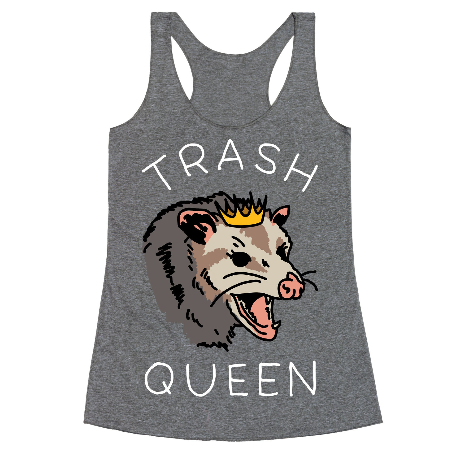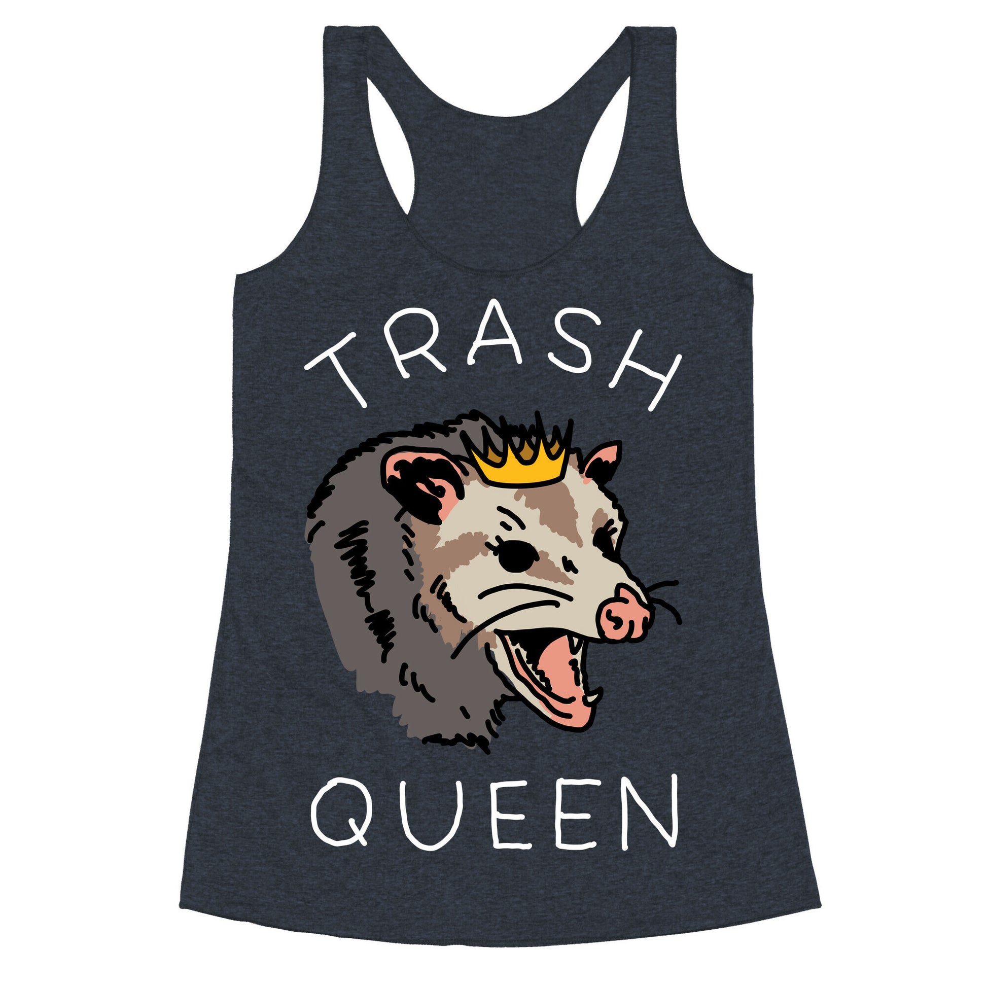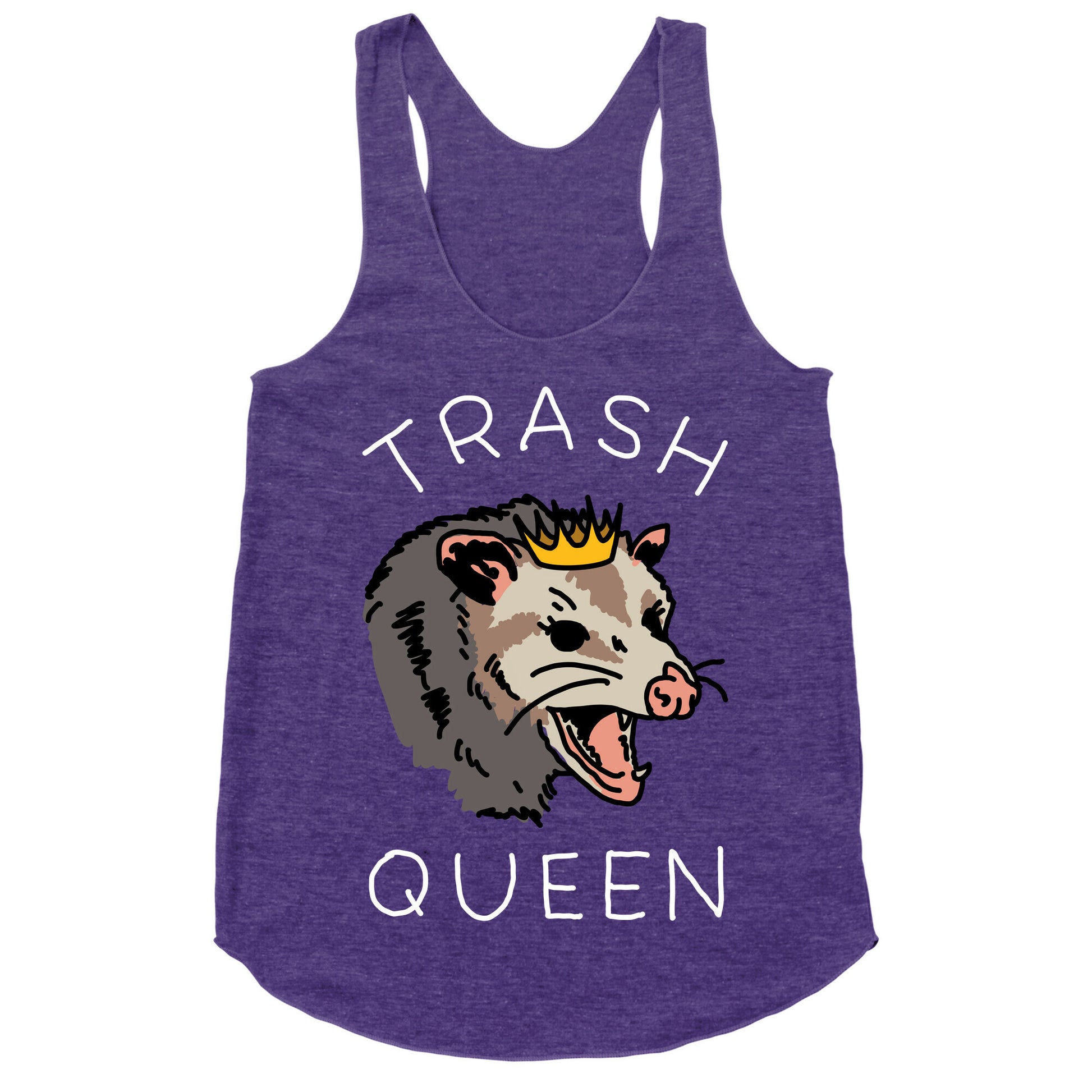Trash Queen. Show you're the queen of trash with this sassy Opossum design.Our super comfortable Women’s Raw Edge Racerback features a soft tri-blend, unhemmed fabric, with a fashionable bell-like shape for the bottom. Preshrunk for your convenience! Printed in the USA. Made with 50% Polyester 25% Ring Spun Cotton, and 25% Rayon.
