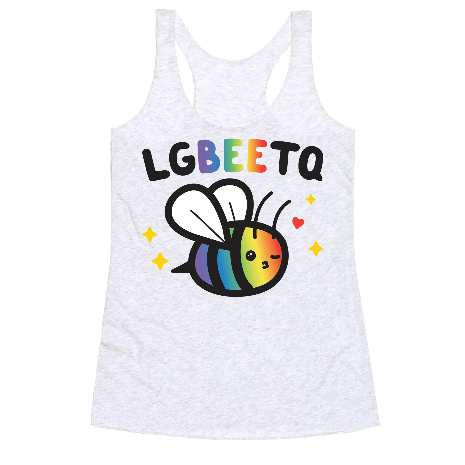 Buzz buzz and LG-Bee-TQ cutie coming through! Buzz with pride with this cute, "LG-Bee-TQ" bee pun design. Perfect for being LGBTQ, bee humor, and adorable pride puns.Our super comfortable Women’s Raw Edge Racerback features a soft tri-blend, unhemmed fabric, with a fashionable bell-like shape for the bottom. Preshrunk for your convenience! Printed in the USA. Made with 50% Polyester 25% Ring Spun Cotton, and 25% Rayon.