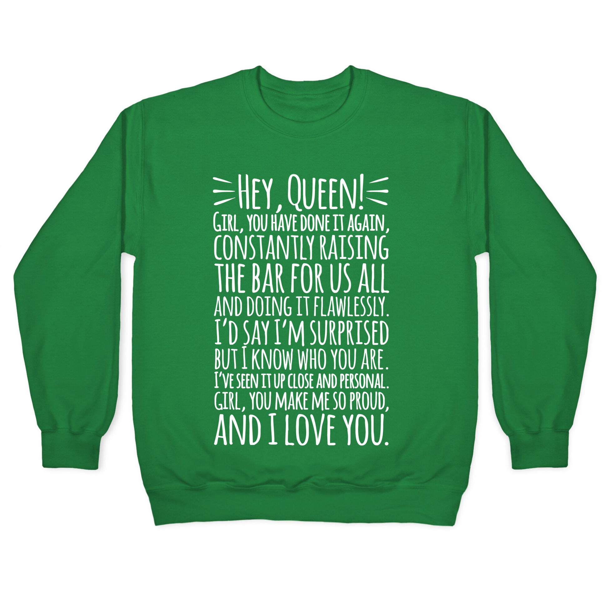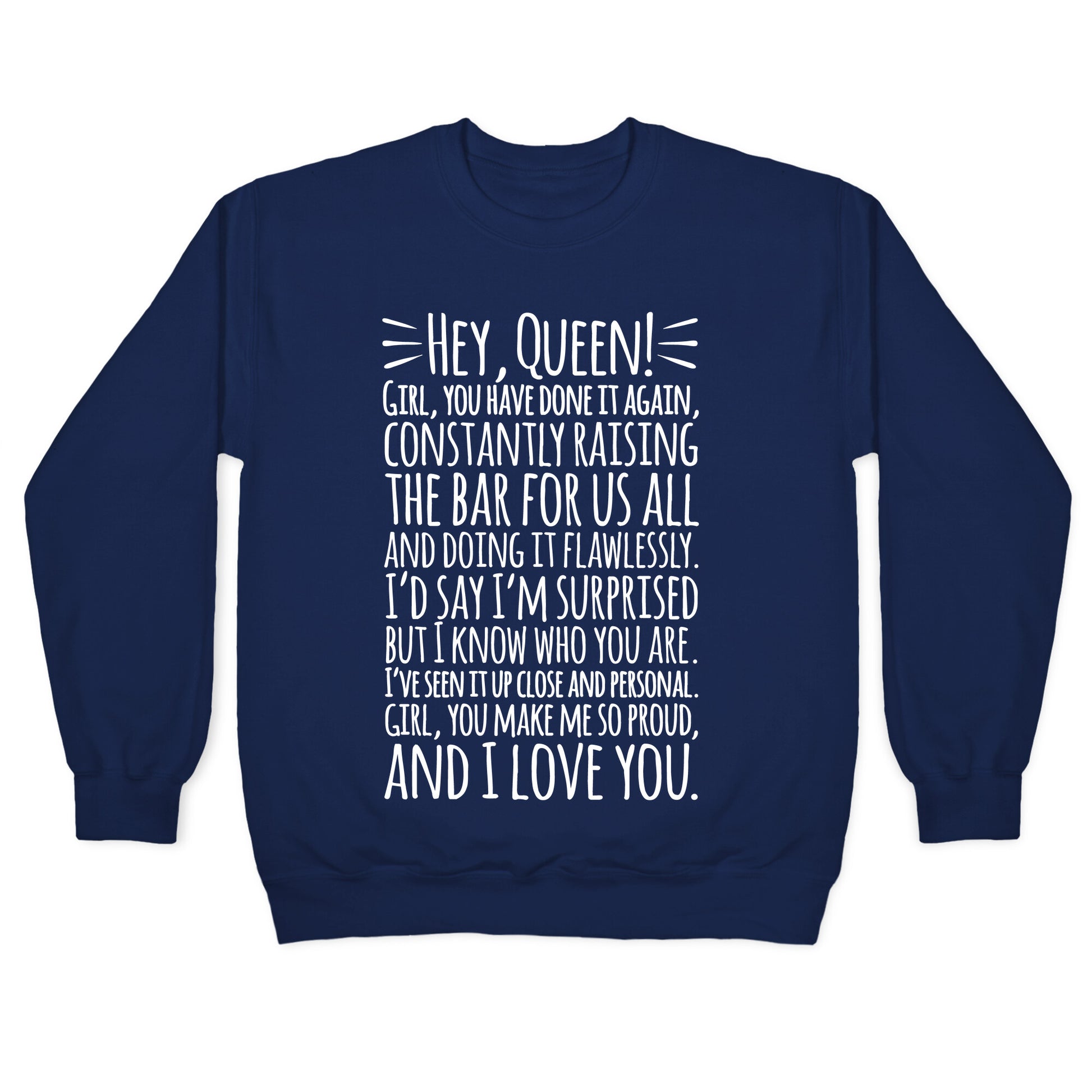 "Hey Queen! Girl, You have done it again, constantly raising the bar for us all, and doing it flawlessly. I'd say I'm surprised but I know who you are. I've seen it up close and personal. Girl, you make me so proud, and I love you." Anytime you need a boost of confidence, throw on this inspirational Michelle Obama quote shirt look in the mirror and slay queen!Our Unisex Crewneck Sweatshirt is made from a soft 8-ounce fabric, and they feature a crew neck, with sleeve and bottom hems for durability. Great for layering. Preshrunk for your convenience! Printed in the USA. Made with 50% Cotton and 50% Polyester.