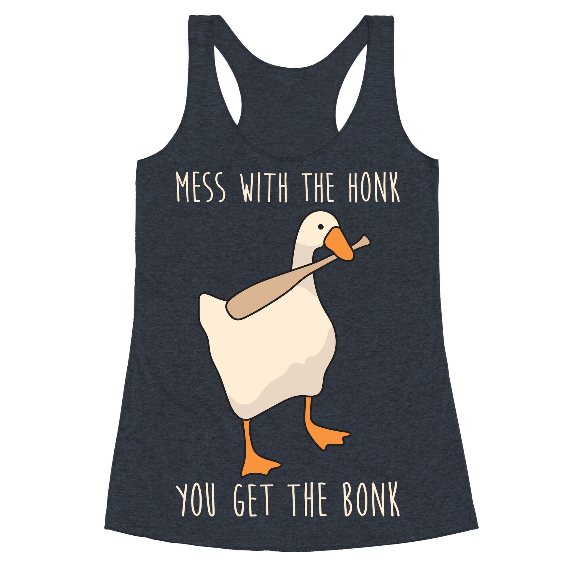 I've got my bat and I'm ready to attack! Be left alone with this, "Mess With The Honk You Get The Bonk" funny goose design with a goose holding a bat illustration. Perfect for being a rude goose, sassy animals, and not being messed with!Our super comfortable Women’s Raw Edge Racerback features a soft tri-blend, unhemmed fabric, with a fashionable bell-like shape for the bottom. Preshrunk for your convenience! Printed in the USA. Made with 50% Polyester 25% Ring Spun Cotton, and 25% Rayon.