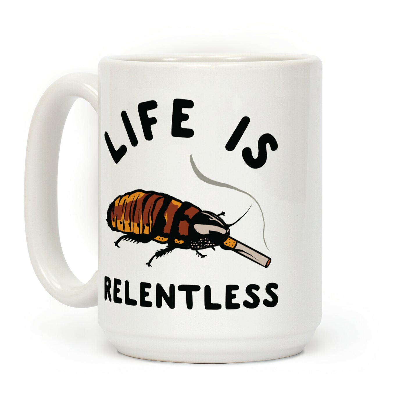 Life is Relentless. It just keeps happening. Let everyone know life's got ya down with this strange illustration of a cockroach smoking a cigaret. Our Mug features large handles for easy gripping and a wrap-around print. These heavy-duty Mugs are both dishwasher and microwave safe. Printed in the USA