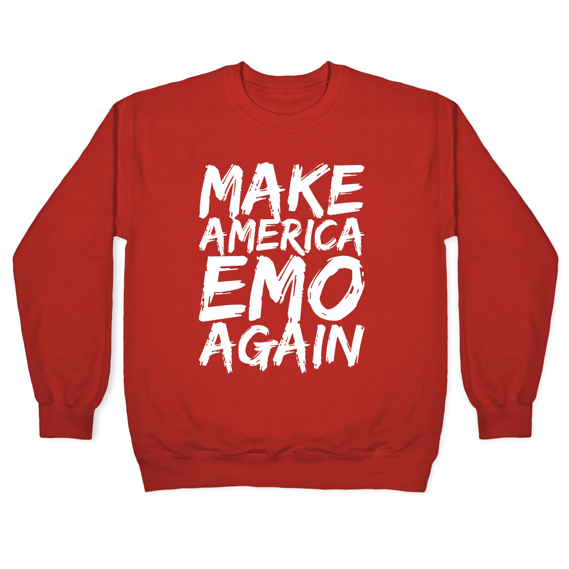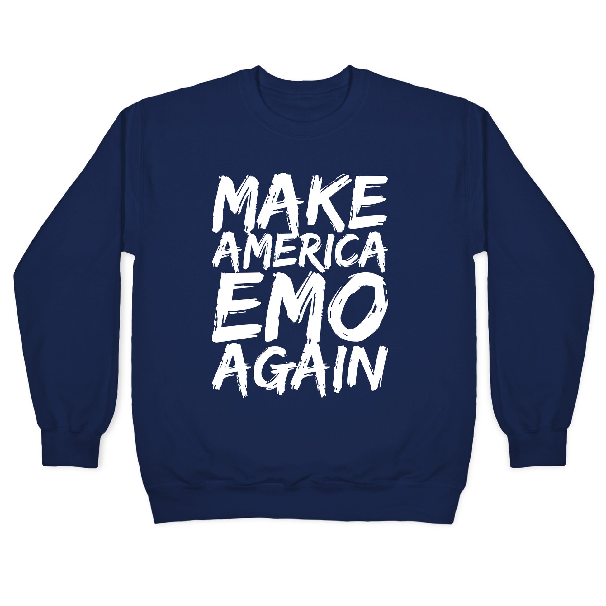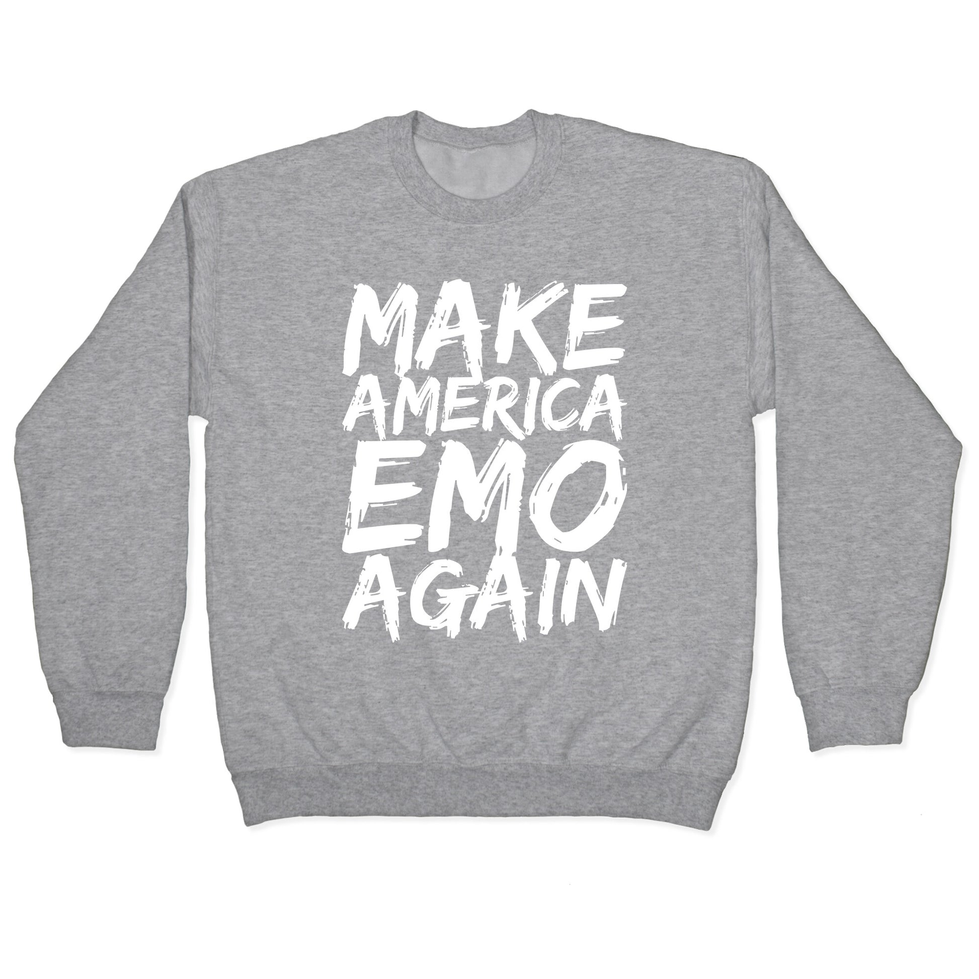 Step off the beaten path of mundane political slogans and embrace your inner emo kid with the "Make America Emo Again" tee. This design pays homage to the days when My Chemical Romance ruled the charts and eyeliner was a rite of passage. Display your love for black everything and skinny jeans with this stylish and humorous statement piece. Whether you're attending an emo night or just reliving the glory days of Warped Tour, this tee is the perfect choice. The vintage-inspired font and bold print make a statement without being too in-your-face. You'll feel like the coolest kid at the concert in this inventive and nostalgic design. So let's bring back the good old days of emo, and show the world that there's more to life than just politics. Make America Emo Again with this must-have tee.Our Unisex Crewneck Sweatshirt is made from a soft 8-ounce fabric, and they feature a crew neck, with sleeve and bottom hems for durability. Great for layering. Preshrunk for your convenience! Printed in the USA. Made with 50% Cotton and 50% Polyester.