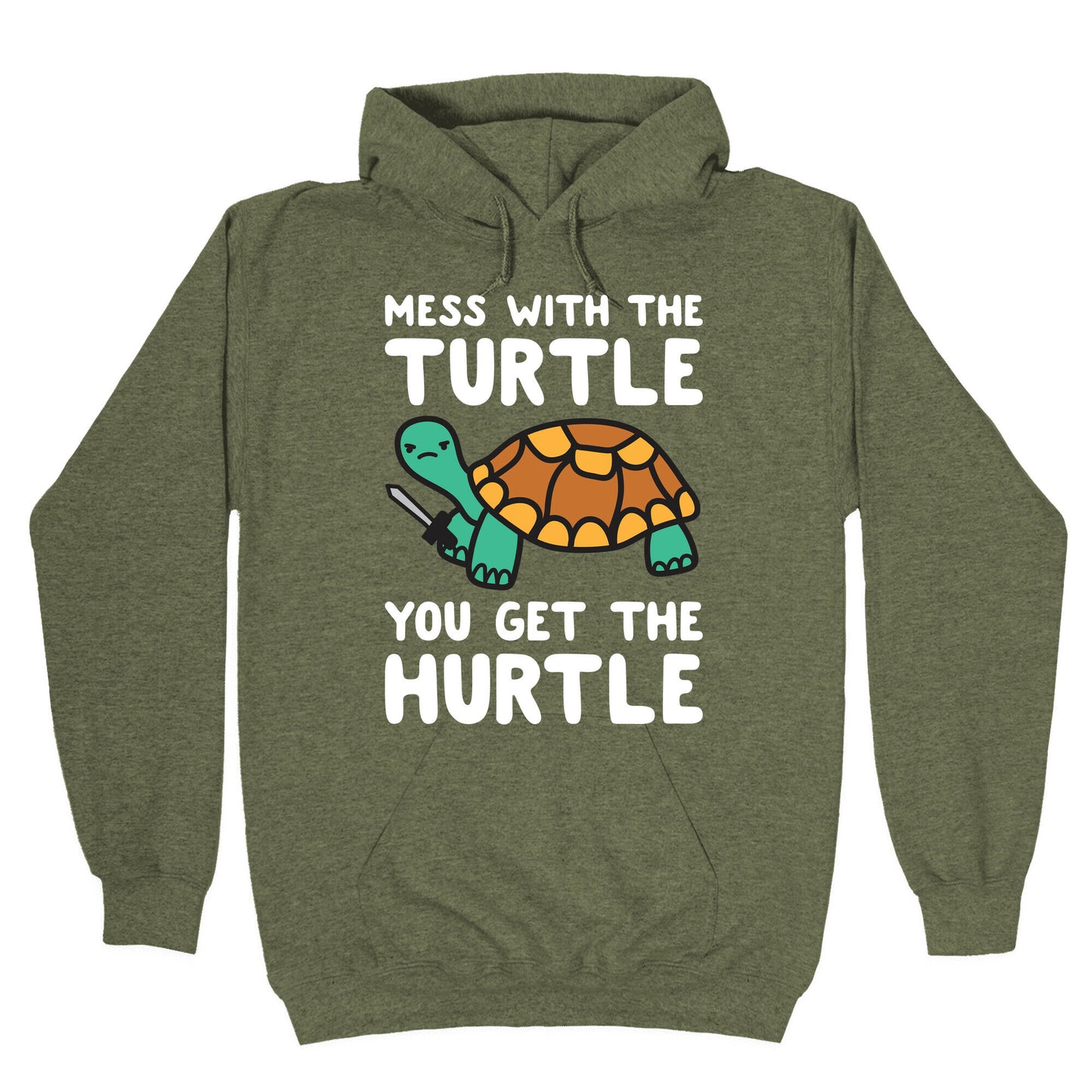 Are you tired of people messing with you? Well, now you have a secret weapon on your side - a turtle with a sword! Show off your love for turtles and don't take crap from anyone with this "Mess With The Turtle You Get The Hurtle" tee. Not only will it make a great conversation starter, but it's also perfect for those days when you just want to be left alone. Plus, who doesn't love a good animal pun? Save the turtles and make a statement at the same time with this sassy turtle design. Whether you're a turtle enthusiast or just love a good witty t-shirt, this design is for you. So go ahead, add it to your cart and show the world you mean business (and love turtles). Our Unisex Pullover Hoodie is made from a soft 8-ounce fabric They feature a drawstring hood and front kangaroo pocket. Great for layering! Preshrunk for your convenience! Printed in the USA. Made with 50% Cotton and 50% Polyester.