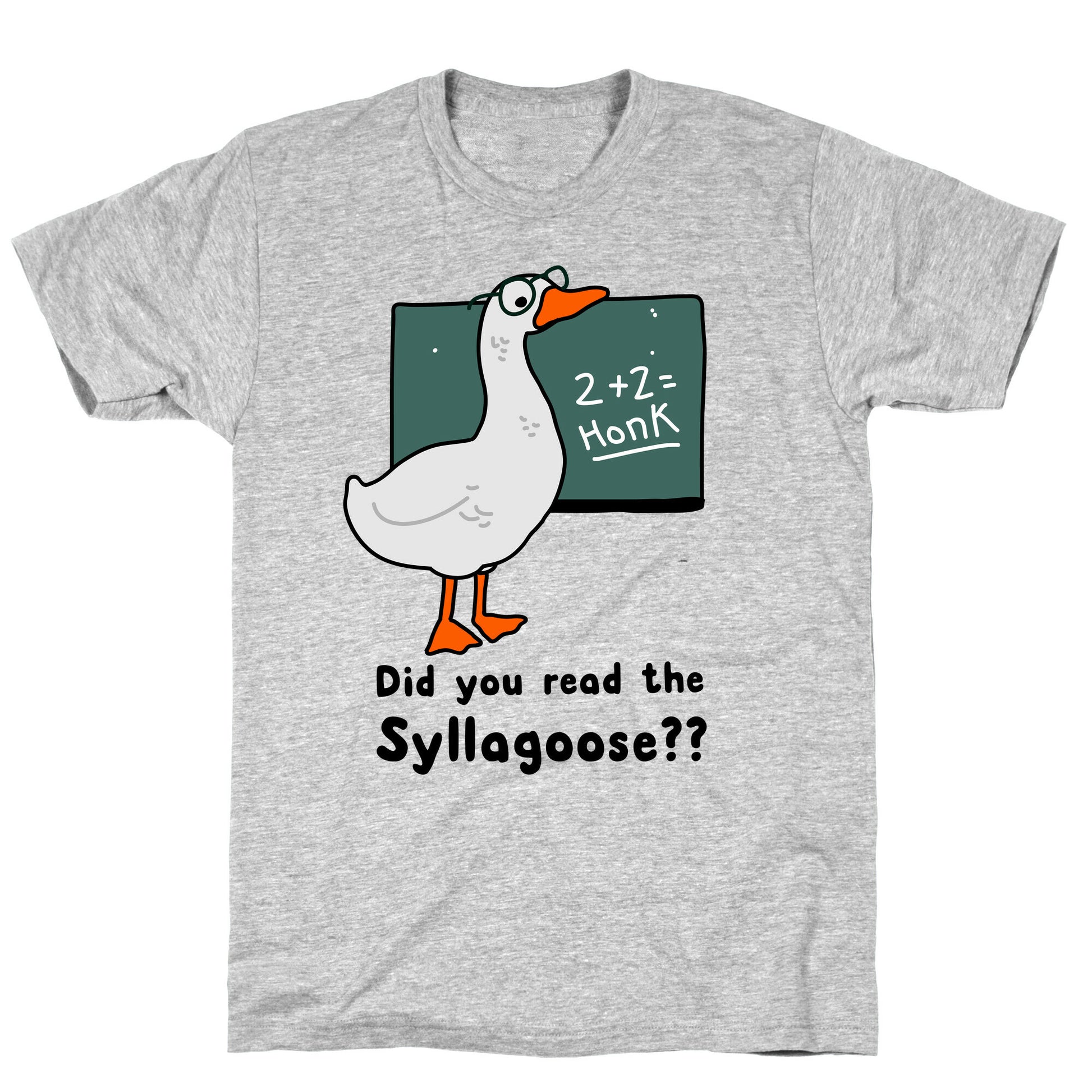 Before you ask any questions regarding todays lesson plan, did you read the syllagoose? Cause some chaos for your students with this funny goose pun! Our fitted Unisex Cotton tee is made from an exceedingly soft 100% ring spun cotton. It features a crew neckline with hemmed sleeves and bottom for durability. Preshrunk for your convenience! Printed in the USA. Made with 100% Ring Spun Cotton. Athletic Gray is made up of 90% cotton and 10% polyester. Other heathered colors are made of 52% cotton and 48% polyester.