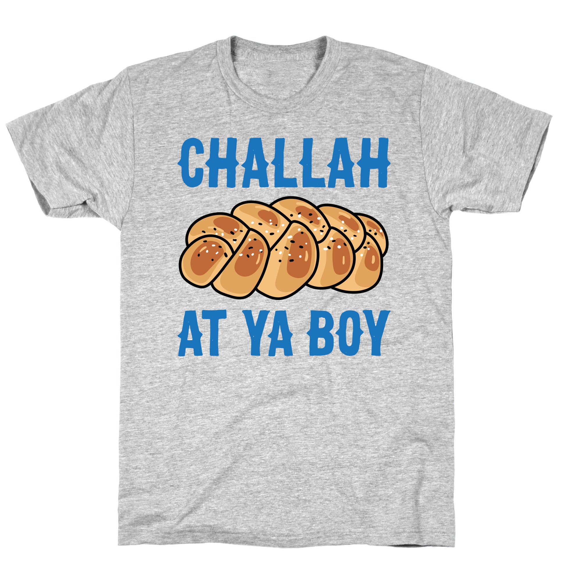 You know what it is, it's Hanukkah so Challah At Ya Boy! Celebrate the Jewish holiday with this funny challah parody, Hanukkah pun design! Our fitted Unisex Cotton tee is made from an exceedingly soft 100% ring spun cotton. It features a crew neckline with hemmed sleeves and bottom for durability. Preshrunk for your convenience! Printed in the USA. Made with 100% Ring Spun Cotton. Athletic Gray is made up of 90% cotton and 10% polyester. Other heathered colors are made of 52% cotton and 48% polyester.