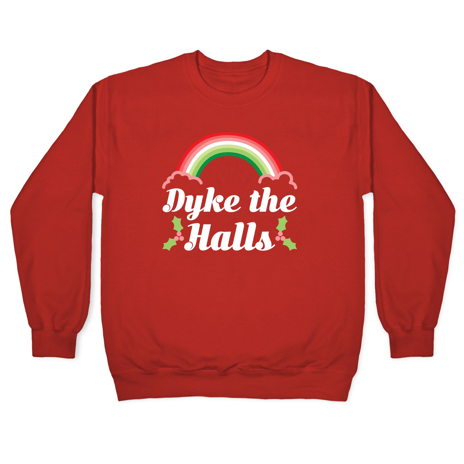 Fa la la la lesbian! Show off your sexuality this Christmas with pride in who you are with this, "Dyke the Halls" lesbian Christmas design. Perfect for holiday parties, girlfriend gifts, and for having big dyke and deck the halls energy.Our Unisex Crewneck Sweatshirt is made from a soft 8-ounce fabric, and they feature a crew neck, with sleeve and bottom hems for durability. Great for layering. Preshrunk for your convenience! Printed in the USA. Made with 50% Cotton and 50% Polyester.