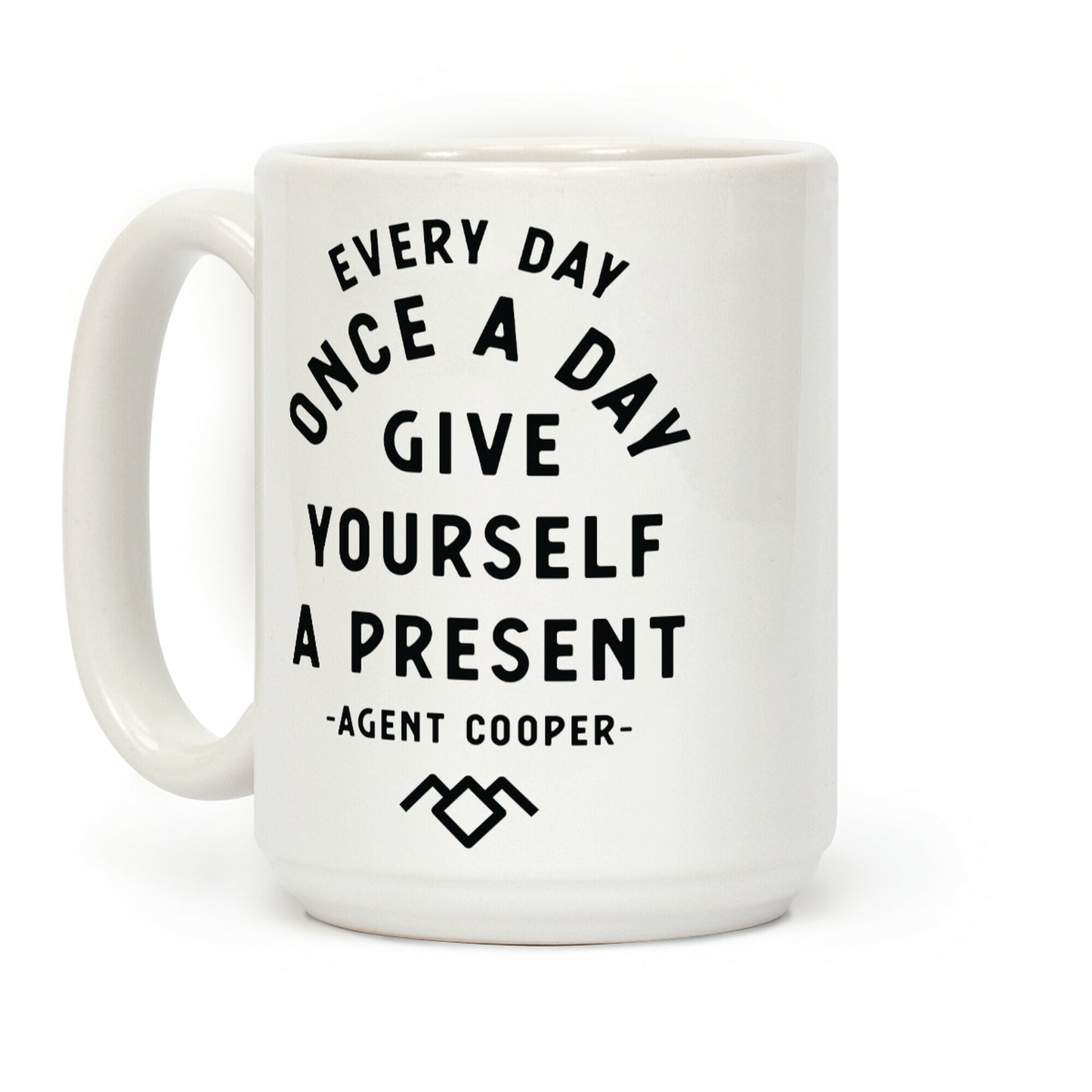 Every day, once a day, give yourself a present. Show that Agent Cooper's wisdoms are words to live by with this inspirational quote and twin peaks inspired design. Our Mug features large handles for easy gripping and a wrap-around print. These heavy-duty Mugs are both dishwasher and microwave safe. Printed in the USA