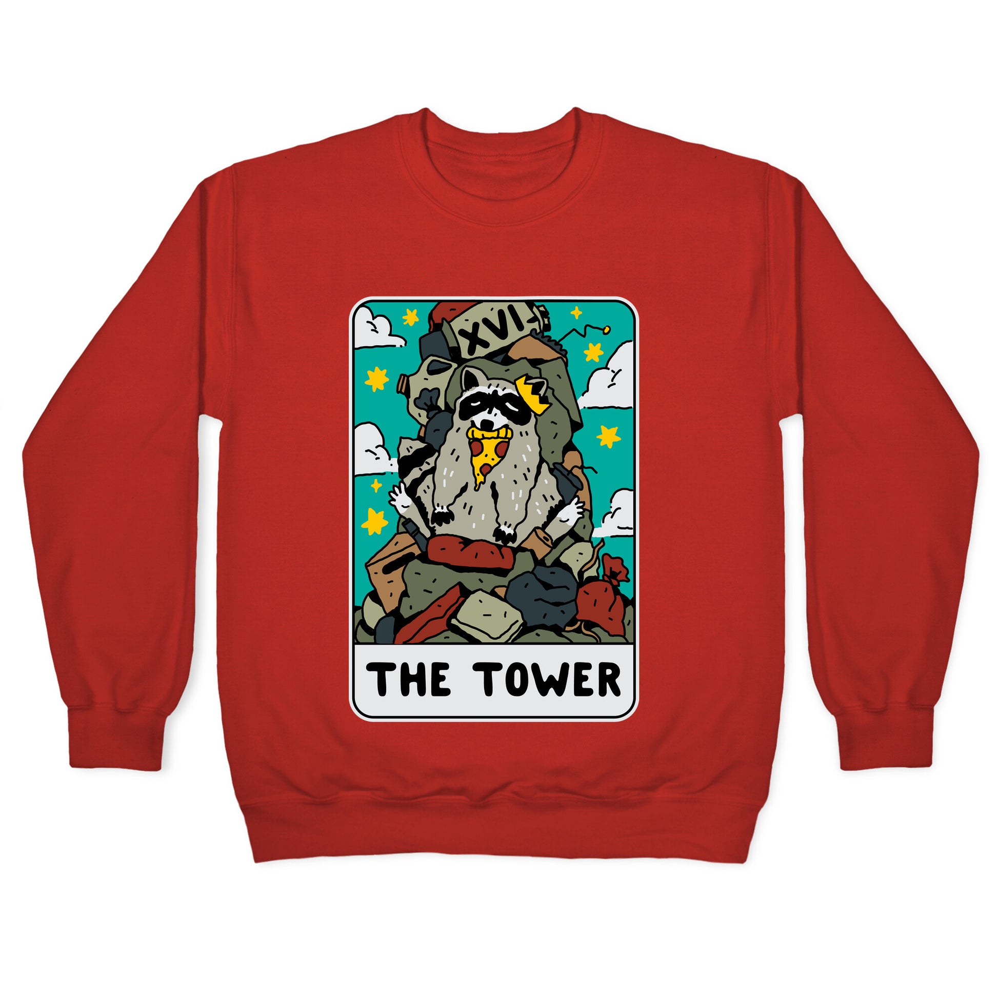 Ah yes. The Tower- of garbage. This card often represents trash pandas, or sometimes is a sign of a hot mess about to happen. Sit pretty on your mound of responsibilities and accept the inevitability of everything toppling over eventually with this funny & cute take on the Tower, featuring a raccoon eatin' some pizza.Our Unisex Crewneck Sweatshirt is made from a soft 8-ounce fabric, and they feature a crew neck, with sleeve and bottom hems for durability. Great for layering. Preshrunk for your convenience! Printed in the USA. Made with 50% Cotton and 50% Polyester.