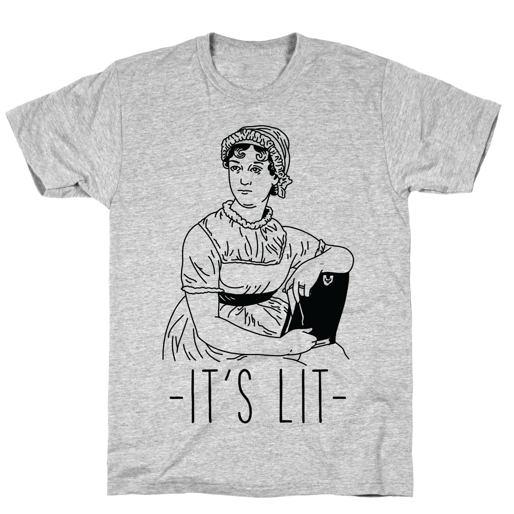 It's Lit. Show your love for classical literature with this Jane Austen inspired design. Our fitted Unisex Cotton tee is made from an exceedingly soft 100% ring spun cotton. It features a crew neckline with hemmed sleeves and bottom for durability. Preshrunk for your convenience! Printed in the USA. Made with 100% Ring Spun Cotton. Athletic Gray is made up of 90% cotton and 10% polyester. Other heathered colors are made of 52% cotton and 48% polyester.