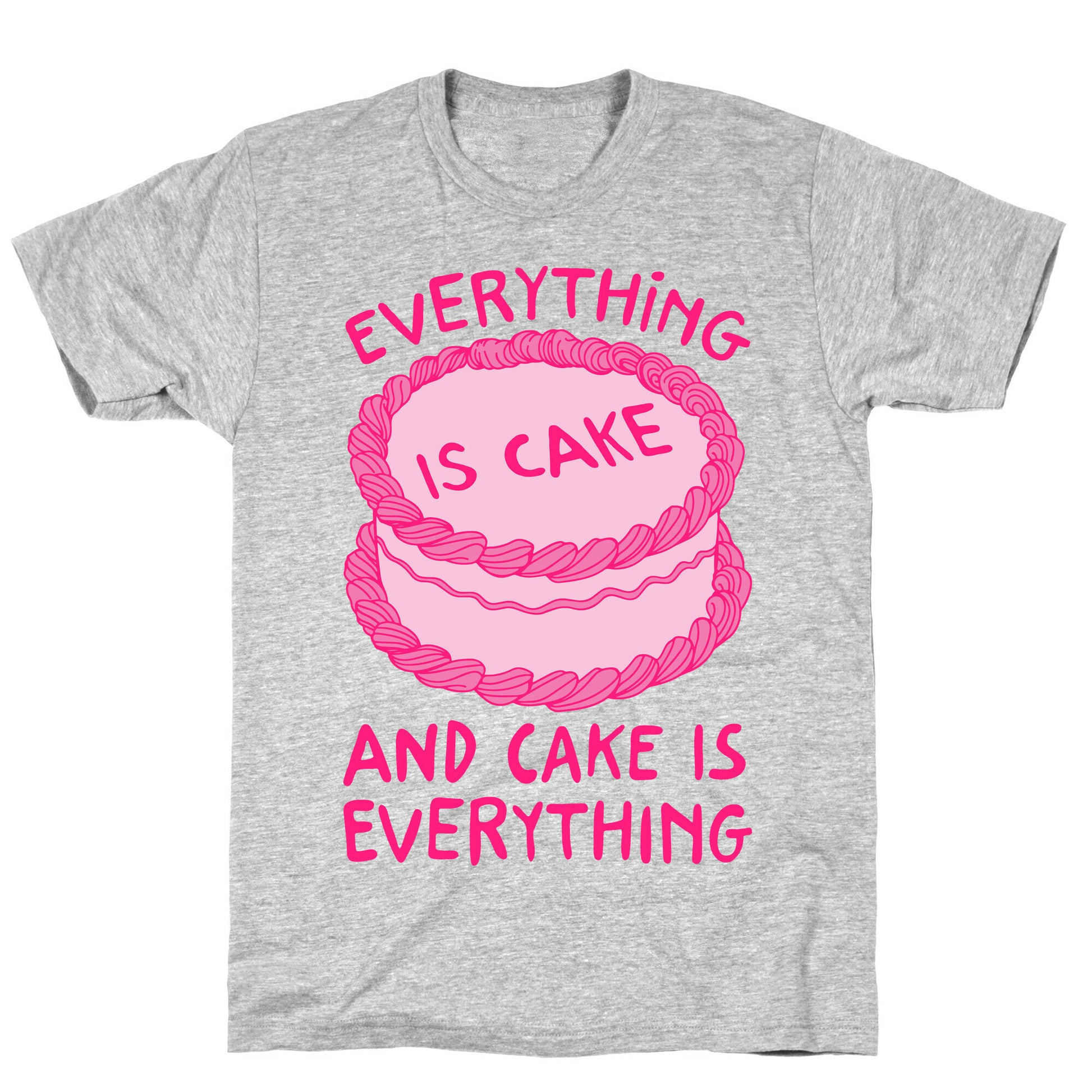 Everything is cake, and cake is everything. Is it cake? Probably! Show off your love for cake, cakes, cake memes and memes in general with this funny, everything is cake shirt! Our fitted Unisex Cotton tee is made from an exceedingly soft 100% ring spun cotton. It features a crew neckline with hemmed sleeves and bottom for durability. Preshrunk for your convenience! Printed in the USA. Made with 100% Ring Spun Cotton. Athletic Gray is made up of 90% cotton and 10% polyester. Other heathered colors are made of 52% cotton and 48% polyester.