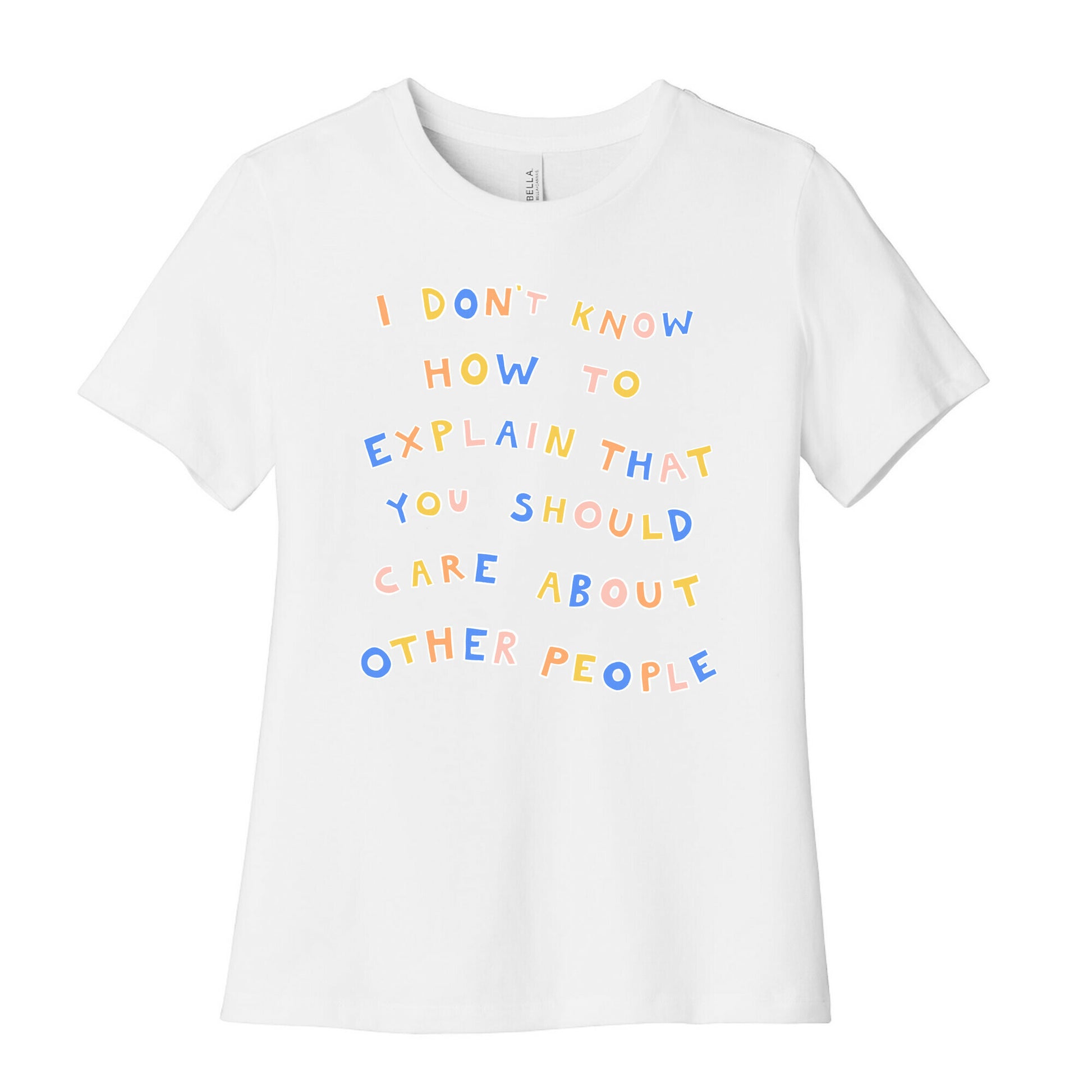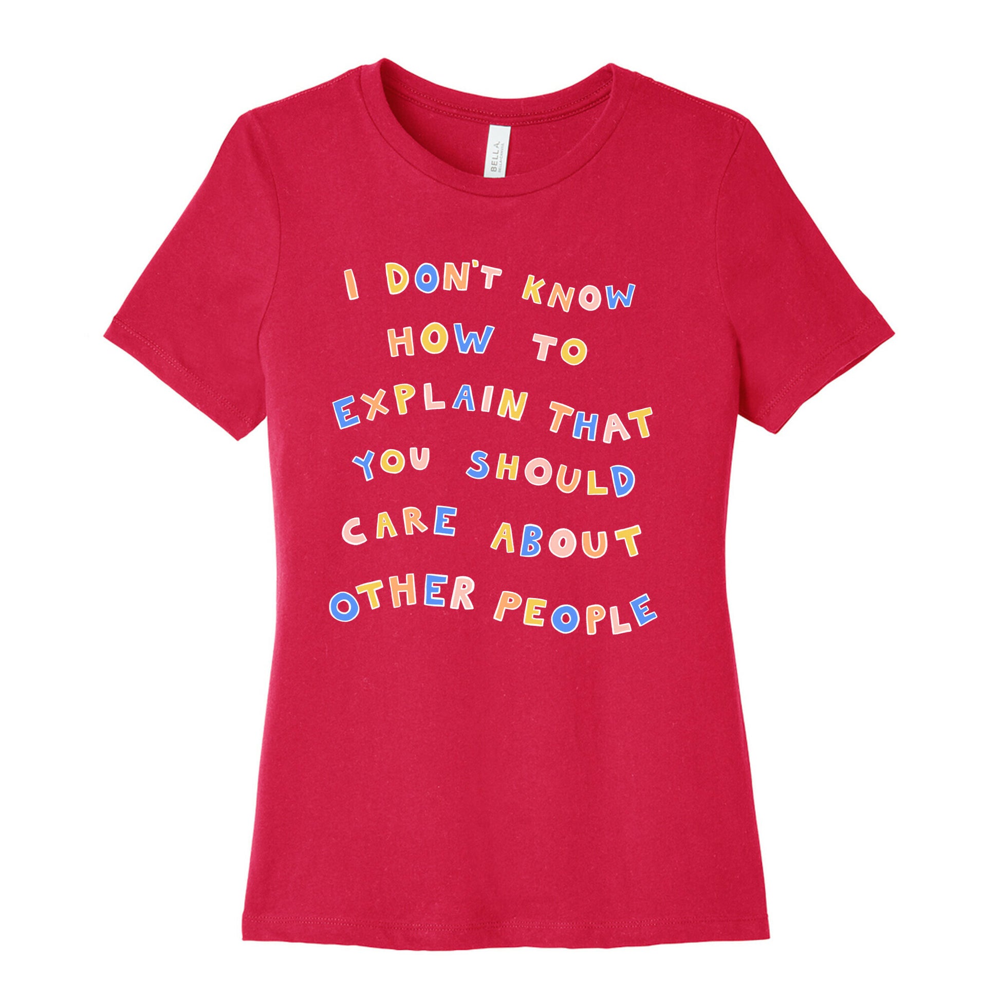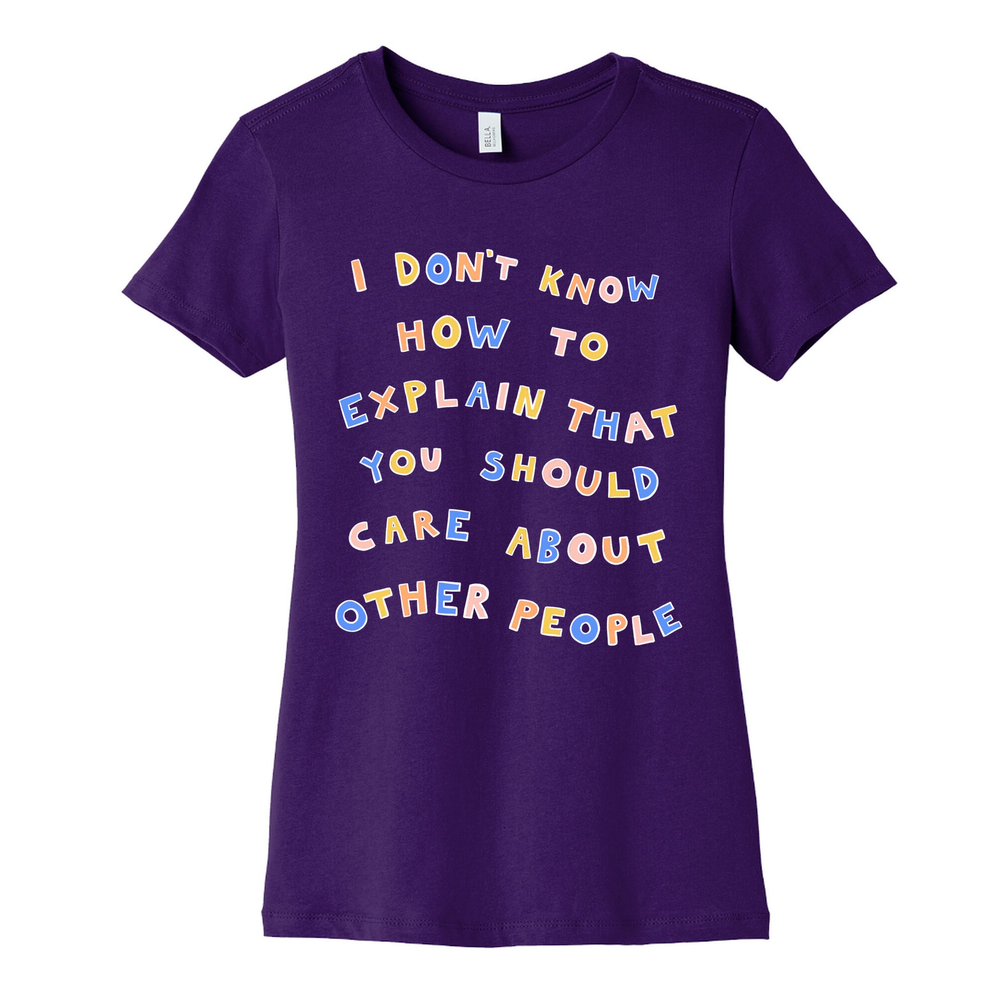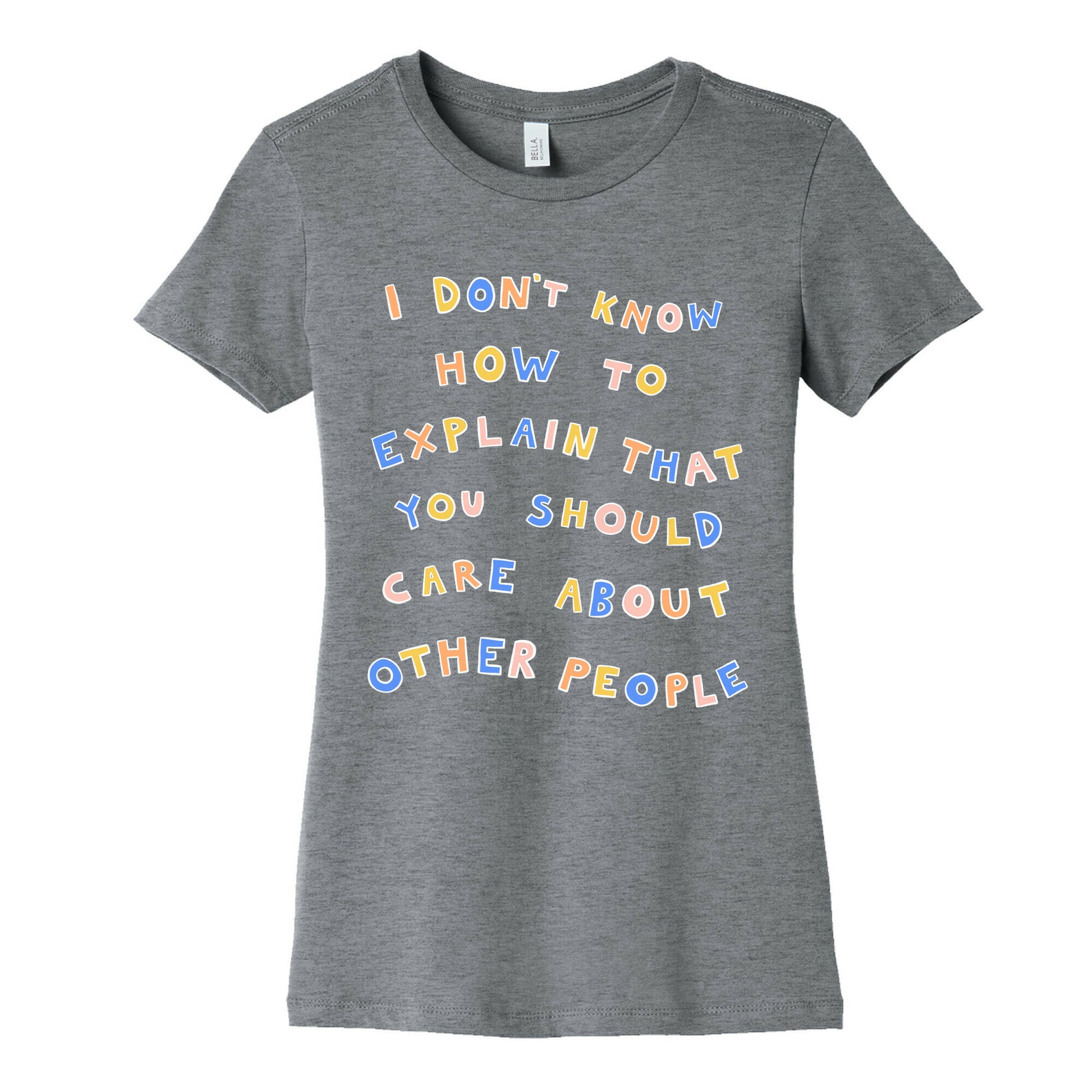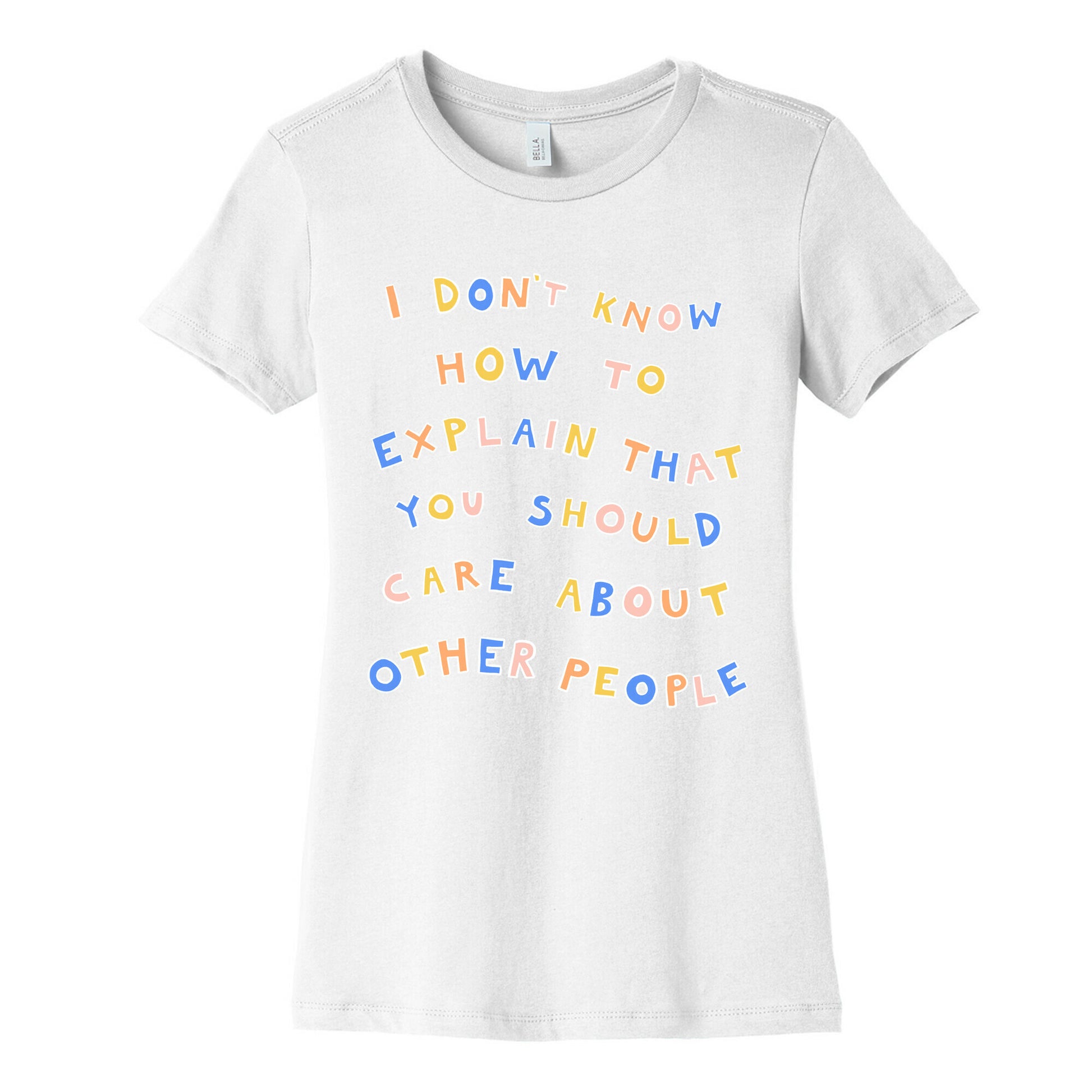 I really don't! Show that you're wanting the world to be a more compassionate and understanding place with this, "I Don't Know How To Explain That You Should Care About Other People" lettering design, inspired by the article headline in Huffpost.Our slim fit Women’s Cotton Tees, are made with exceedingly soft 100% cotton. They feature a relaxed neckline, and the sleeves and bottom, are hemmed for durability. Preshrunk for your convenience! Printed in the USA. Made with 100% Cotton. Colors such as gray, is made up of 90% cotton and 10% polyester, and deep pink is made up of 50% cotton and 50% polyester.