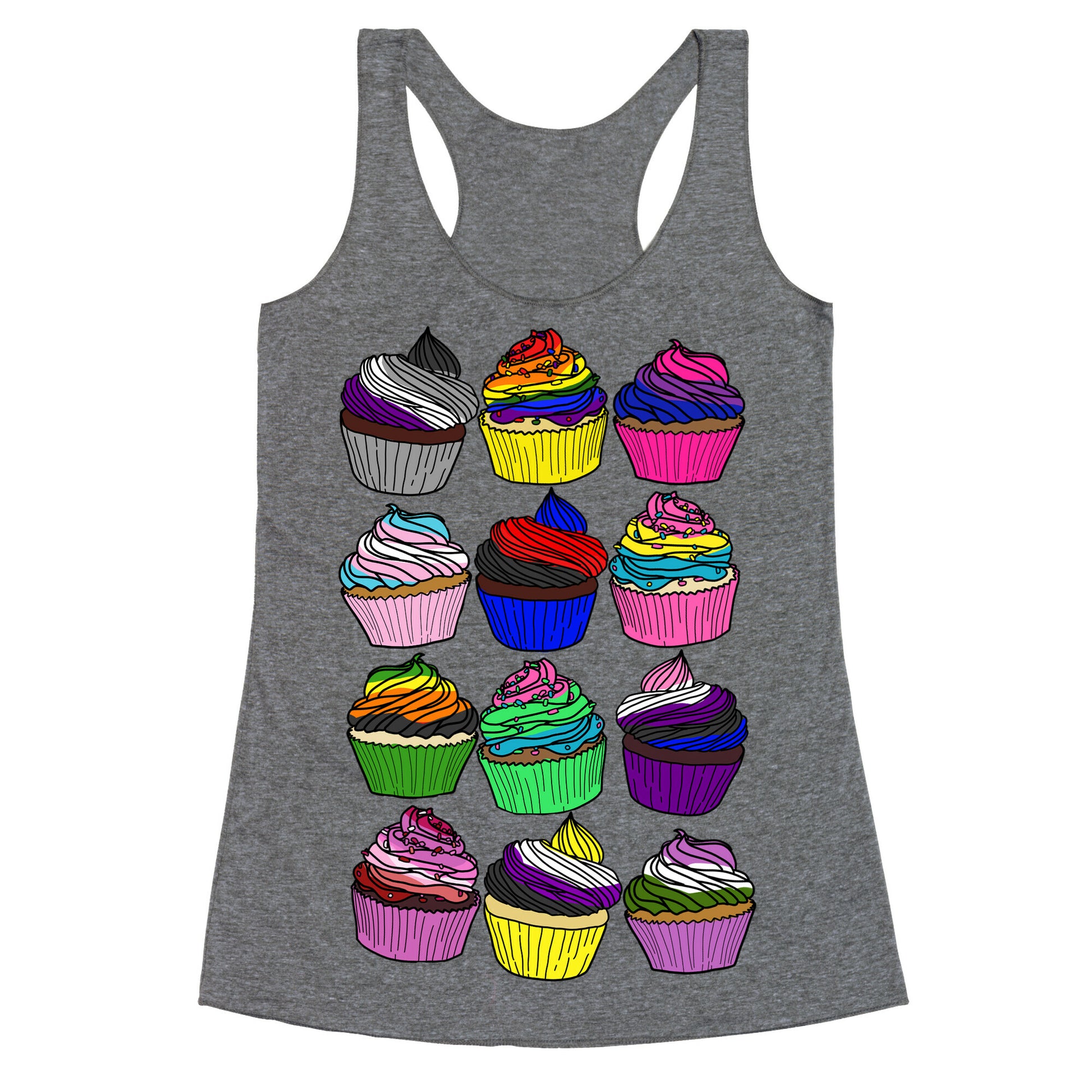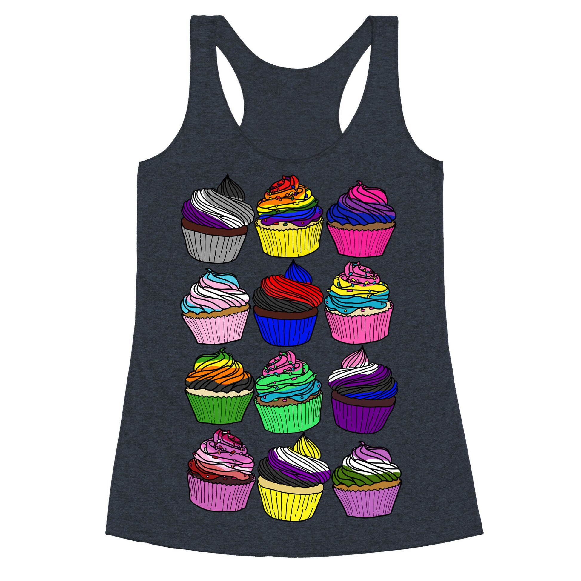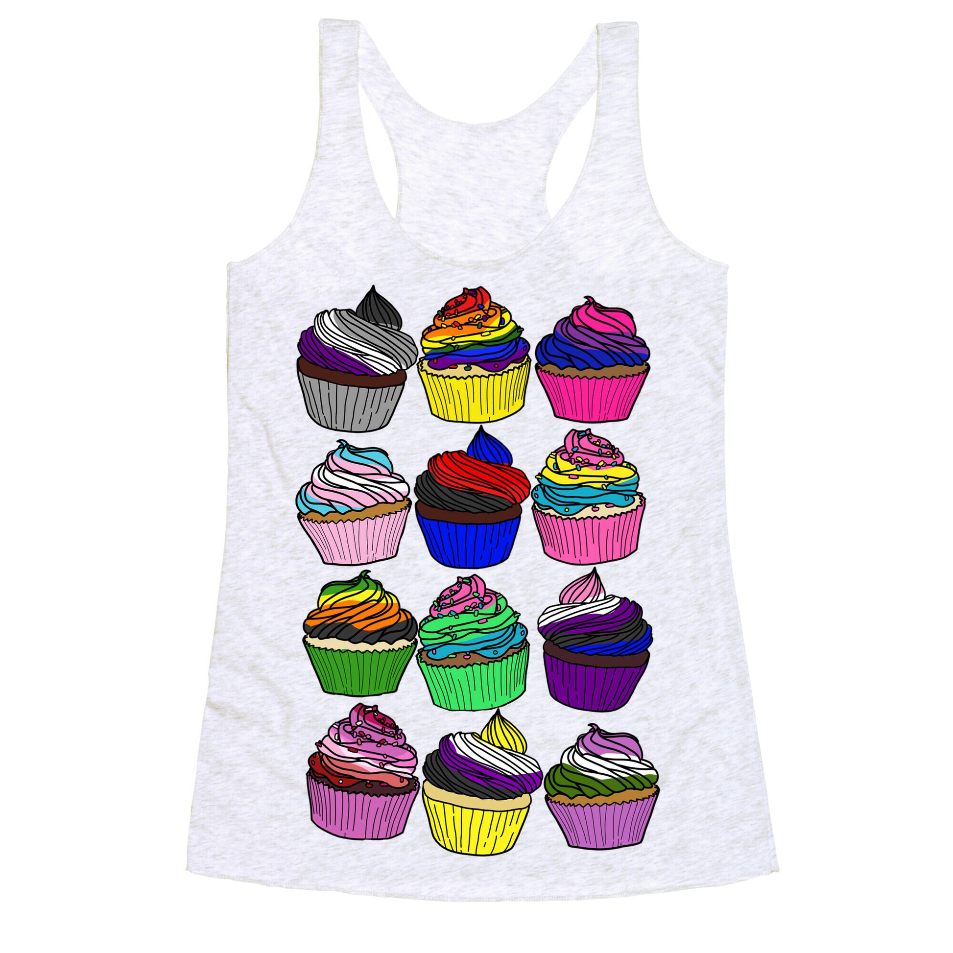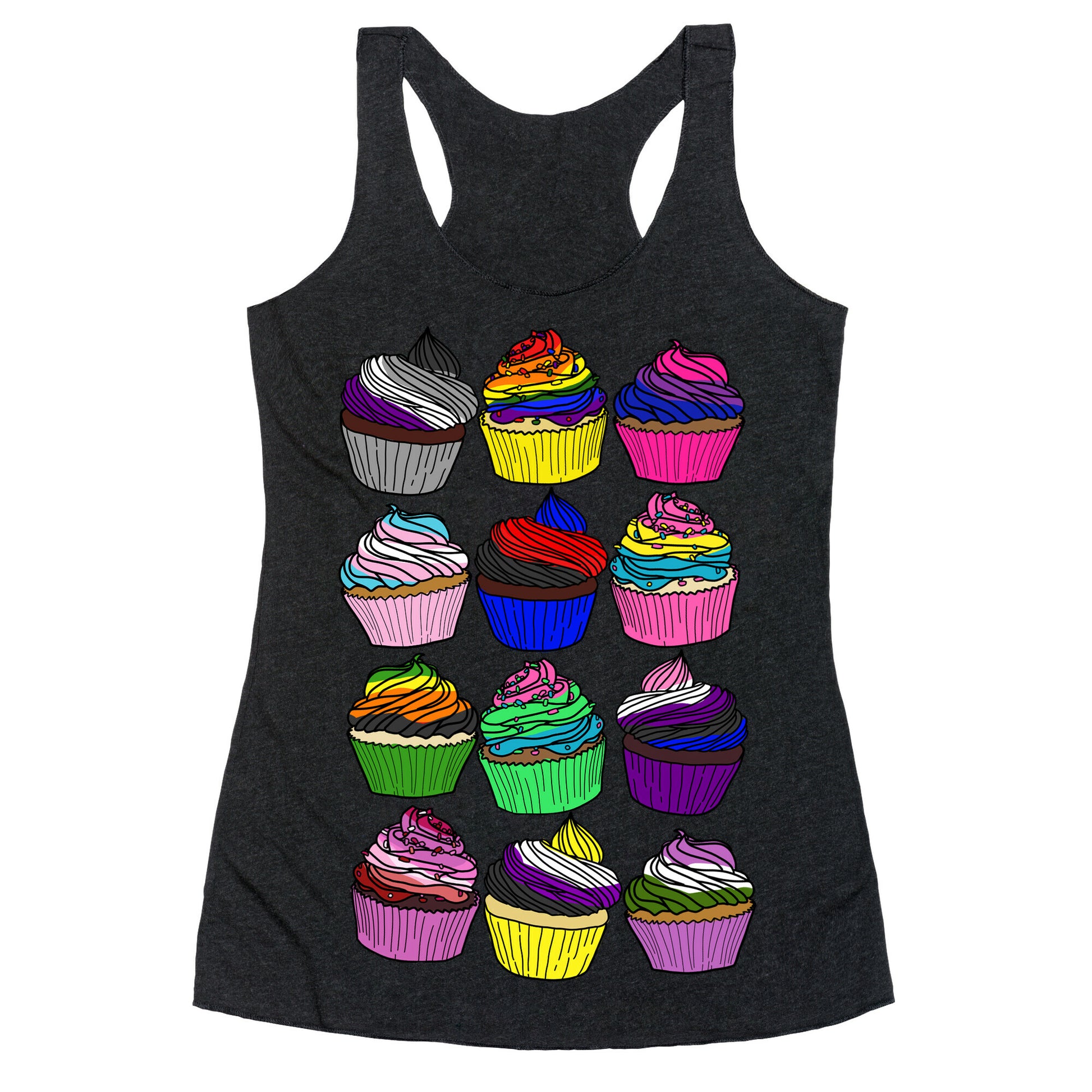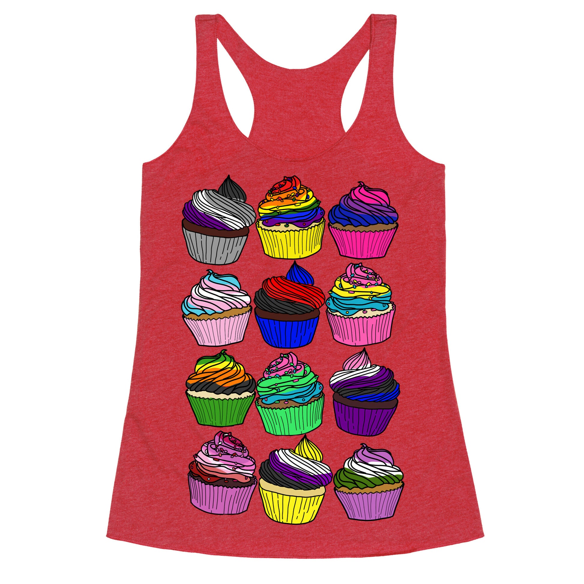 Yum! Check out these cupcakes, each one with the group's pride colors to make up the frosting (or sprinkles)! Because how sweet is it being queer?! Show off your pride with these cute cartoon cupcakes!Our super comfortable Women’s Raw Edge Racerback features a soft tri-blend, unhemmed fabric, with a fashionable bell-like shape for the bottom. Preshrunk for your convenience! Printed in the USA. Made with 50% Polyester 25% Ring Spun Cotton, and 25% Rayon.
