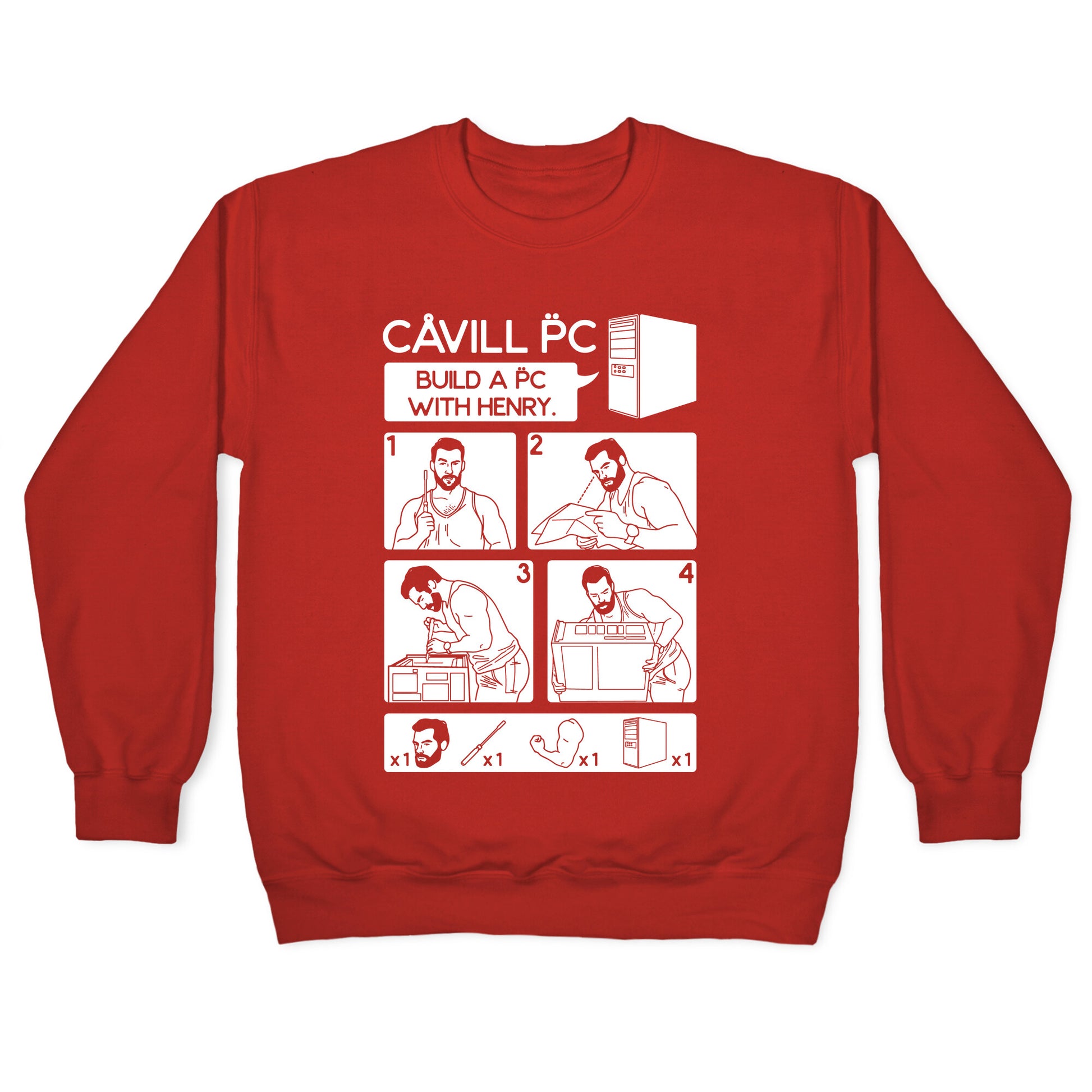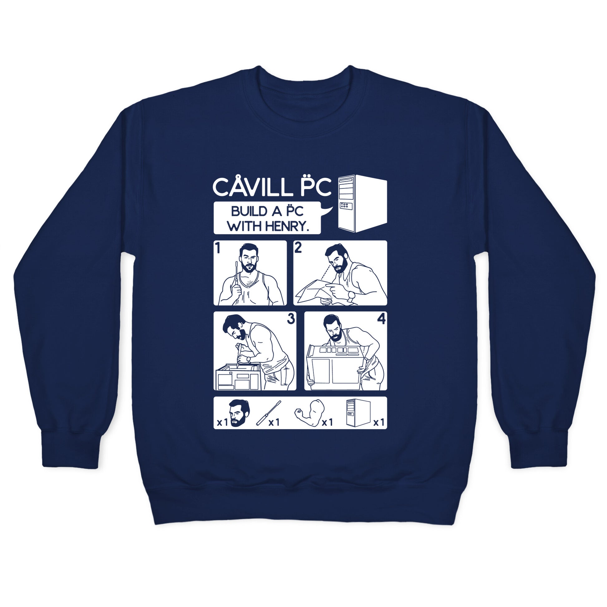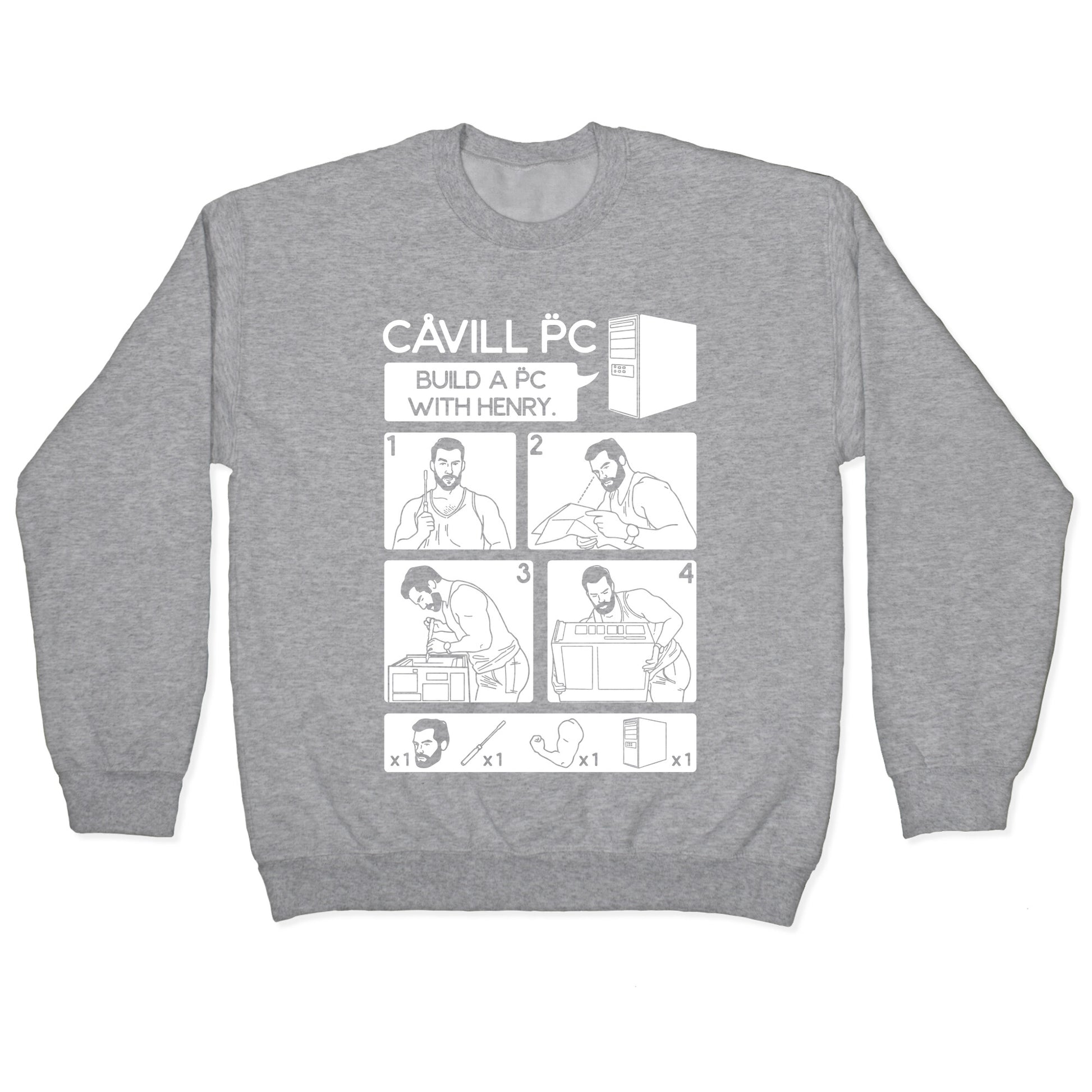 Learn how to assemble your PC with Henry Cavill! Build a PC with Henry with this IKEA instruction inspired shirt design.Our Unisex Crewneck Sweatshirt is made from a soft 8-ounce fabric, and they feature a crew neck, with sleeve and bottom hems for durability. Great for layering. Preshrunk for your convenience! Printed in the USA. Made with 50% Cotton and 50% Polyester.
