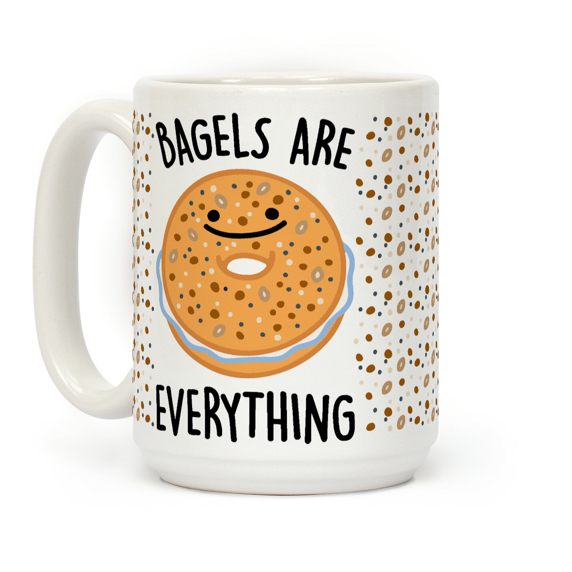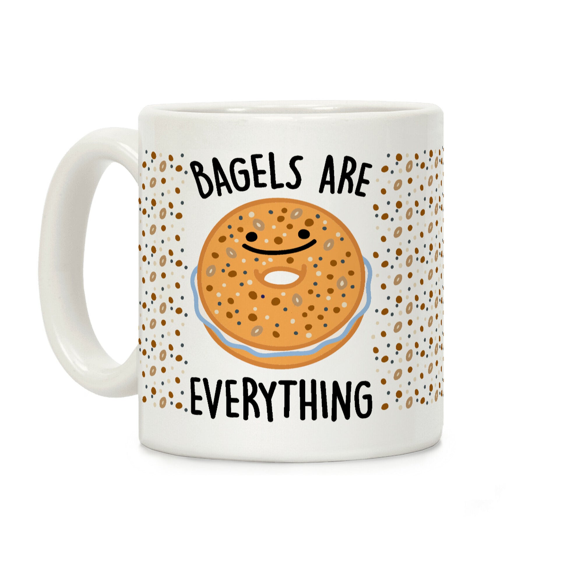 Bagels are everything! Show off your love for everything bagels and all bagels in general! Eat bagels and show off your love for them with this cute, bagel lovers coffee mug! Our Mug features large handles for easy gripping and a wrap-around print. These heavy-duty Mugs are both dishwasher and microwave safe. Printed in the USA.