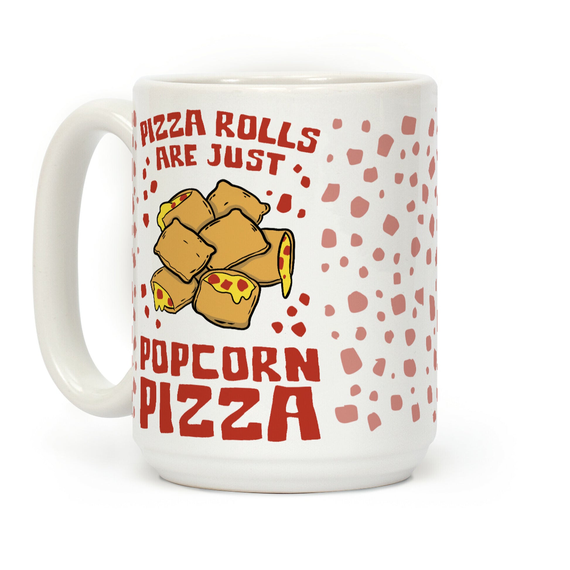 You can't tell me that pizza rolls aren't just pizza popcorn. they have a crunchy outside, are bite sized, and fit perfectly in a bowl or plate. Deliciously perfect for people who are fans of the little pizza pillows! Our Mug features large handles for easy gripping and a wrap-around print. These heavy-duty Mugs are both dishwasher and microwave safe. Printed in the USA