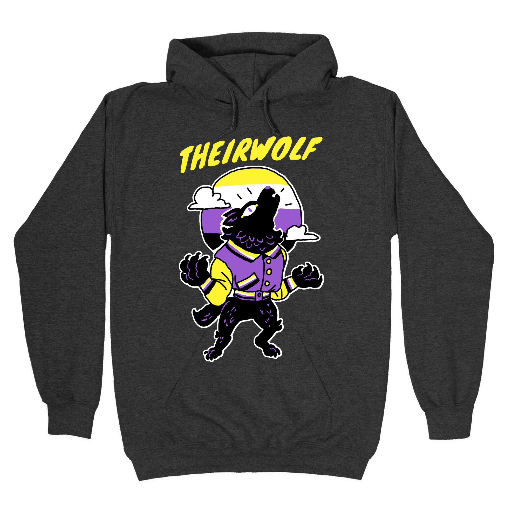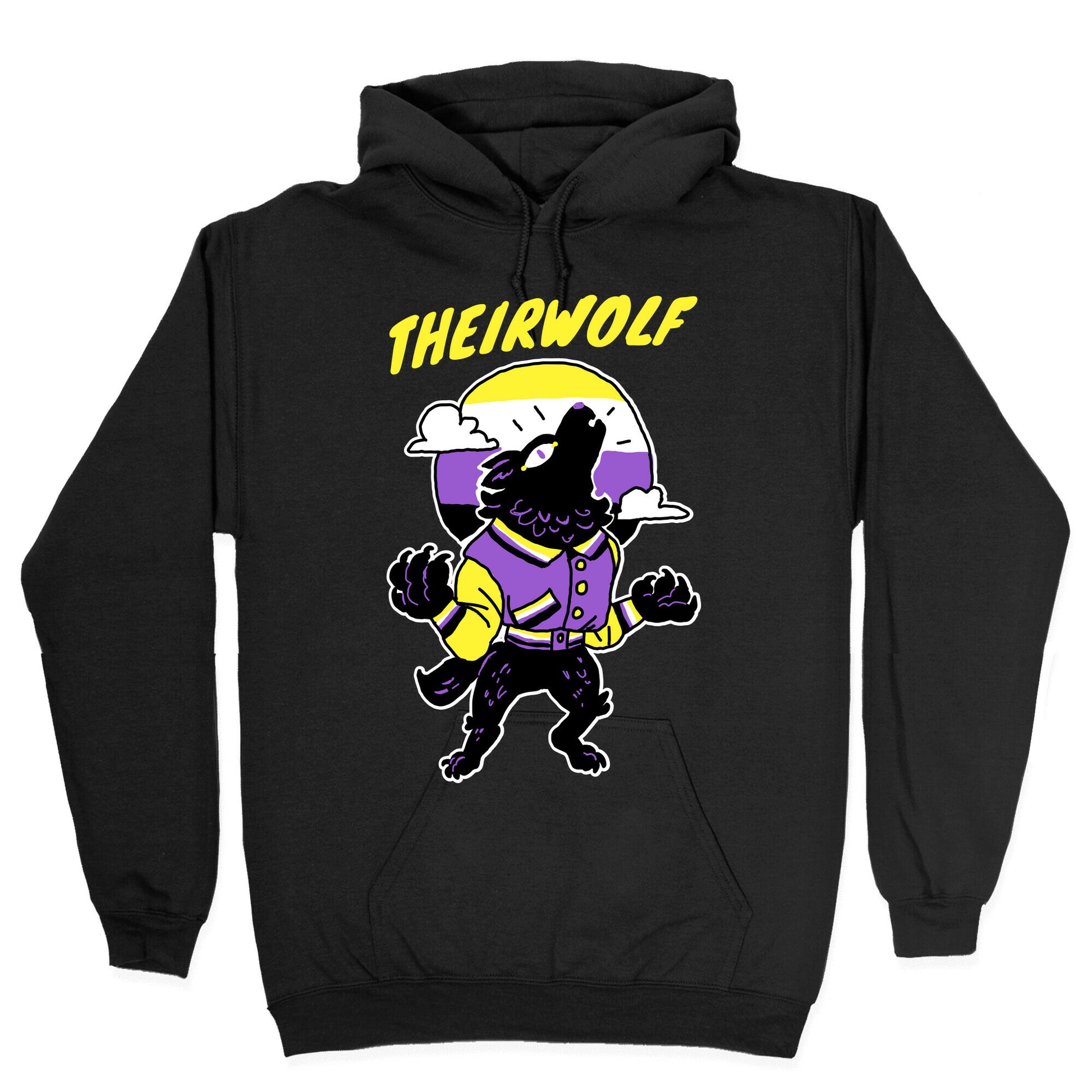 Looking to howl at the moon while making a statement about your pronouns? Look no further than Theirwolf, the perfect pullover for any non-binary werewolf enthusiast. With a clever pun on the classic lycanthrope moniker, this shirt is sure to get laughs and attention from anyone who sees you. Ditch those outdated gender pronouns and let your they/them/their flag fly high with this fun and funky design. Whether you're out under a full moon or in the comfort of your own den, you'll be comfortable and stylish in this soft and cozy pullover. Show the world that youâÃôre a part of the MYSTICALPACK, howling for respect and acceptance. Let your inner werewolf out with Theirwolf pullover and be the talk of the pack beyond the howl. Transform into your most authentic self with this whimsical clothing statement. Our Unisex Pullover Hoodie is made from a soft 8-ounce fabric They feature a drawstring hood and front kangaroo pocket. Great for layering! Preshrunk for your convenience! Printed in the USA. Made with 50% Cotton and 50% Polyester.