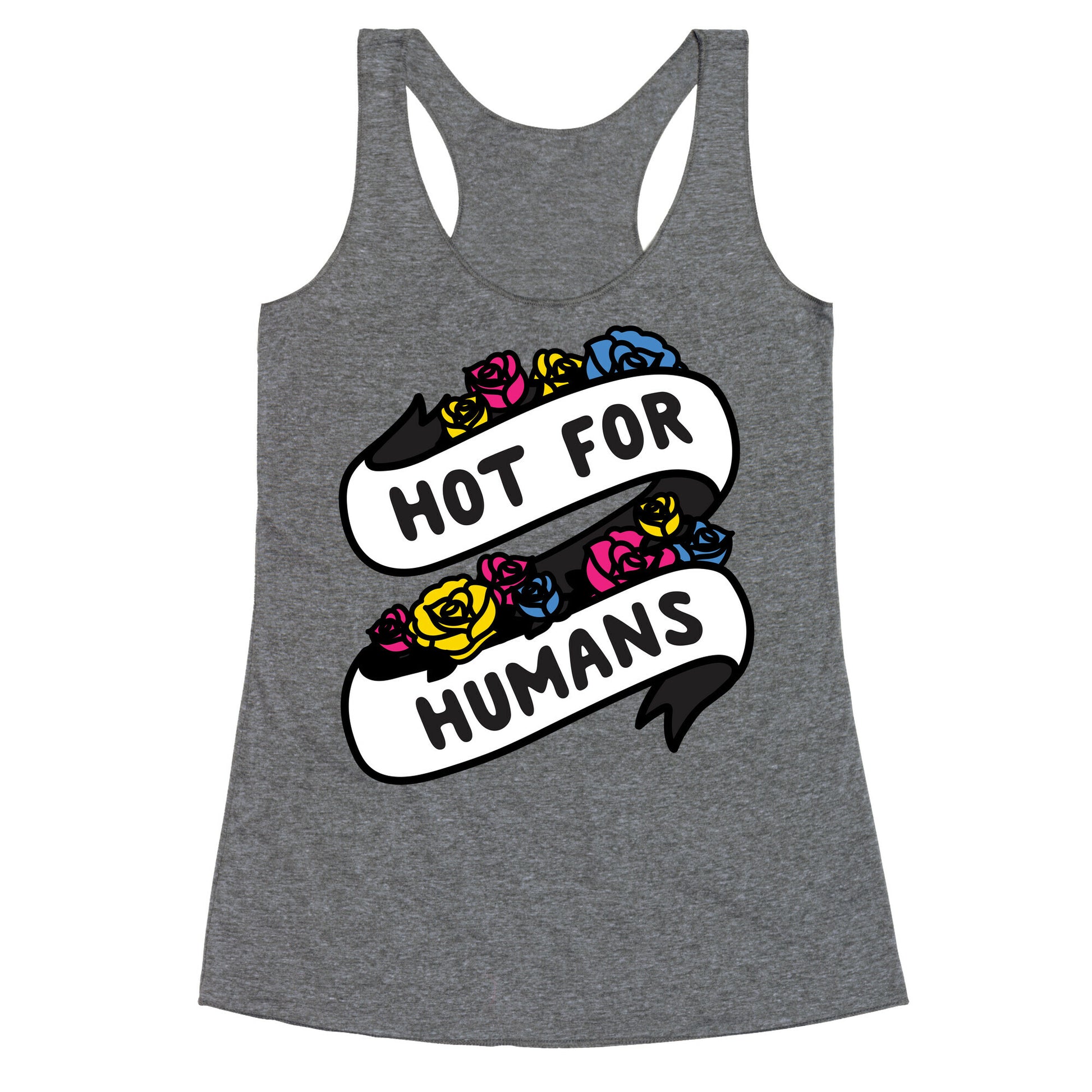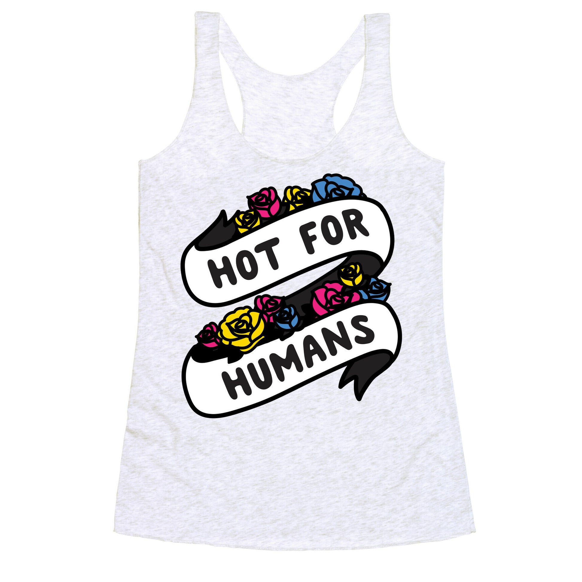 Show the world that gender doesn't matter, you're just hot for humans with this, "Hot For Humans" pansexual ribbon with florals design. Perfect for being pan, LGBTQ pride, and loving hot people regardless of gender!Our super comfortable Women’s Raw Edge Racerback features a soft tri-blend, unhemmed fabric, with a fashionable bell-like shape for the bottom. Preshrunk for your convenience! Printed in the USA. Made with 50% Polyester 25% Ring Spun Cotton, and 25% Rayon.