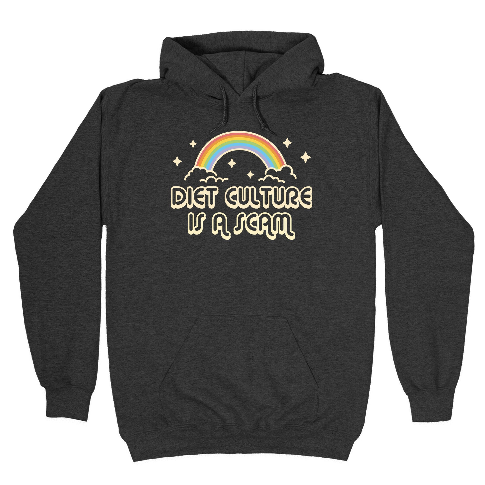 Introducing our bold statement tee, "Diet Culture Is A Scam." Let's face it, the diet industry has been selling us lies for years. It's time we take back control and embrace our bodies for what they are. This tee serves as a reminder to stay body positive and love ourselves exactly as we are. The colorful rainbow and cloud design adds a touch of sass to your outfit while making a powerful statement. Wear it to the gym or pair it with your favorite denim jeans âÃì this versatile tee is perfect for any occasion. Spread the message and stand up against toxic diet culture with our "Diet Culture Is A Scam" tee. Available in a range of sizes, this product is perfect for anyone who's ready to rebel against diet culture and embrace self-love. Our Unisex Pullover Hoodie is made from a soft 8-ounce fabric They feature a drawstring hood and front kangaroo pocket. Great for layering! Preshrunk for your convenience! Printed in the USA. Made with 50% Cotton and 50% Polyester.