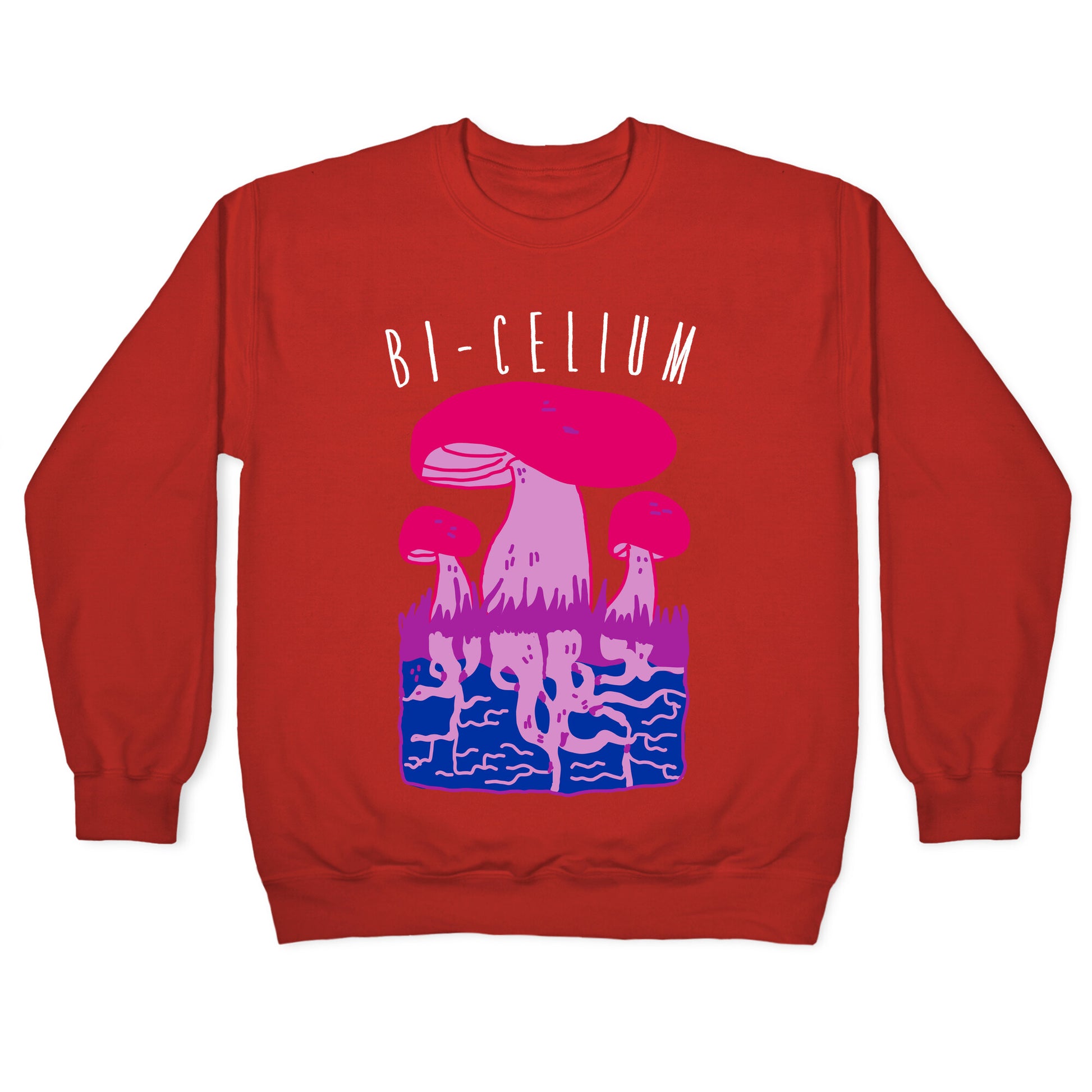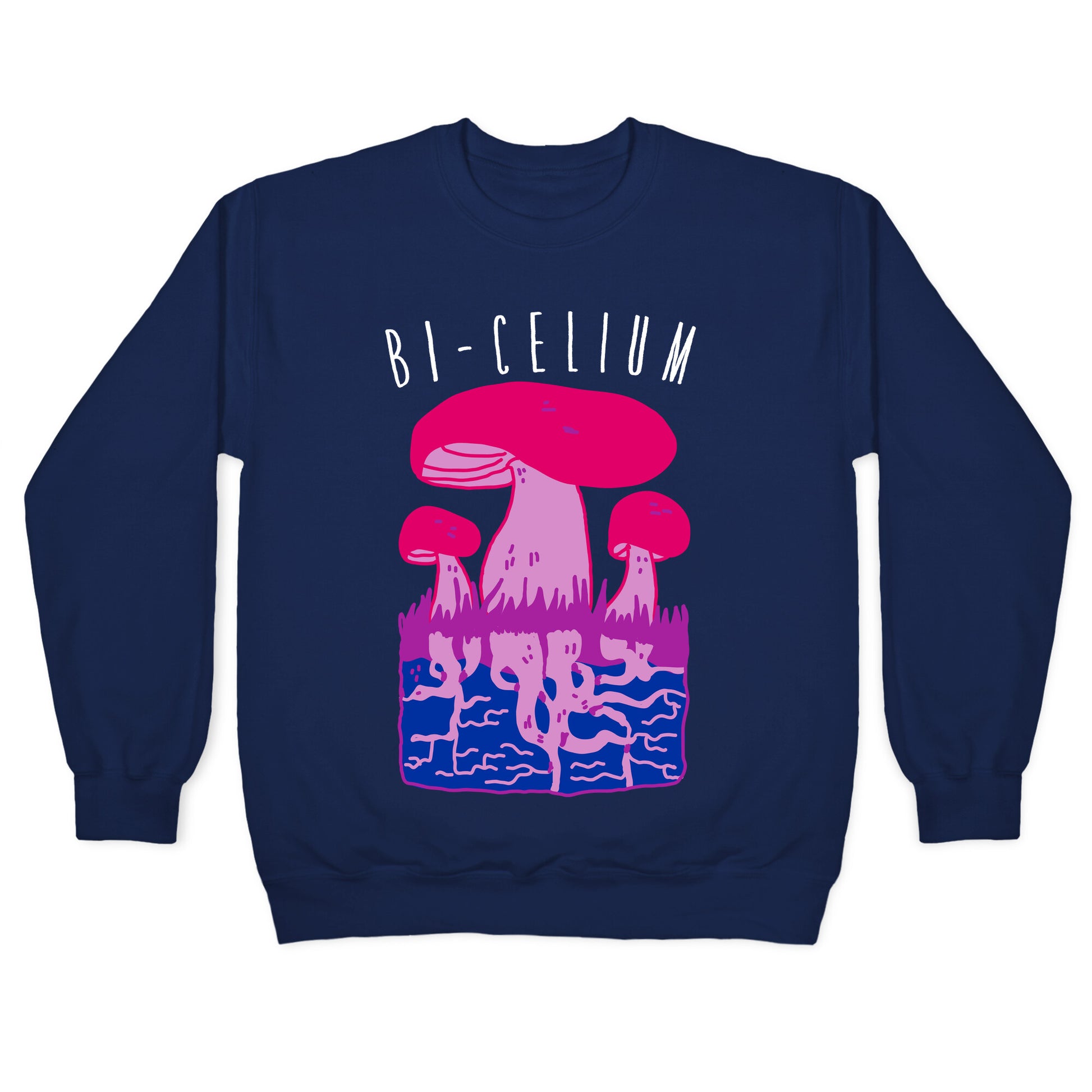 Bi humor can be a bit....spore-adic. You could say there is.... mushroom to play around with bi as a pun. Awkward finger gun your way through the forest with this funny mycelium layer bi flag!Our Unisex Crewneck Sweatshirt is made from a soft 8-ounce fabric, and they feature a crew neck, with sleeve and bottom hems for durability. Great for layering. Preshrunk for your convenience! Printed in the USA. Made with 50% Cotton and 50% Polyester.