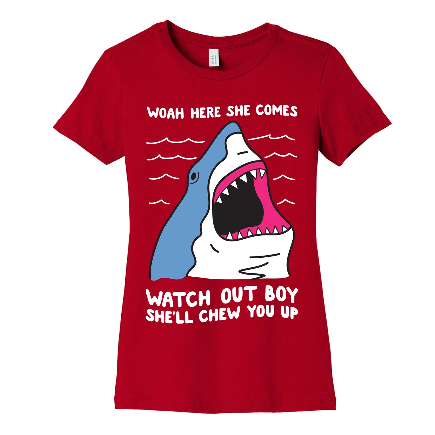 Woah here she comes, watch out boy she''ll chew you up! Woah here she comes, she's a maneater! Show off your love of sharks, 80s songs, and nostalgic music with this funny shark design.Our slim fit Women’s Cotton Tees, are made with exceedingly soft 100% cotton. They feature a relaxed neckline, and the sleeves and bottom, are hemmed for durability. Preshrunk for your convenience! Printed in the USA. Made with 100% Cotton. Colors such as gray, is made up of 90% cotton and 10% polyester, and deep pink is made up of 50% cotton and 50% polyester.