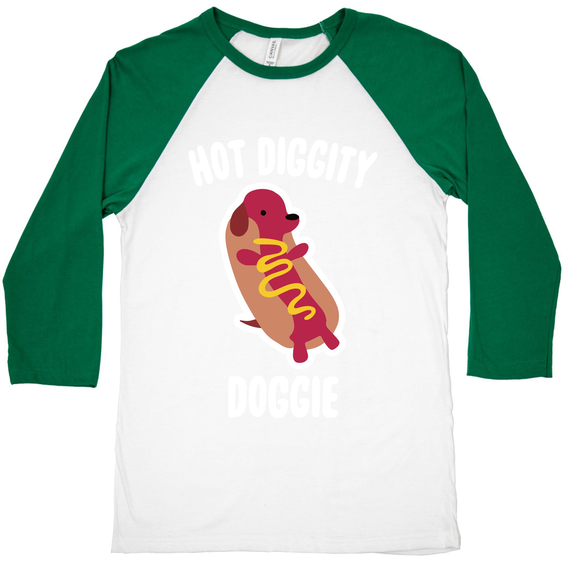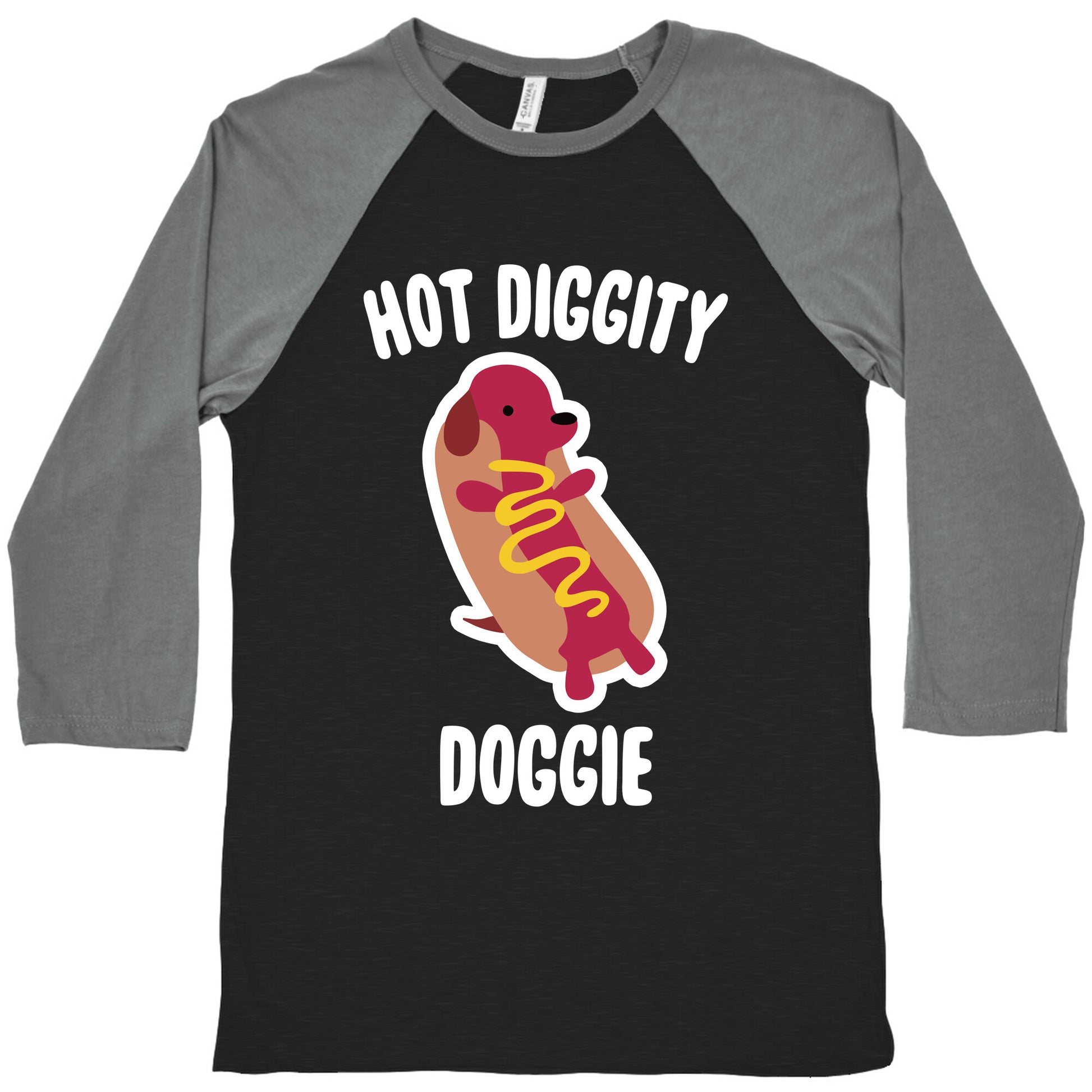 This dog is doing his diggity darn best! Lay on that mustard, hot stuff! Perfect for lovers of hot dogs, and hot diggity dogs. Our exceedingly soft and relaxed fit Tri-Blend Baseball Tee features a three-quarter length sleeve, crew neck, fun contrasting color sleeves and neck trim. Preshrunk for your convenience! Printed in the USA. Made with 50% Polyester, 25% Cotton and 25% Rayon
