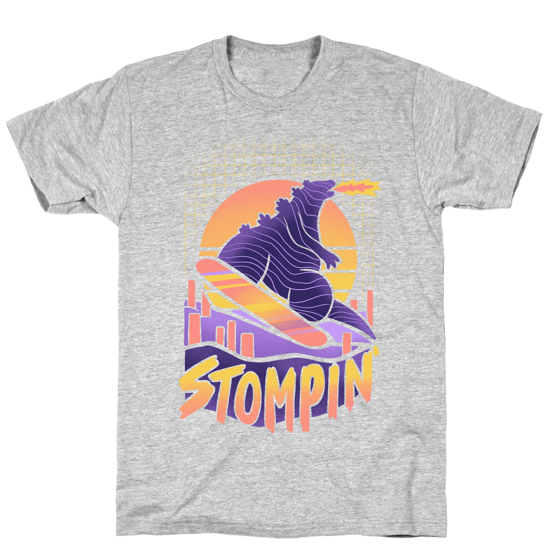 Stompin' cities and the slopes in synthwave style with this kaiju design featuring a snowboarding Godzilla! Perfect for stomping tricks, shreddin the gnar, and ridin the fresh pow of the city with monster skills! Our fitted Unisex Cotton tee is made from an exceedingly soft 100% ring spun cotton. It features a crew neckline with hemmed sleeves and bottom for durability. Preshrunk for your convenience! Printed in the USA. Made with 100% Ring Spun Cotton. Athletic Gray is made up of 90% cotton and 10% polyester. Other heathered colors are made of 52% cotton and 48% polyester.