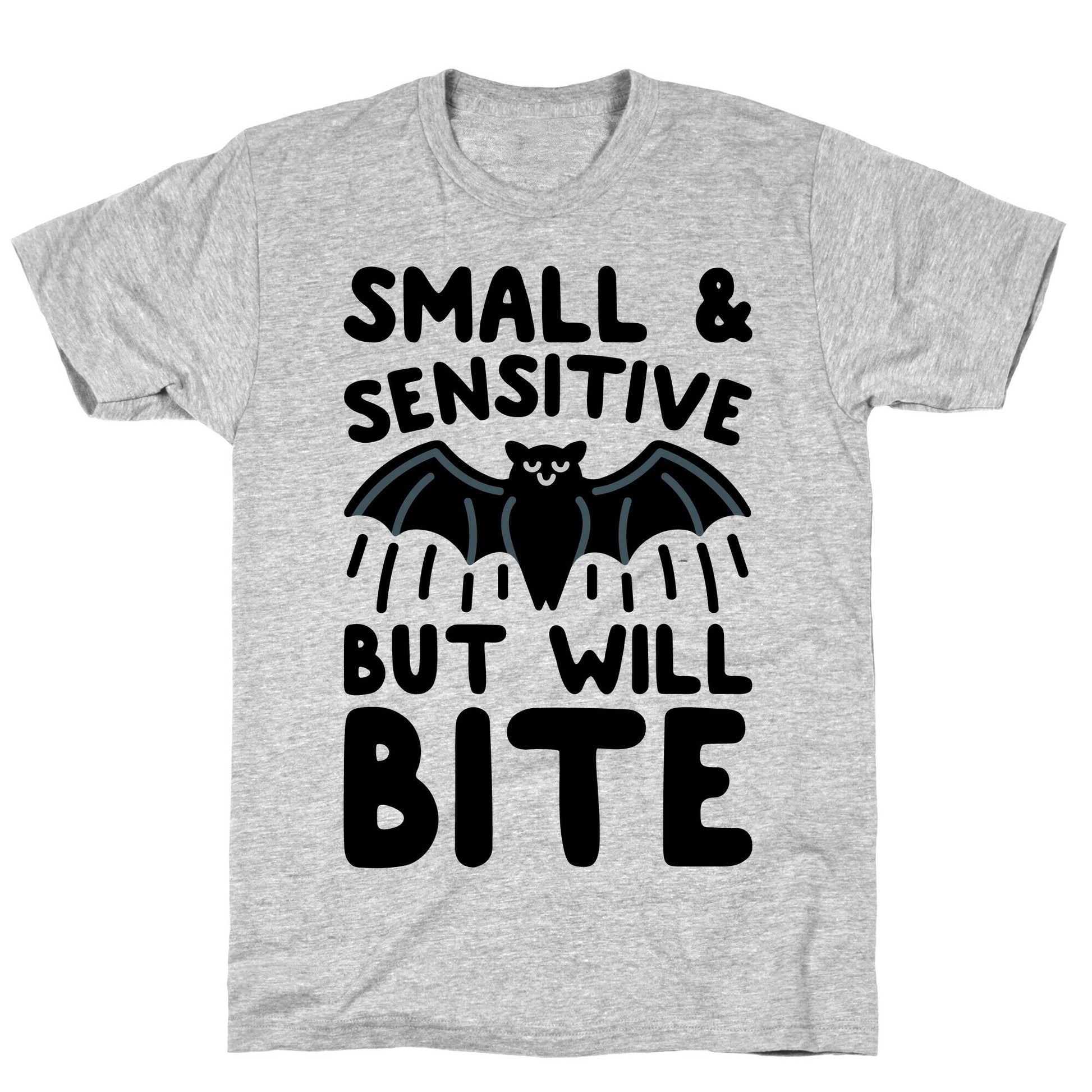 I may be small and sensitive but I will still bite you. Show off your small, sensitive and feisty side with this cute and funny, bat pun shirt! Our fitted Unisex Cotton tee is made from an exceedingly soft 100% ring spun cotton. It features a crew neckline with hemmed sleeves and bottom for durability. Preshrunk for your convenience! Printed in the USA. Made with 100% Ring Spun Cotton. Athletic Gray is made up of 90% cotton and 10% polyester. Other heathered colors are made of 52% cotton and 48% polyester.
