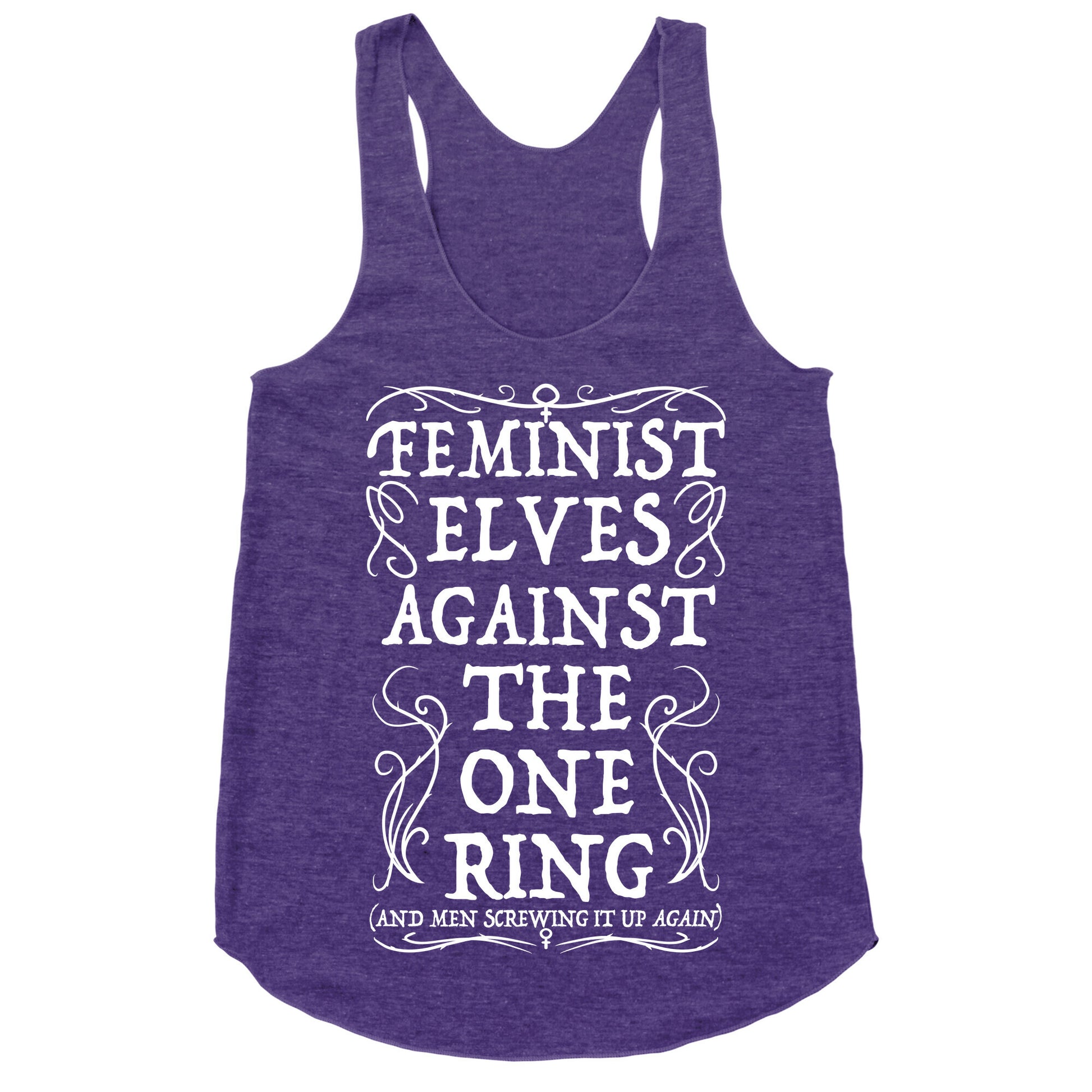 Feminist Elves Against the One Ring (and men screwing it up again). We love the powerful women in Lord of the Rings, Tauriel, Galdriel, Arwen, etc., and honestly, they probably wouldn't have majorly f***ed up Middle Earth if they had it. Female power! Show off your feminist, elvish, sass with this design!Our super comfortable Women’s Raw Edge Racerback features a soft tri-blend, unhemmed fabric, with a fashionable bell-like shape for the bottom. Preshrunk for your convenience! Printed in the USA. Made with 50% Polyester 25% Ring Spun Cotton, and 25% Rayon.