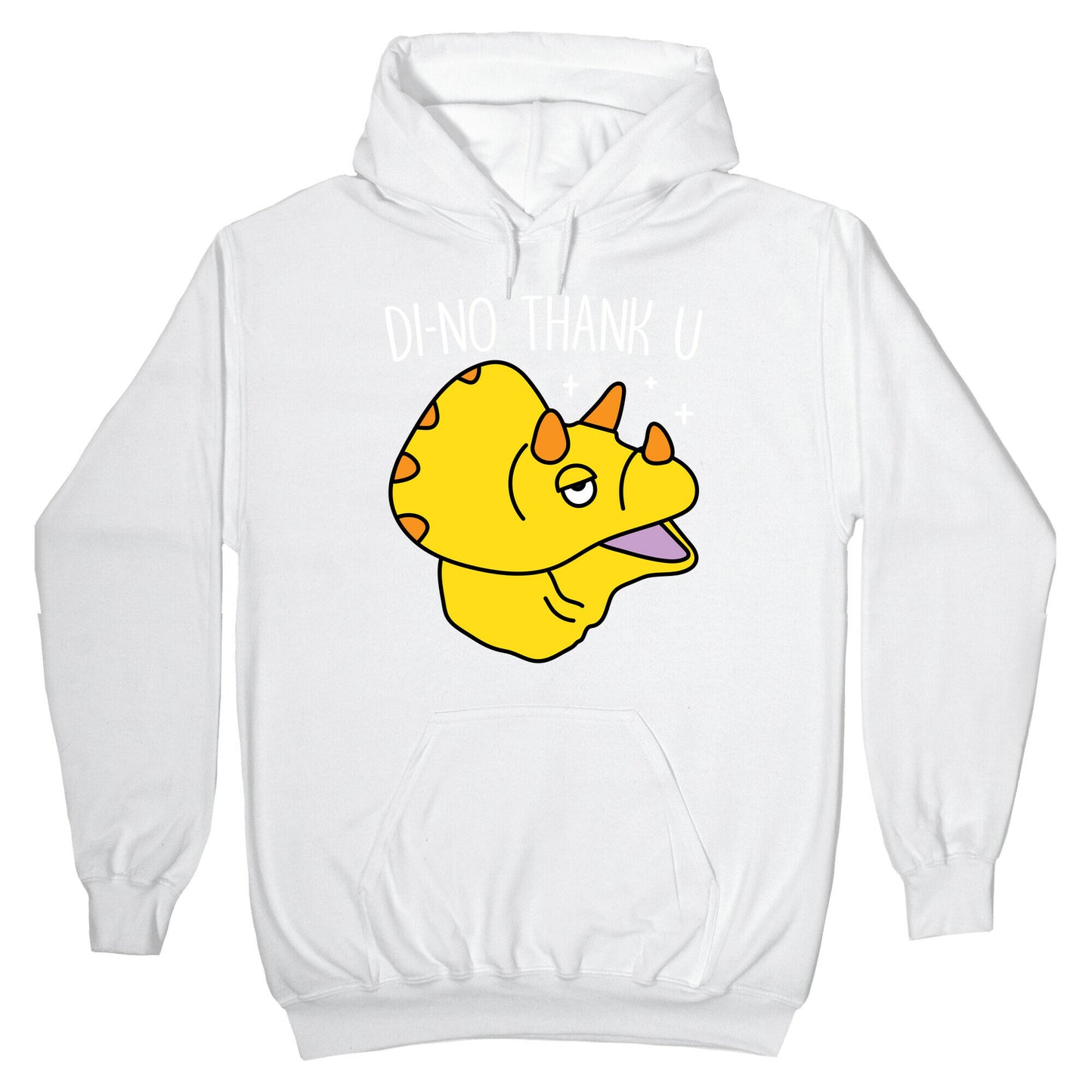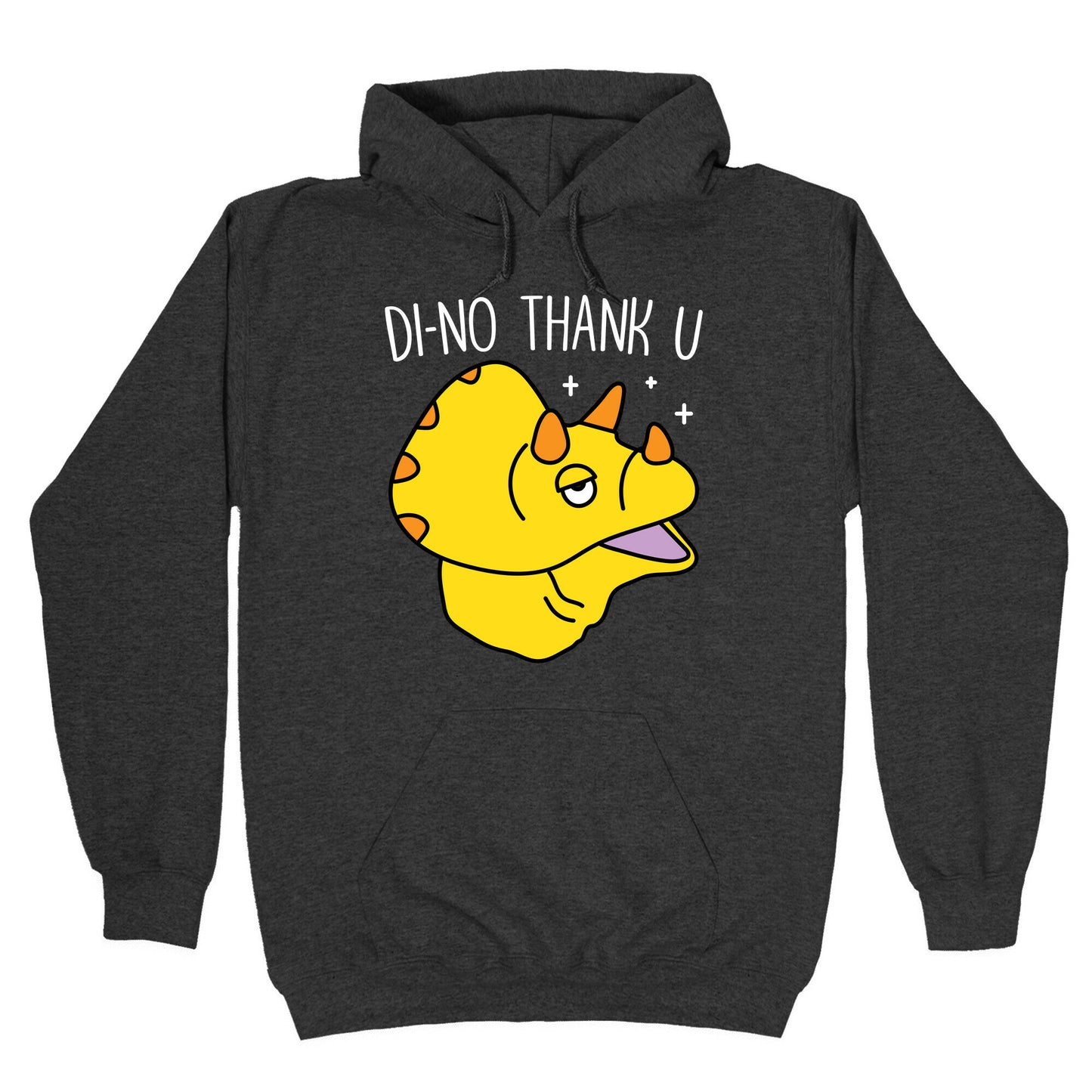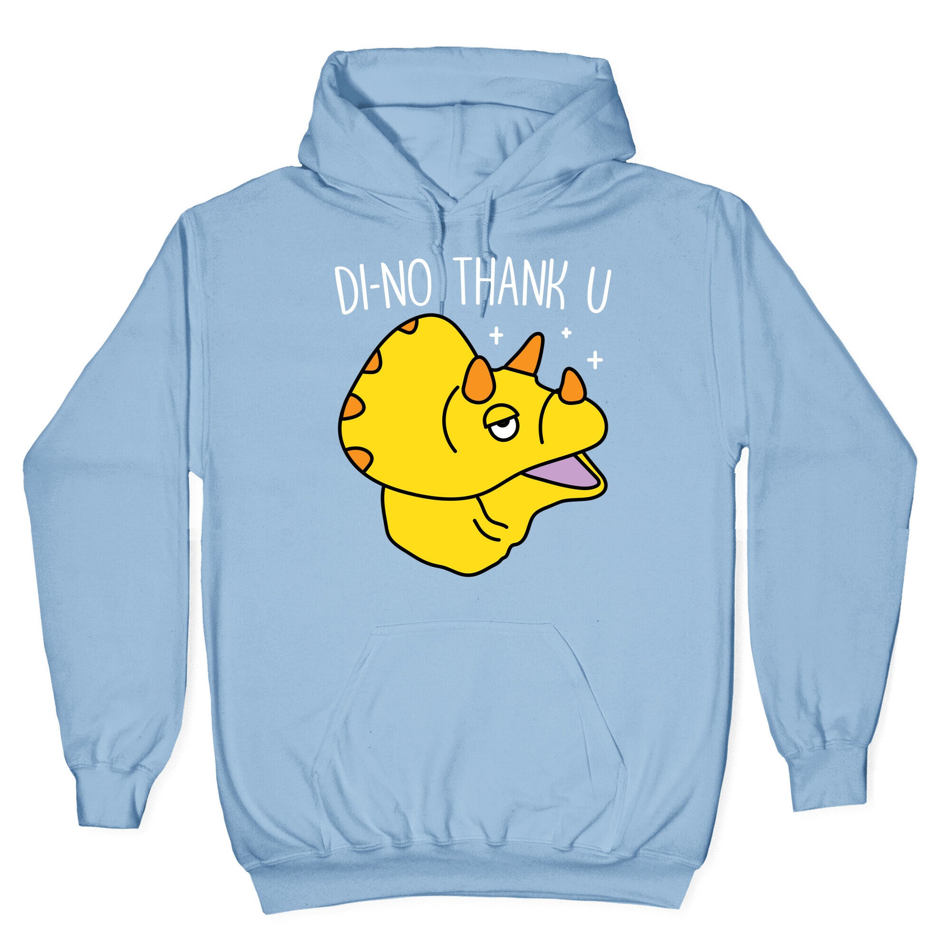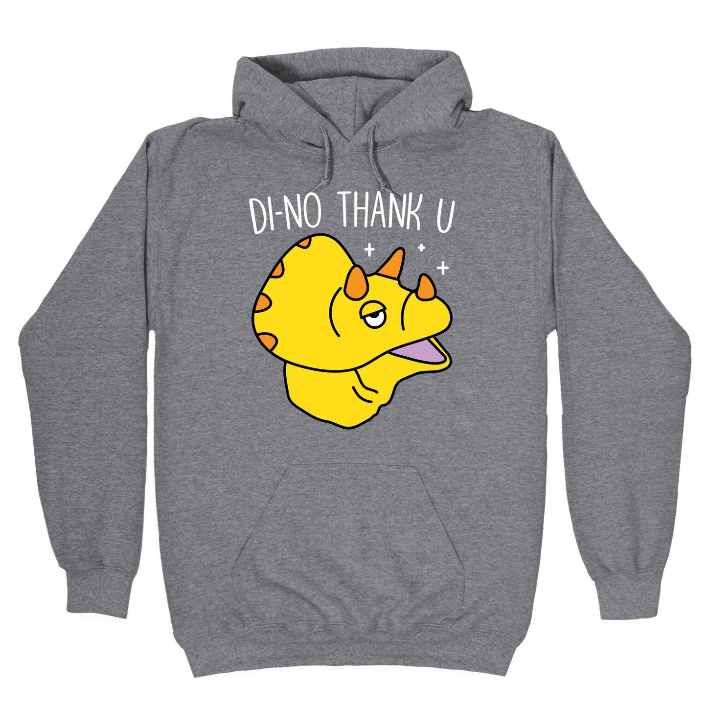 Show off your love of dinosaurs and being sassy with this, "Di-No Thank U" dino design! Perfect for saying no thank you and being left alone to live your best triceratops life. Our Unisex Pullover Hoodie is made from a soft 8-ounce fabric They feature a drawstring hood and front kangaroo pocket. Great for layering! Preshrunk for your convenience! Printed in the USA. Made with 50% Cotton and 50% Polyester.