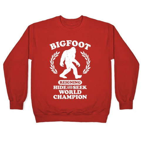 This funny shirt is perfect for believers in Yeti, Sasquatch, Bigfoot, or whatever you call that crazy, elusive, furry, legendary forest creature! Featuring a picture of the mythical Bigfoot and the phrase "reigning hide and seek world champion", this shirt is ideal for conspiracy theorists, believers in the supernatural, and hide and seek enthusiasts! Wear it to parties, school, college, university, work, Sasquatch hunting, or just partying and getting drunk with friends!Our Unisex Crewneck Sweatshirt is made from a soft 8-ounce fabric, and they feature a crew neck, with sleeve and bottom hems for durability. Great for layering. Preshrunk for your convenience! Printed in the USA. Made with 50% Cotton and 50% Polyester.