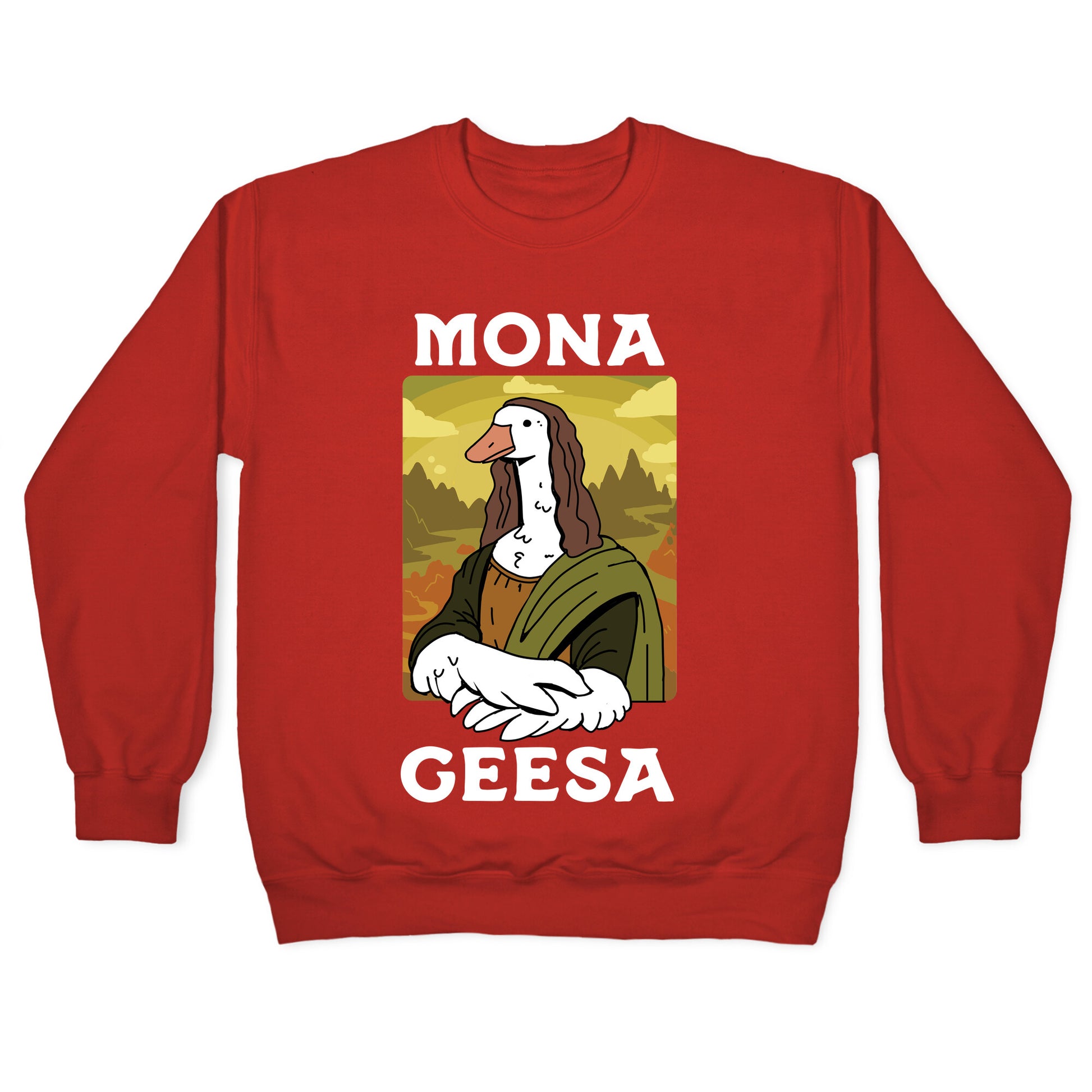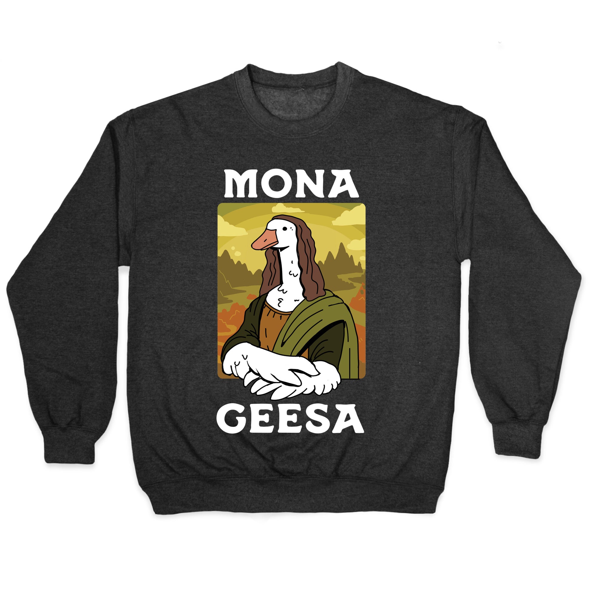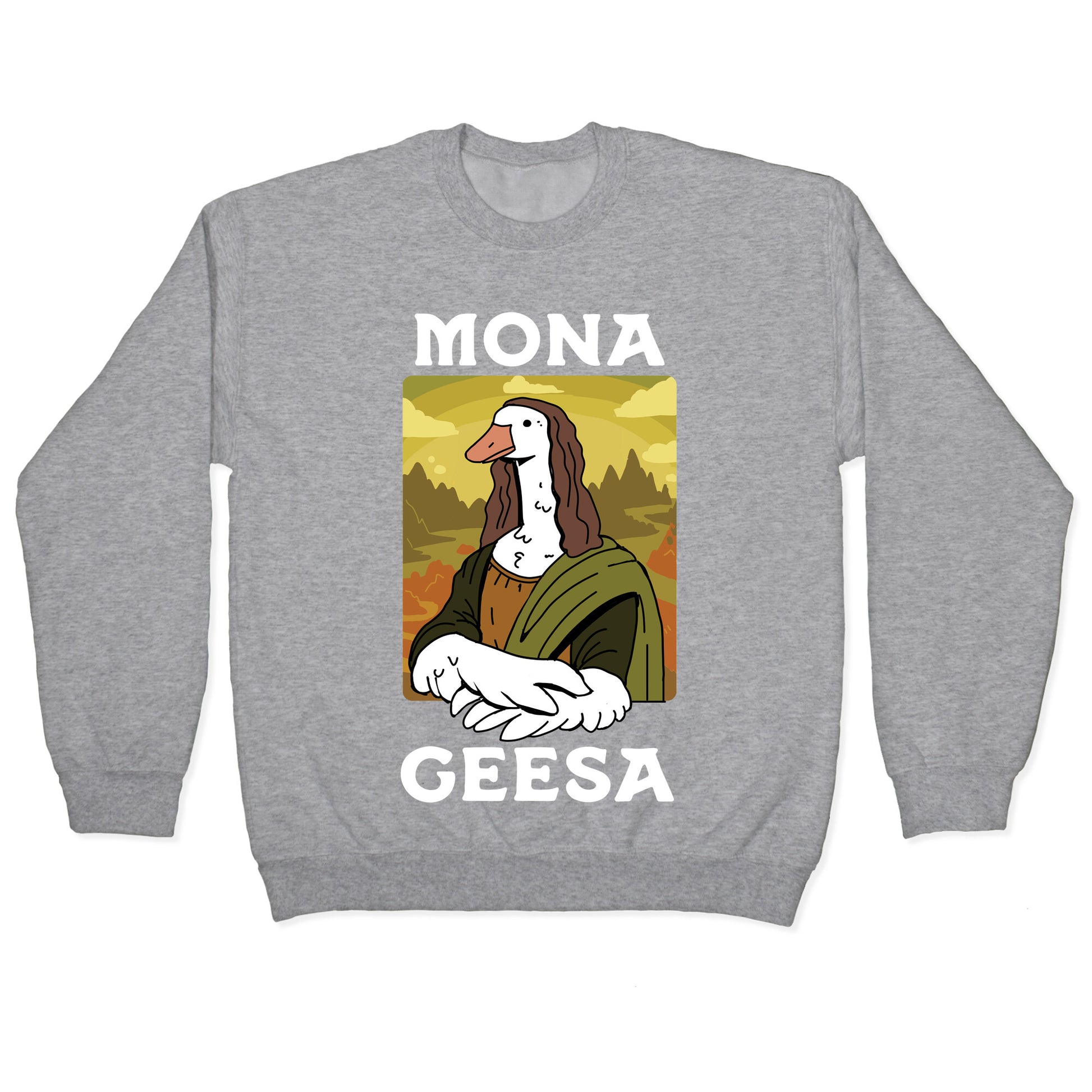 Behold the Mona Geesa t-shirt that's sure to turn heads and leave your friends clamoring for one! Inspired by a certain renaissance painting, this shirt brings a quirky and cultural twist to your wardrobe. With its bold print and striking message, you'll be the envy of all your art-loving friends. The Mona Geesa t-shirt pays homage to one of the most valuable pieces of art ever created. And if you're looking to stand out in a crowd, this shirt is guaranteed to do just that! Whether you're wearing it to a museum or just running errands around town, you'll feel like a true work of art. So why not add a little class and sophistication to your closet with the Mona Geesa t-shirt today? It's a no-brainer!Our Unisex Crewneck Sweatshirt is made from a soft 8-ounce fabric, and they feature a crew neck, with sleeve and bottom hems for durability. Great for layering. Preshrunk for your convenience! Printed in the USA. Made with 50% Cotton and 50% Polyester.