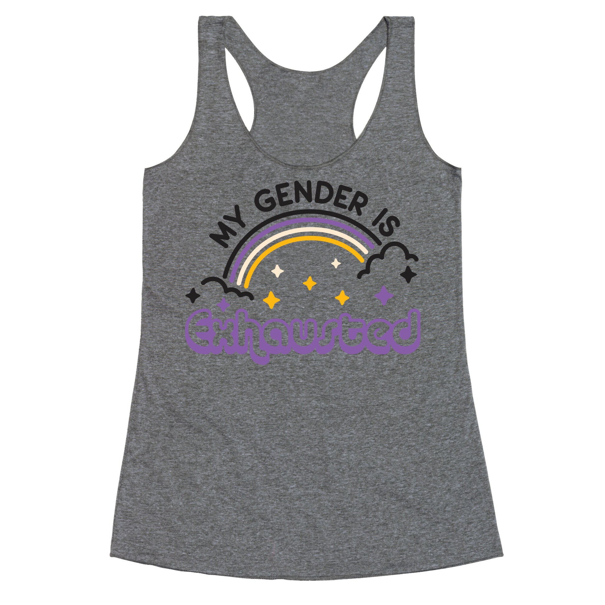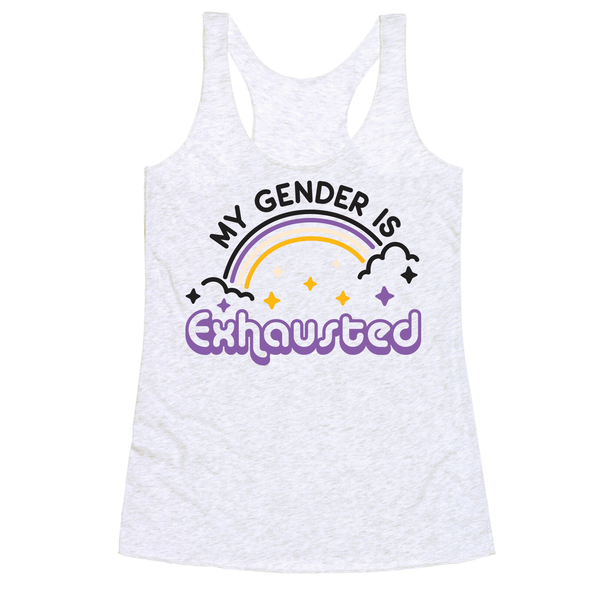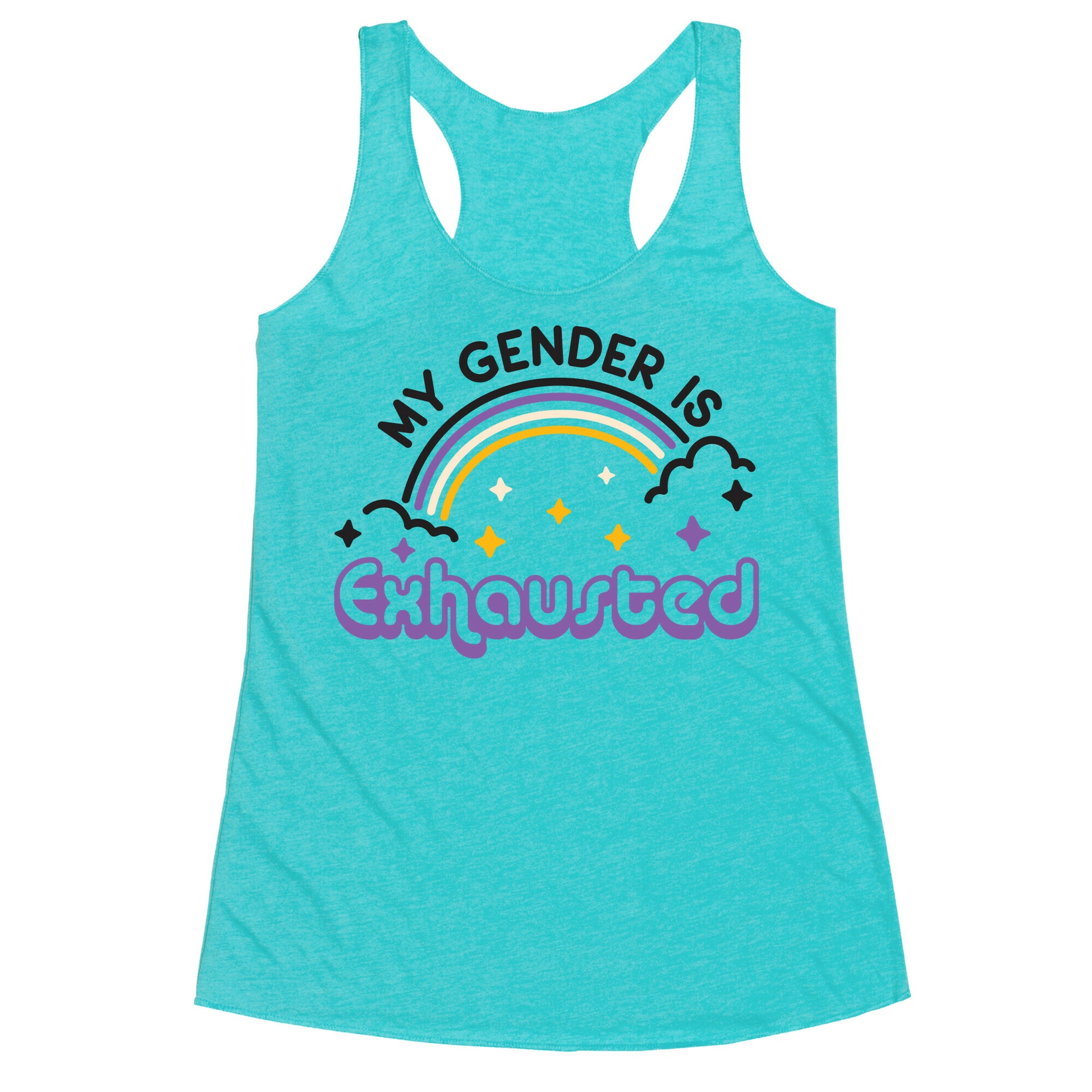 My pronouns are sleepy and tired, cuz my gender is exhausted! Break the binary and take a nap with this, "My Gender Is Exhausted" non-binary design!Our super comfortable Women’s Raw Edge Racerback features a soft tri-blend, unhemmed fabric, with a fashionable bell-like shape for the bottom. Preshrunk for your convenience! Printed in the USA. Made with 50% Polyester 25% Ring Spun Cotton, and 25% Rayon.