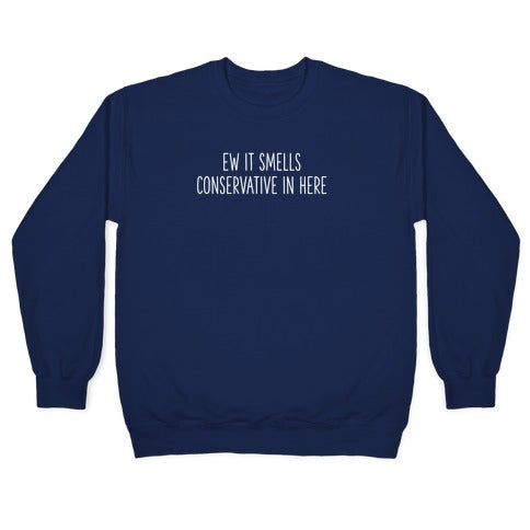 Ew It Smells Conservative In Here... This is it, this is what you wear to your majority conservative republican family holiday parties. When your family forces you to go to church, when you want to do a bit of a silent protest, when you're feeling angsty - this is it. Don't want to put effort into verbally expressing your beliefs because you know it will fall upon deaf ears? Let them read it, get their blood pressure going, yunno?Our Unisex Crewneck Sweatshirt is made from a soft 8-ounce fabric, and they feature a crew neck, with sleeve and bottom hems for durability. Great for layering. Preshrunk for your convenience! Printed in the USA. Made with 50% Cotton and 50% Polyester.