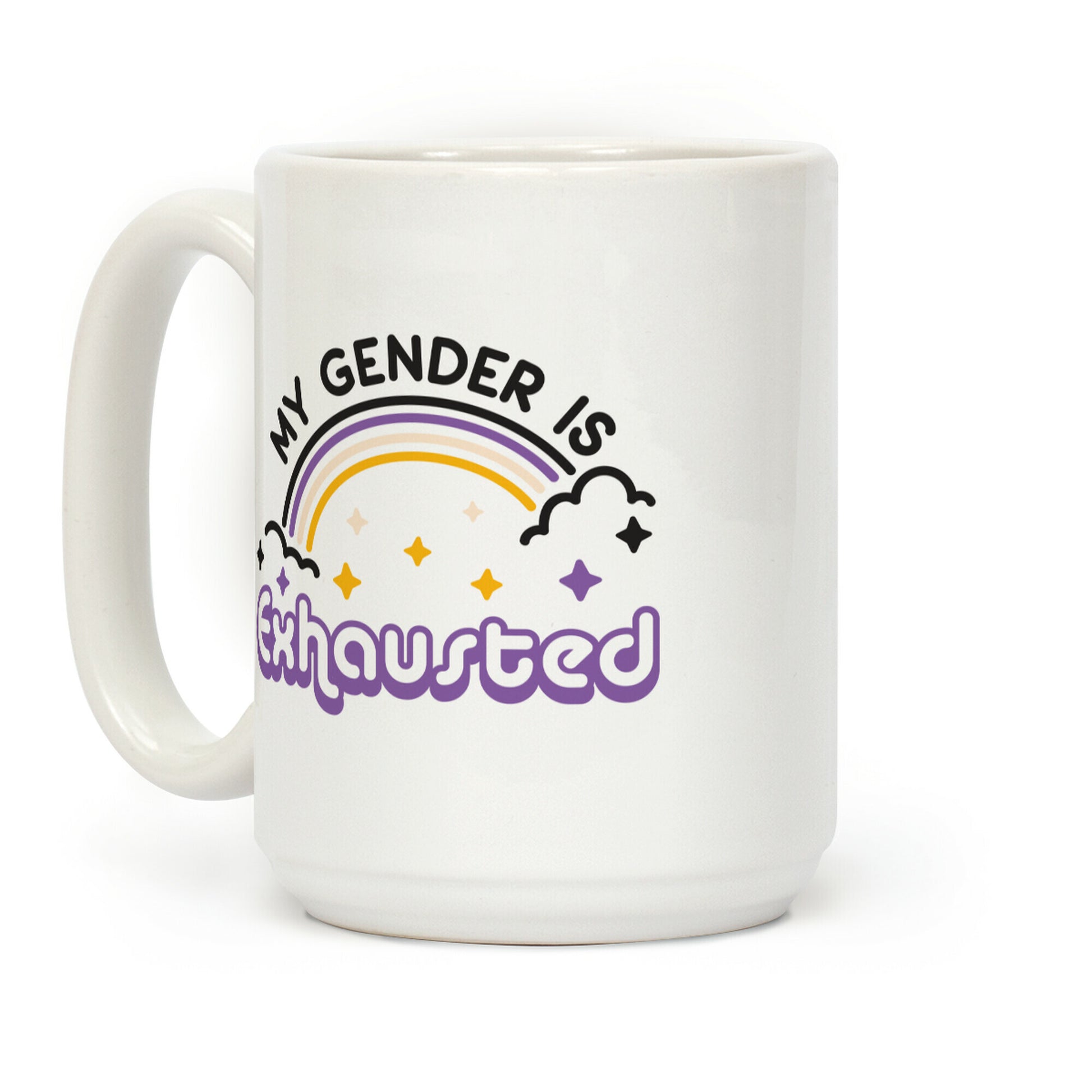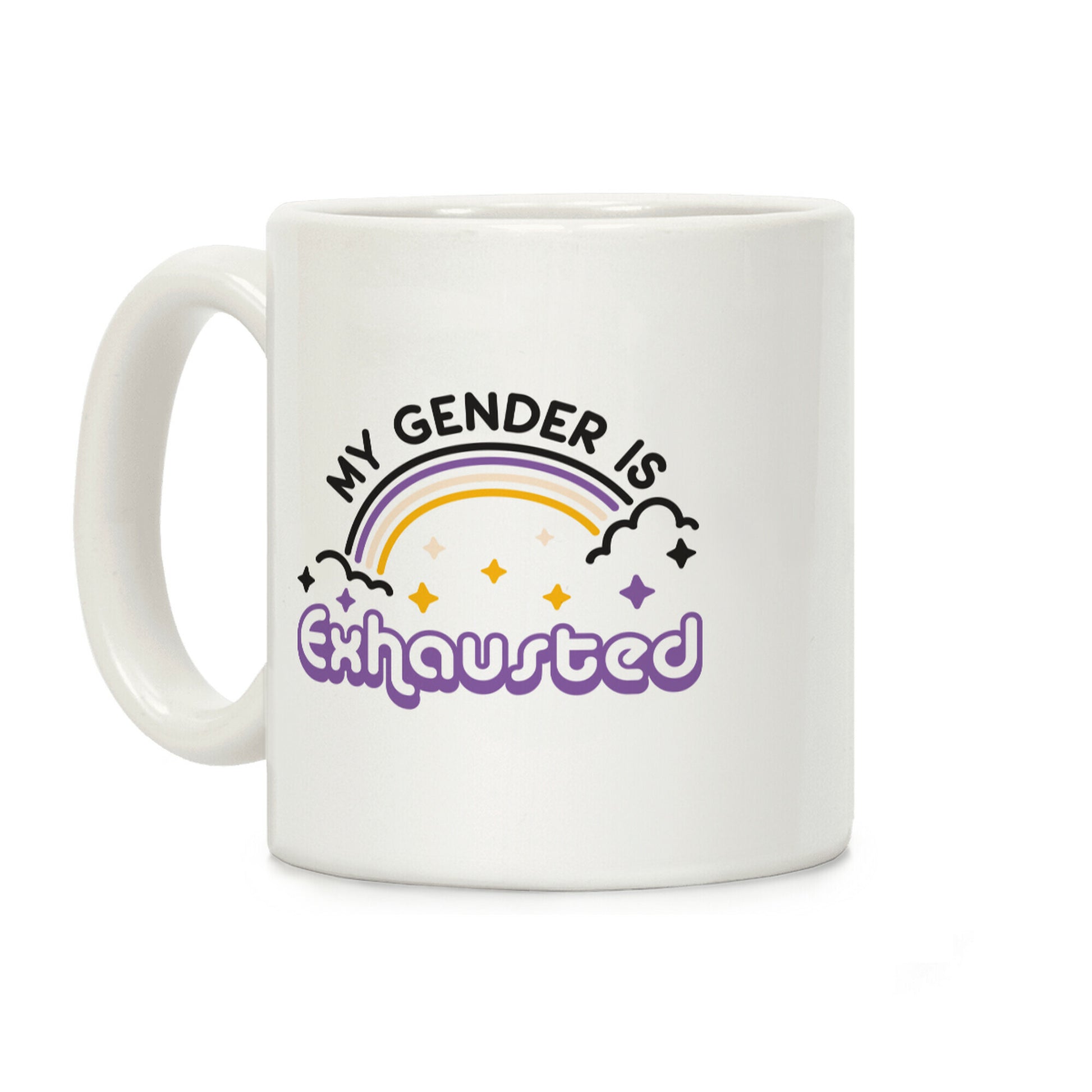 My pronouns are sleepy and tired, cuz my gender is exhausted! Break the binary and take a nap with this, "My Gender Is Exhausted" non-binary design! Our Mug features large handles for easy gripping and a wrap-around print. These heavy-duty Mugs are both dishwasher and microwave safe. Printed in the USA