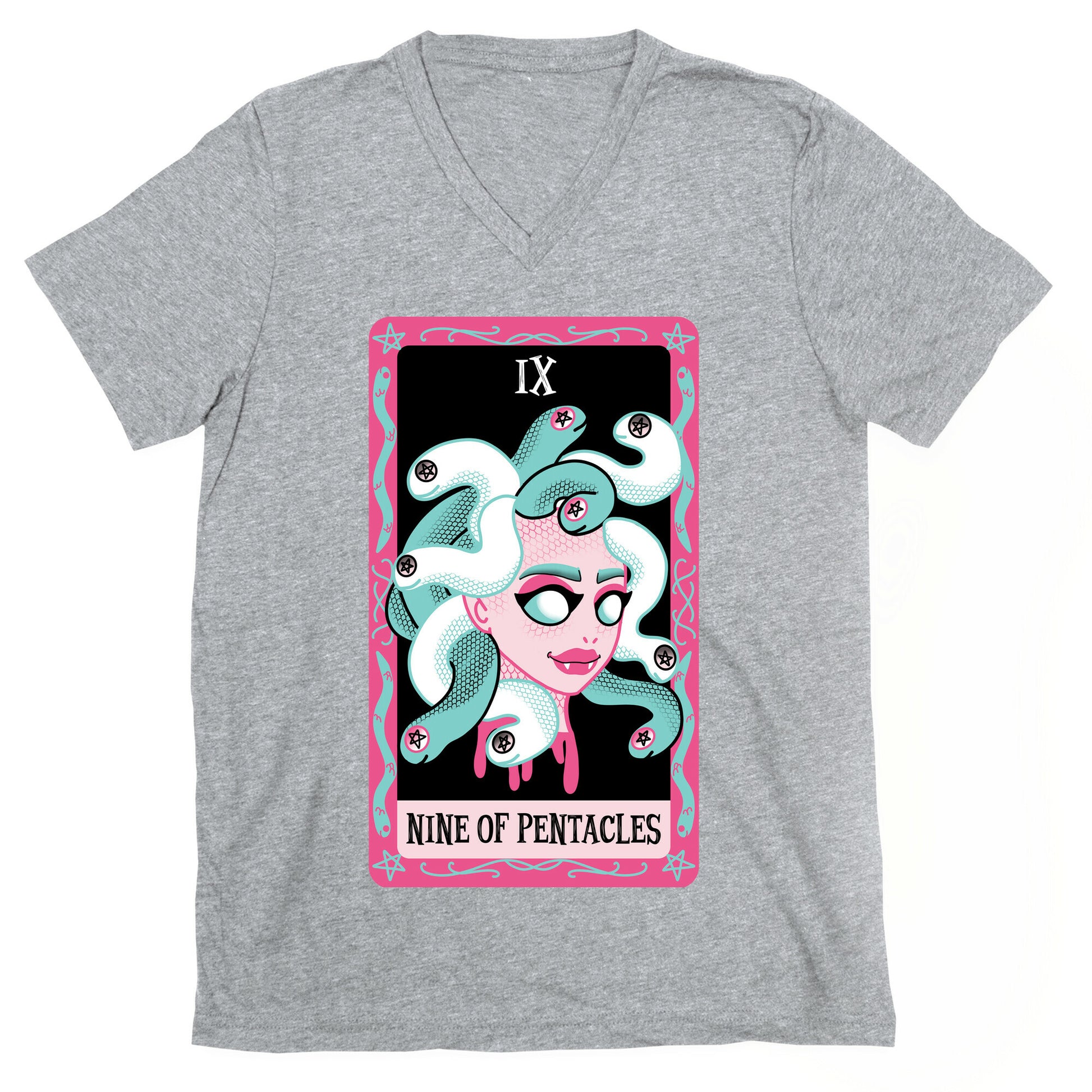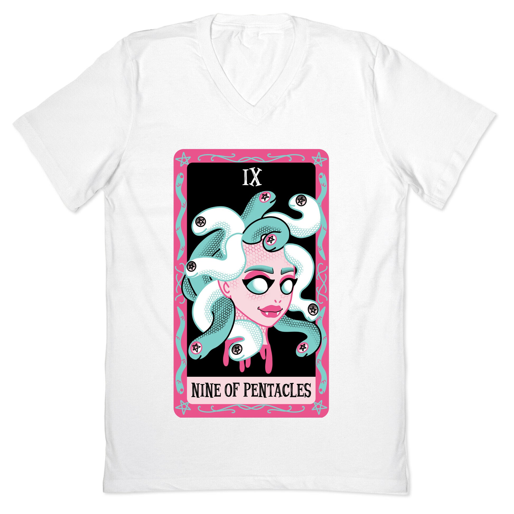 These adorable, yet creepy cards are great for fans of collecting Tarots. Wether you just like collecting tarots or choose to use them for divination, this is the perfect design for you! This gorgon has a beautiful head full of snakes, and their eyes are the pentacles! Our fitted Men's V-Neck tees are made with a soft jersey fabric. They feature a v-neckline, with sleeve and bottom hems for durability. Preshrunk for your convenience! Printed in the USA. Solid colors made with 100% Cotton and otherwise 90% Cotton and 10% Polyester.