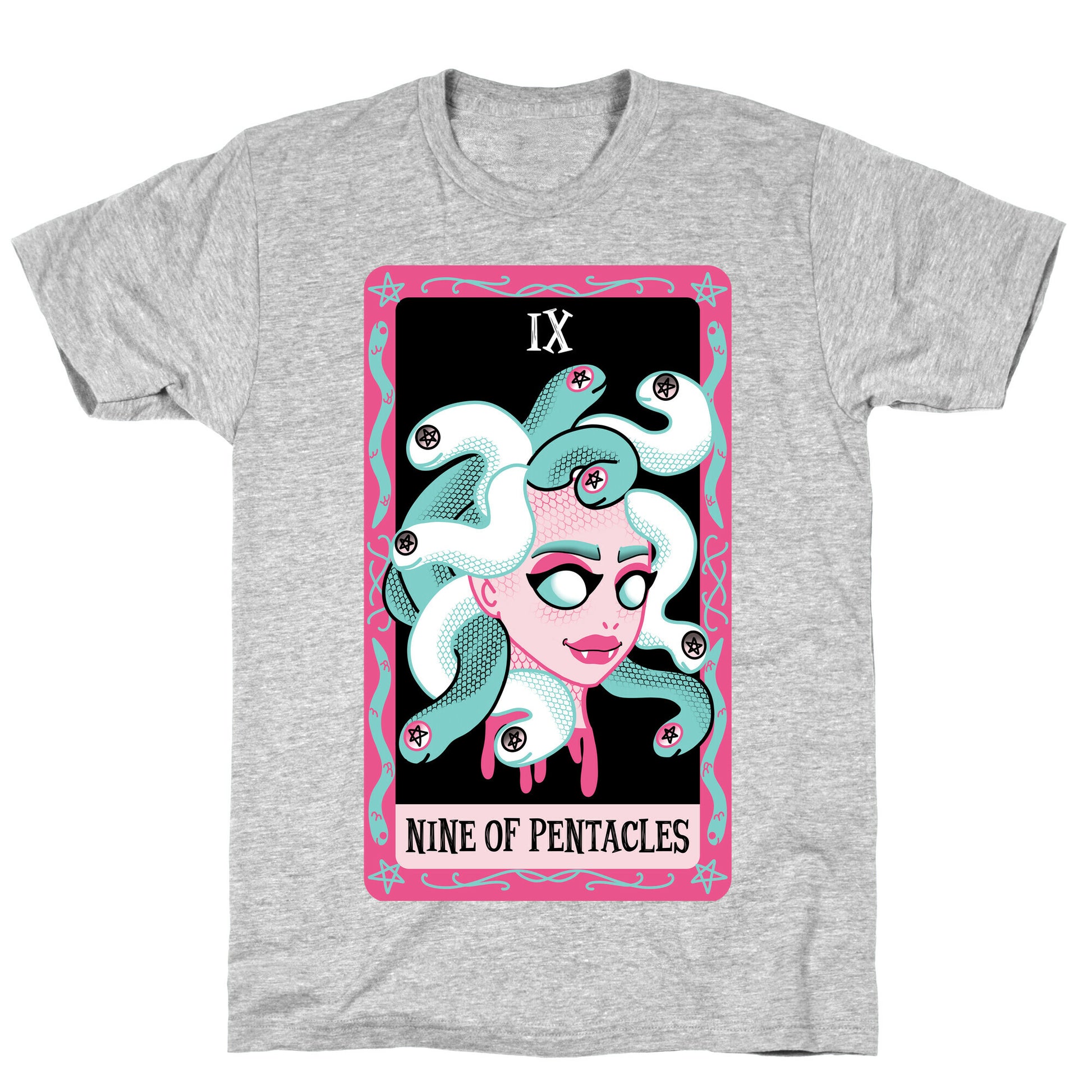 These adorable, yet creepy cards are great for fans of collecting Tarots. Wether you just like collecting tarots or choose to use them for divination, this is the perfect design for you! This gorgon has a beautiful head full of snakes, and their eyes are the pentacles! Our fitted Unisex Cotton tee is made from an exceedingly soft 100% ring spun cotton. It features a crew neckline with hemmed sleeves and bottom for durability. Preshrunk for your convenience! Printed in the USA. Made with 100% Ring Spun Cotton. Athletic Gray is made up of 90% cotton and 10% polyester. Other heathered colors are made of 52% cotton and 48% polyester.