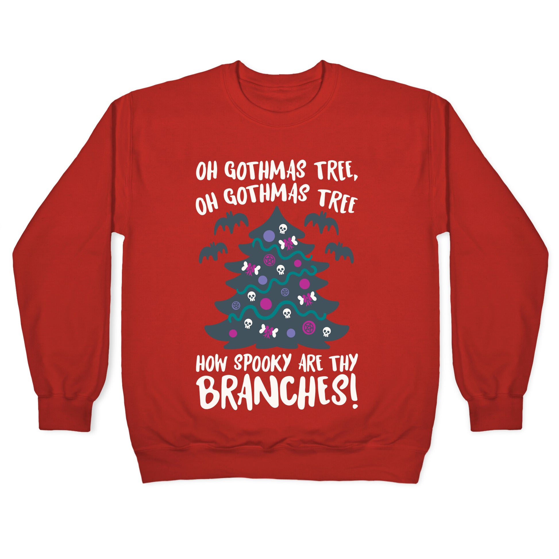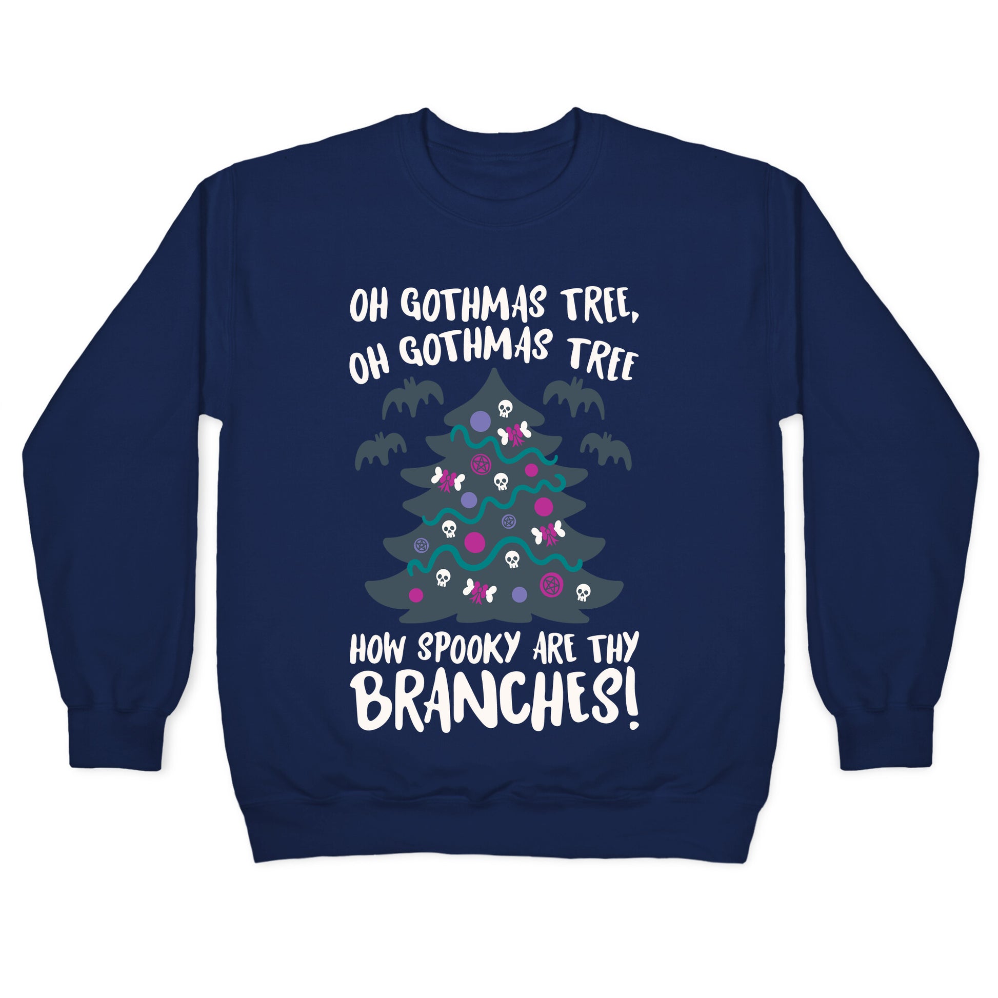 Oh Gothmas tree, Oh Gothmas tree how spooky are thy branches! Show off your spooky goth vibes and celebrate a goth holiday with this festive, goth parody design. Our Unisex Crewneck Sweatshirt is made from a soft 8-ounce fabric, and they feature a crew neck, with sleeve and bottom hems for durability. Great for layering. Preshrunk for your convenience! Printed in the USA. Made with 50% Cotton and 50% Polyester.