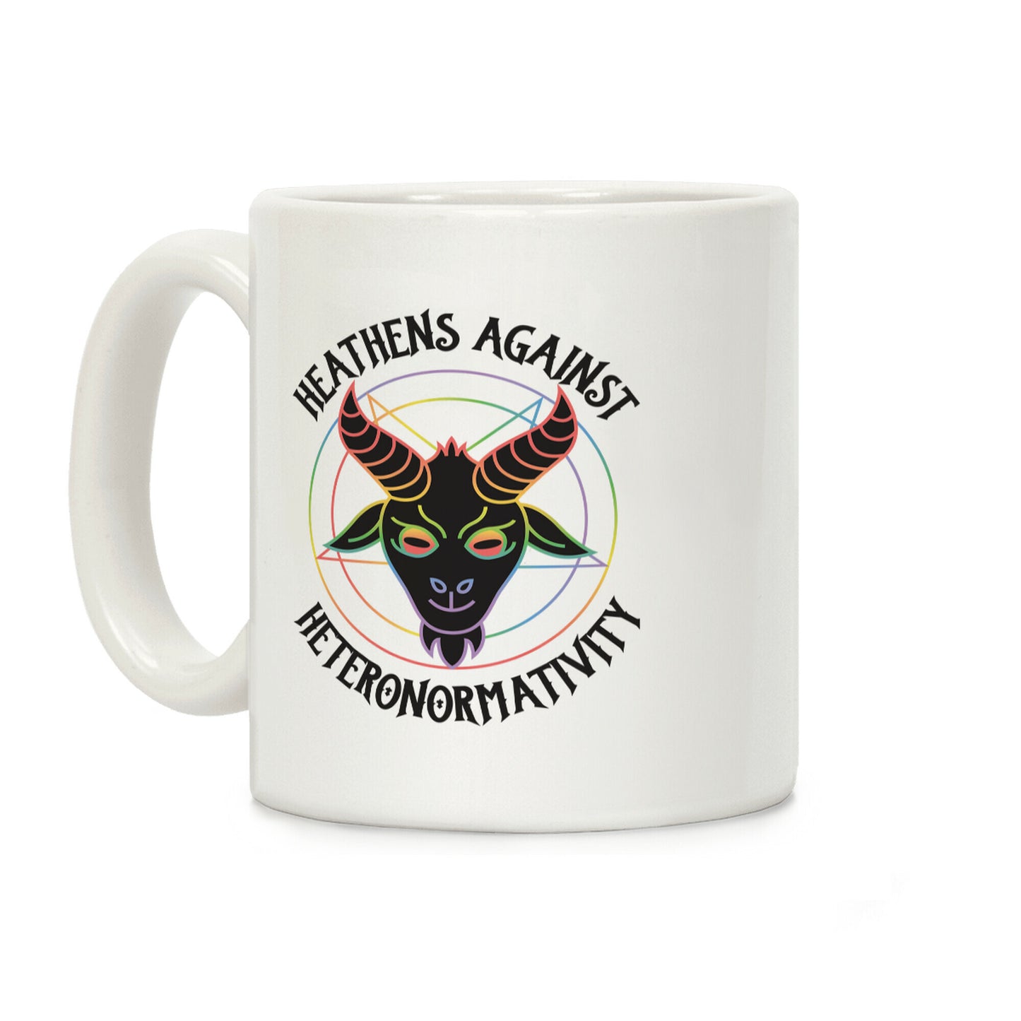 Keep heteronormativity out of hell! Get sassy and satanic with this, "Heathens Against Heteronormativity" funny queer design. Our Mug features large handles for easy gripping and a wrap-around print. These heavy-duty Mugs are both dishwasher and microwave safe. Printed in the USA.