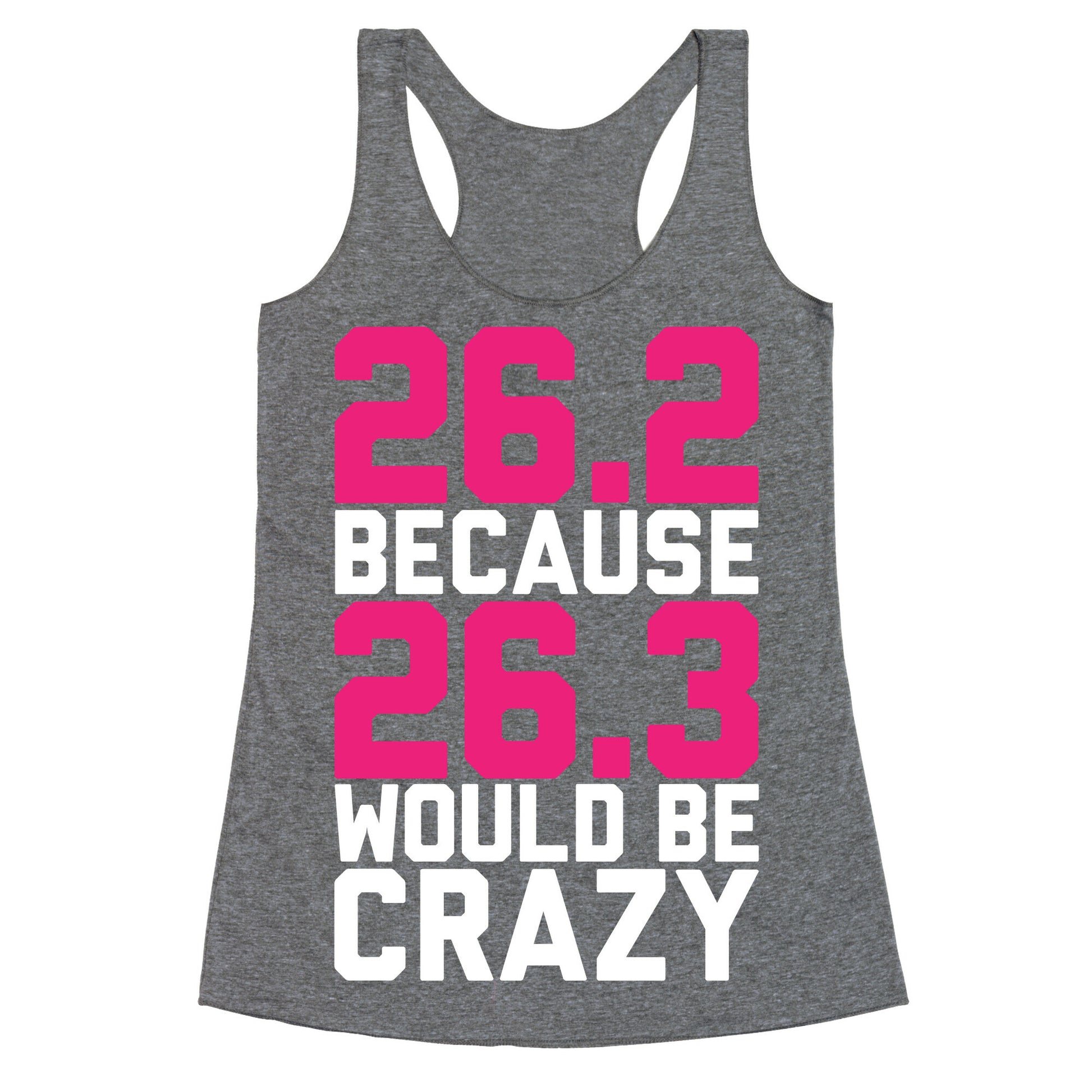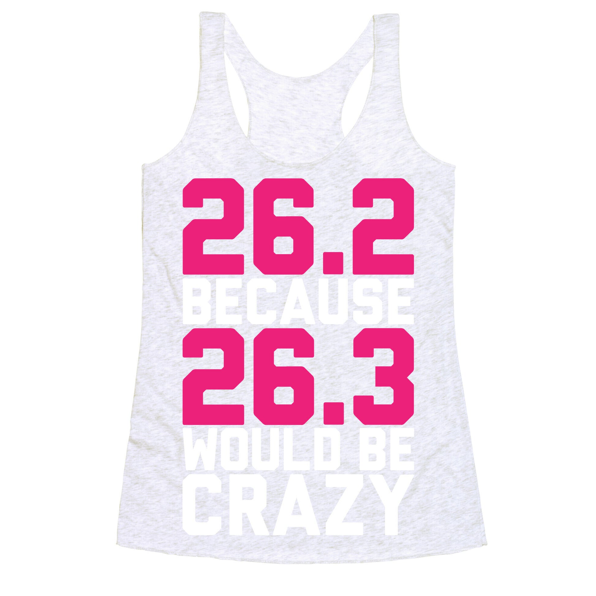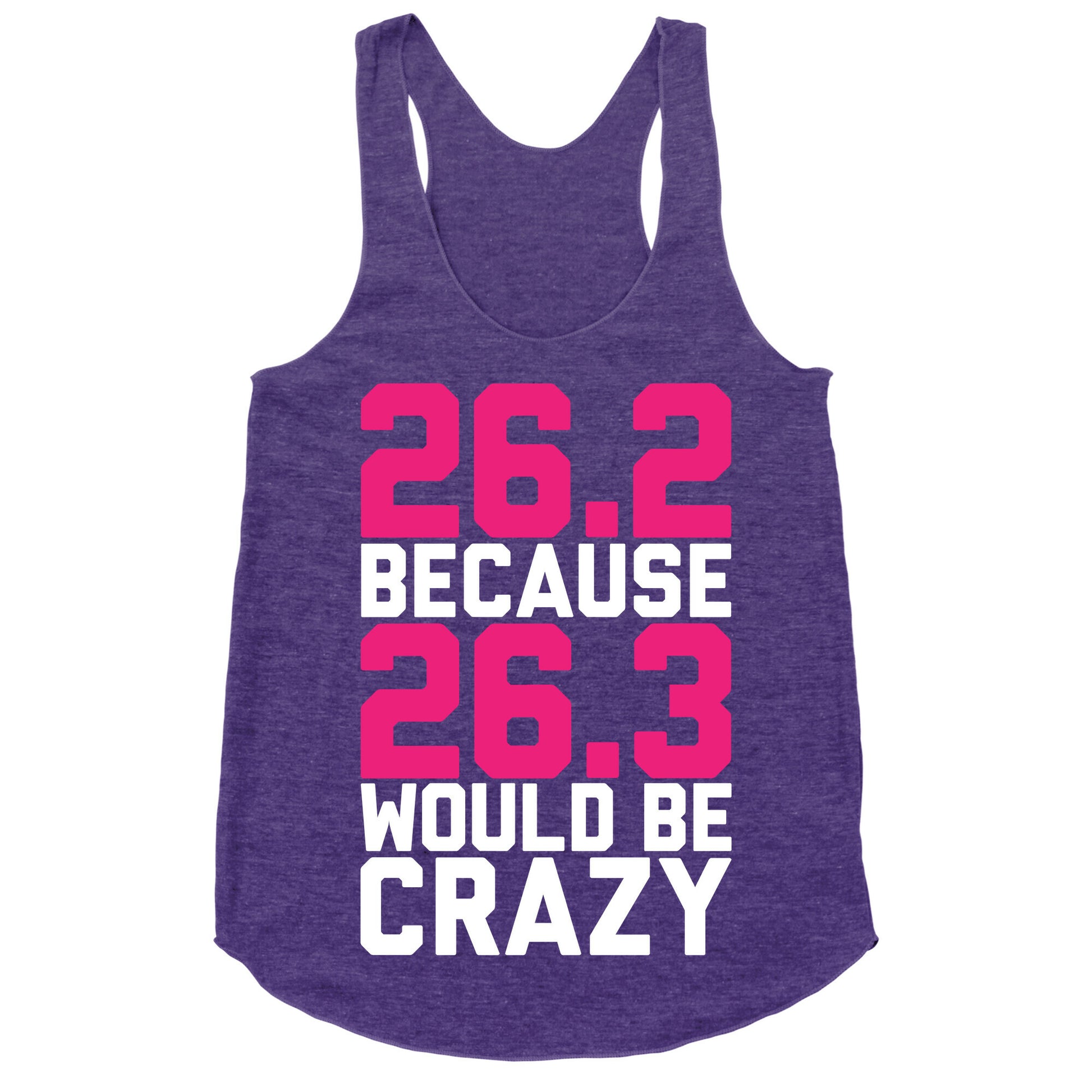 I run 26.2 miles at a time because 26.3 miles would be crazy! Wait...isn't 26.2 miles pretty crazy too? If you are crazy about running, marathons, half marathons, jogging, sprinting like the Greek soldier Pheidippides from the Battle of Marathon to Athens and partying with your cool, sleek, athletic friends, then this shirt is for you! Perfect for the gym!Our super comfortable Women’s Raw Edge Racerback features a soft tri-blend, unhemmed fabric, with a fashionable bell-like shape for the bottom. Preshrunk for your convenience! Printed in the USA. Made with 50% Polyester 25% Ring Spun Cotton, and 25% Rayon.