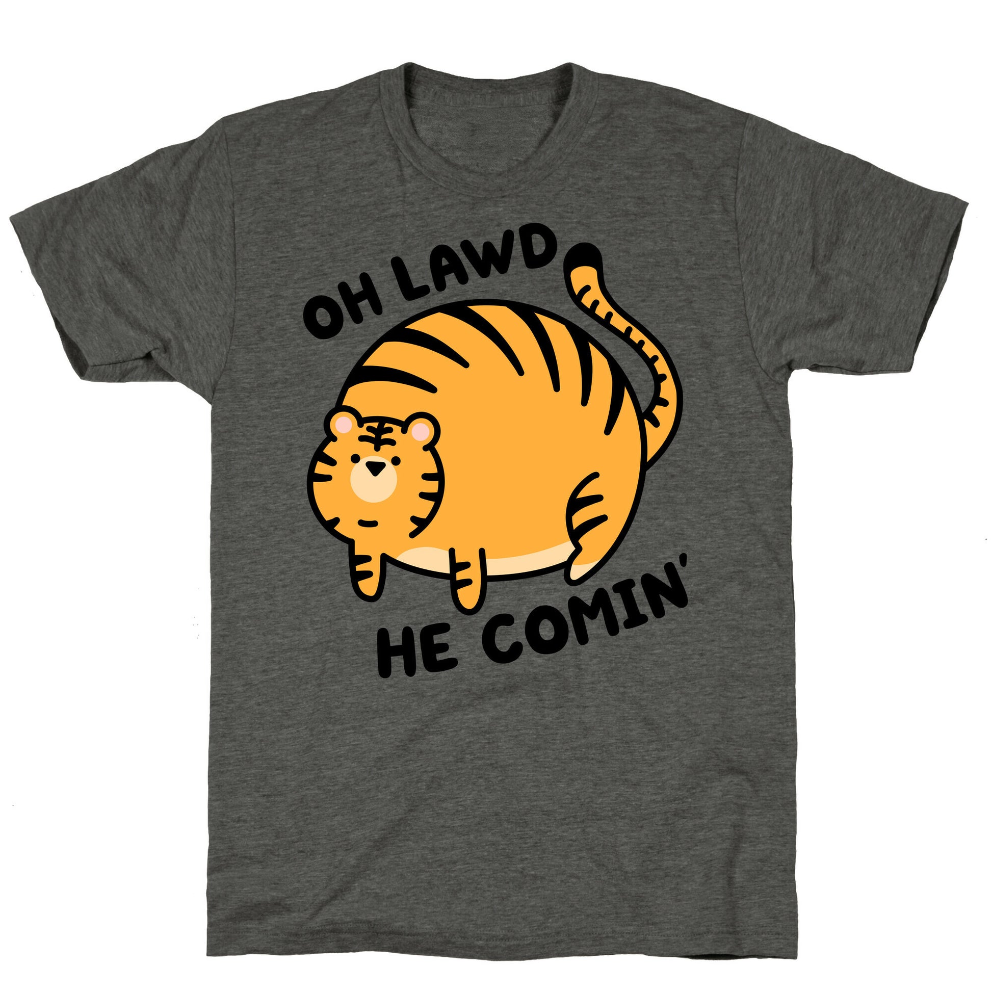 Oh Lawd he comin'! This tiger is ready to roll. Show off your love of tigers and chonky animals with this adorable, "Oh Lawd He Comin'" round tiger design! Our fitted Unisex Tri-Blend Tees are made with a soft tri-blend fabric. Featuring a crew neckline with sleeve and bottom hems for durability, these Tees look and feel great. Preshrunk for your convenience! Printed in the USA. Made with 50% Polyester, 25% Ring Spun Cotton, and 25% Rayon.