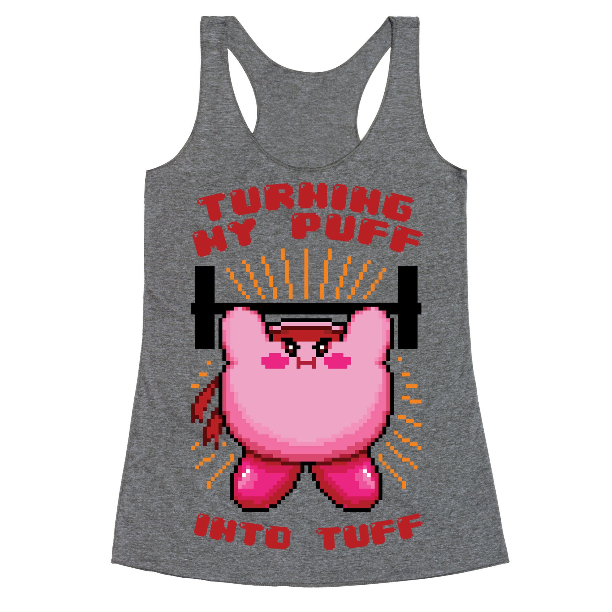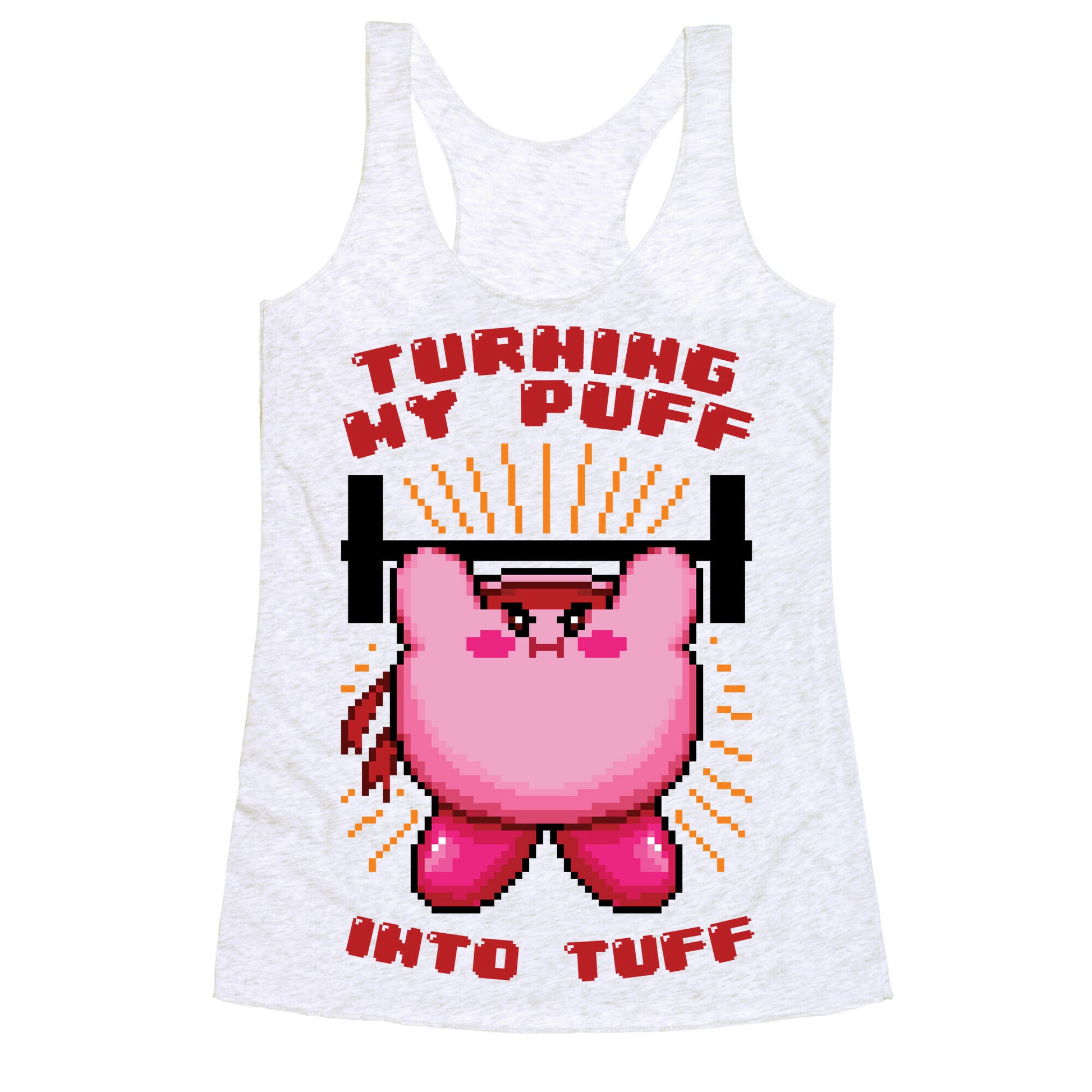 Mess with the puff or you'll get the tuff! Get ready for buff kirby, he's going to turn that squishy soft body into rock hard muscle. Our super comfortable Women’s Raw Edge Racerback features a soft tri-blend, unhemmed fabric, with a fashionable bell-like shape for the bottom. Preshrunk for your convenience! Printed in the USA. Made with 50% Polyester 25% Ring Spun Cotton, and 25% Rayon.