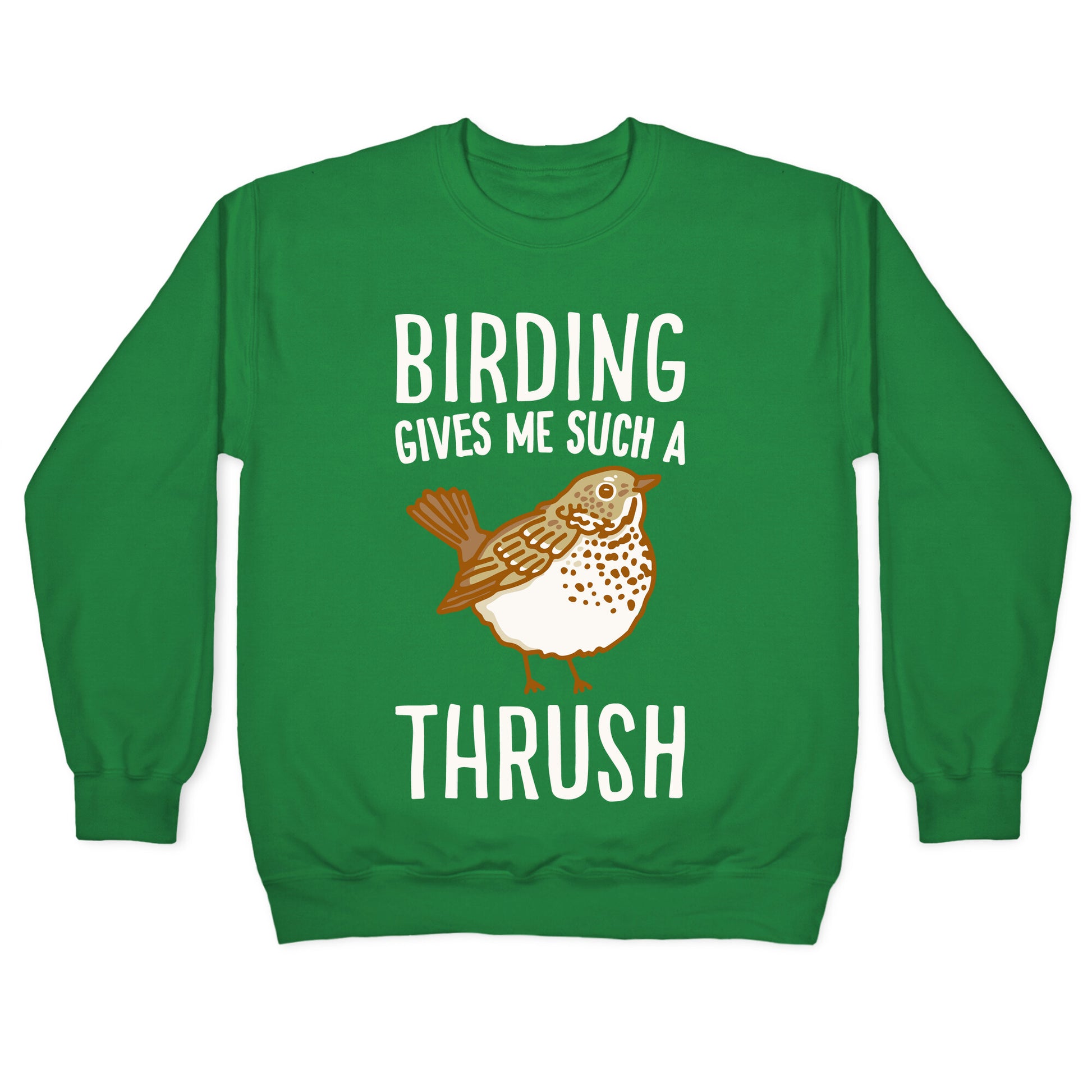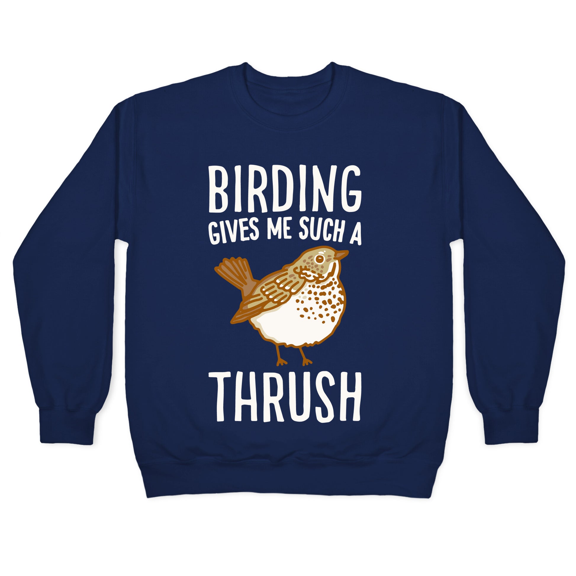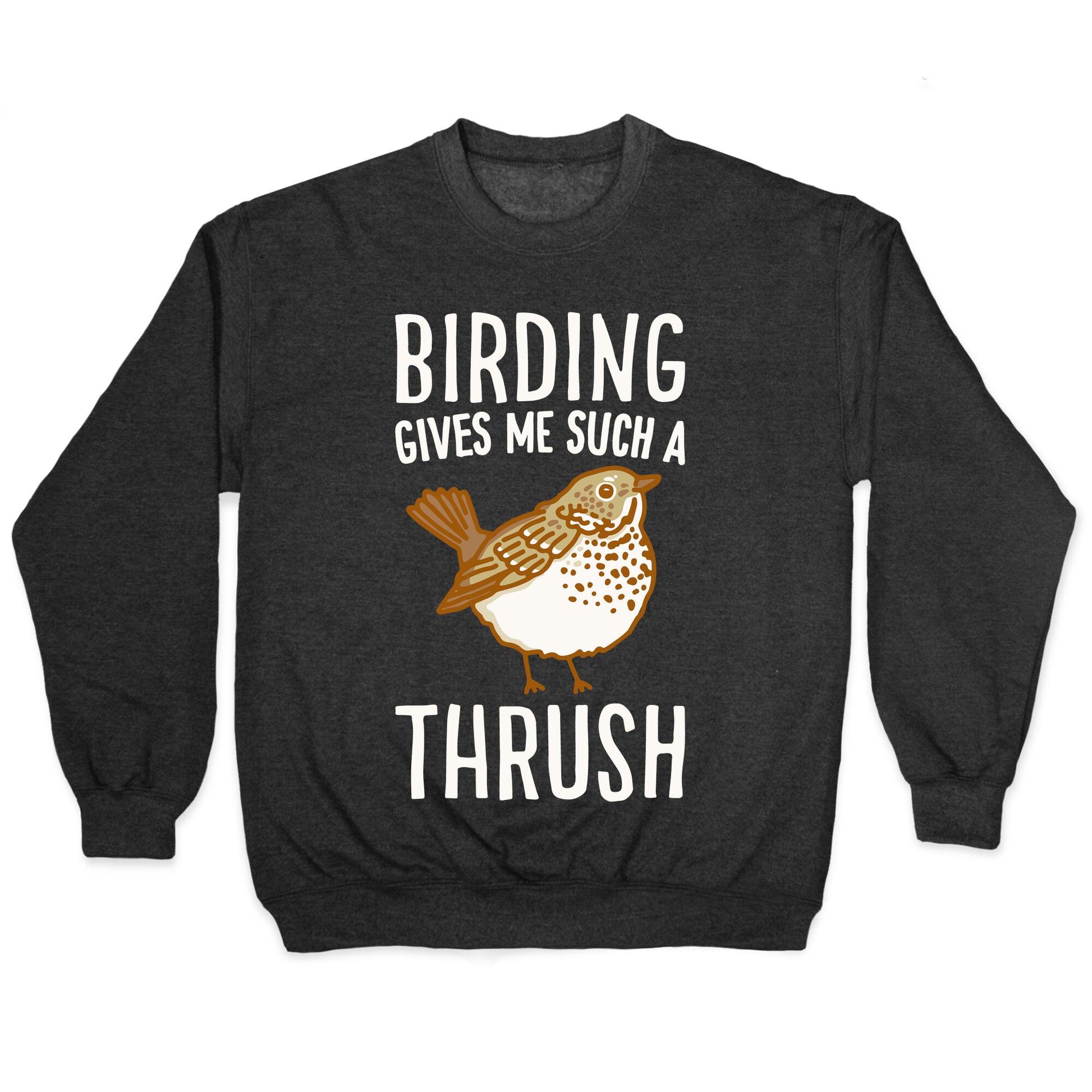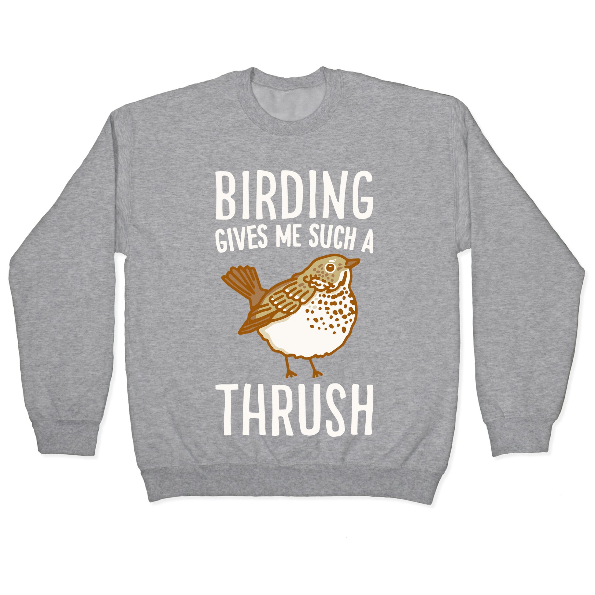 Birding gives me such a thrush! show off your love for those cute fluffy, thrushes and for birding with this funny, birding pun design. Our Unisex Crewneck Sweatshirt is made from a soft 8-ounce fabric, and they feature a crew neck, with sleeve and bottom hems for durability. Great for layering. Preshrunk for your convenience! Printed in the USA. Made with 50% Cotton and 50% Polyester.