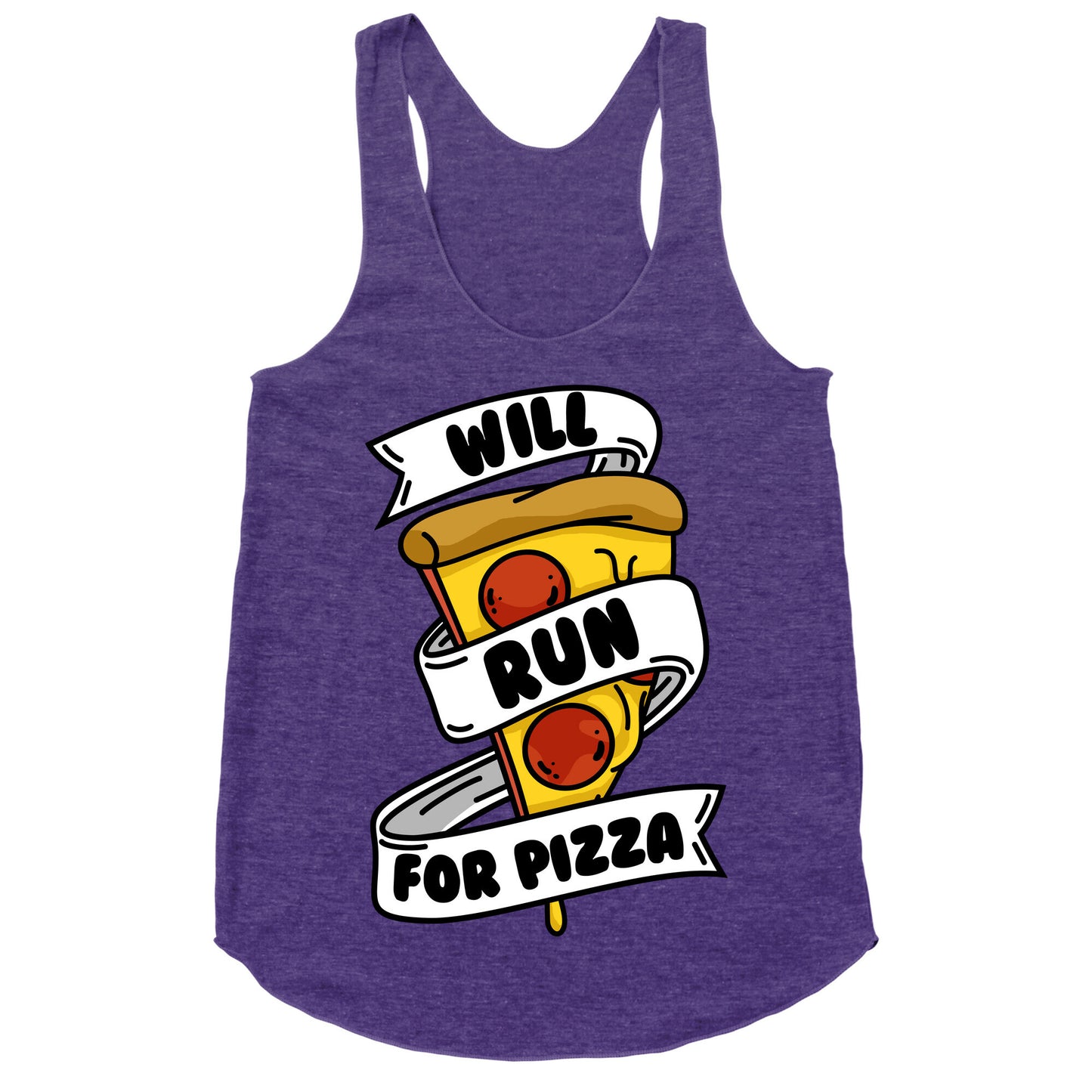 Will run for pizza! If that isn't a great motivator for running, then nothing is. Show off your love of pizza and fitness with this food and exercise inspired, pizza humor, cardio shirt! Now get a run in and grab yourself a slice of pepperoni!Our super comfortable Women’s Raw Edge Racerback features a soft tri-blend, unhemmed fabric, with a fashionable bell-like shape for the bottom. Preshrunk for your convenience! Printed in the USA. Made with 50% Polyester 25% Ring Spun Cotton, and 25% Rayon.