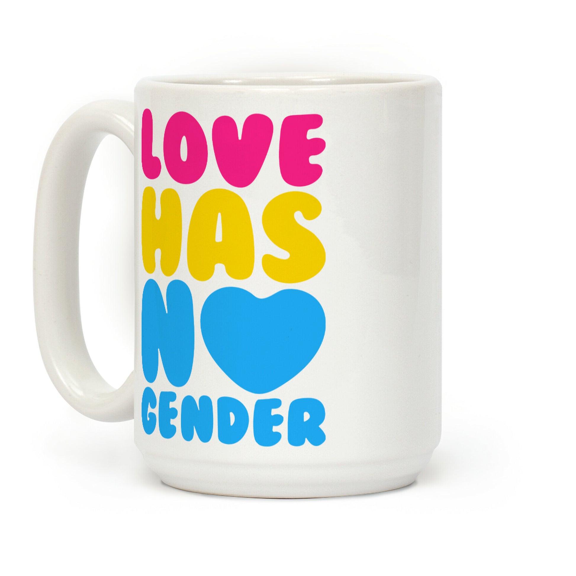 Love has no gender! Show off your Pansexual pride with this "Love Has No Gender" pansexual pride shirt! Our Mug features large handles for easy gripping and a wrap-around print. These heavy-duty Mugs are both dishwasher and microwave safe. Printed in the USA.
