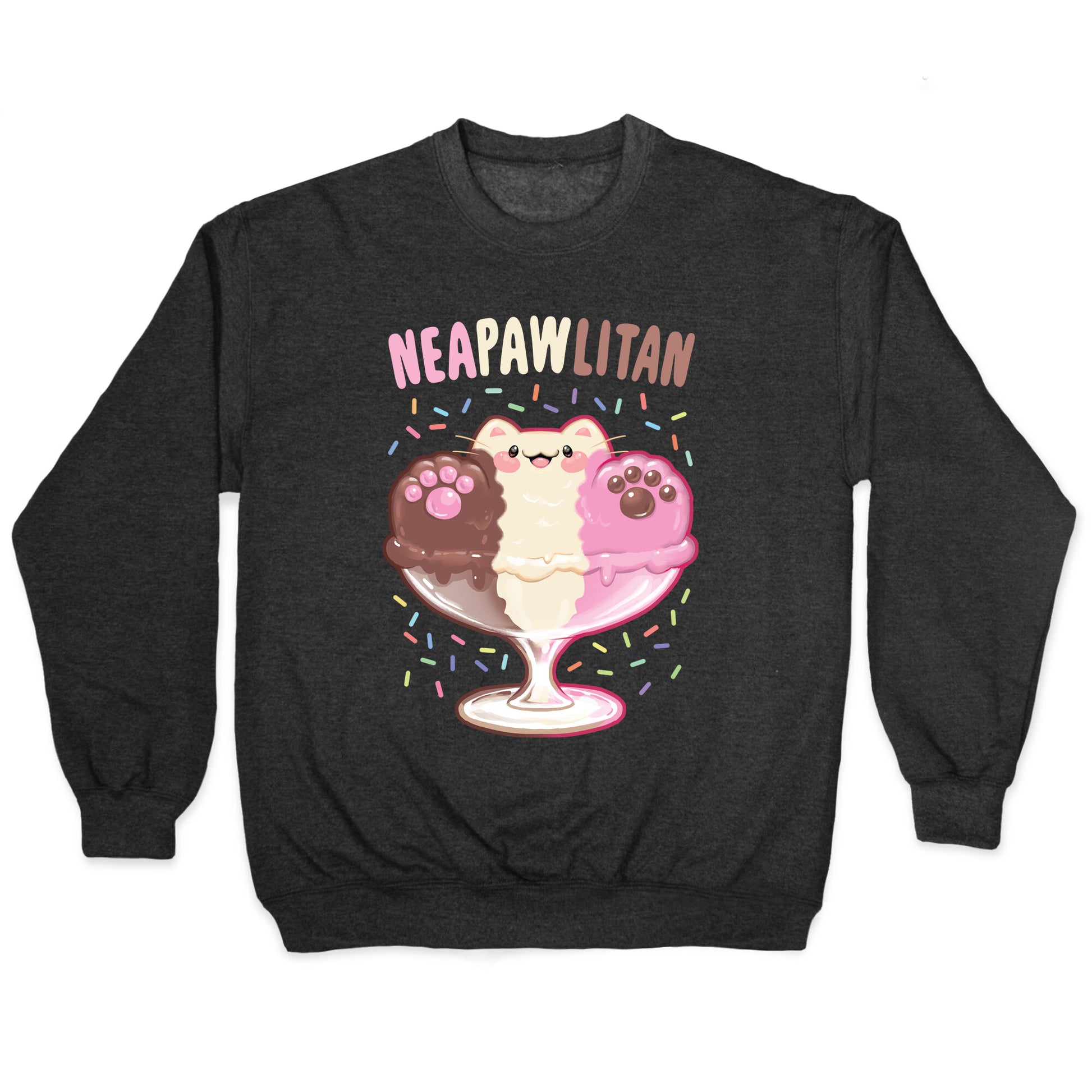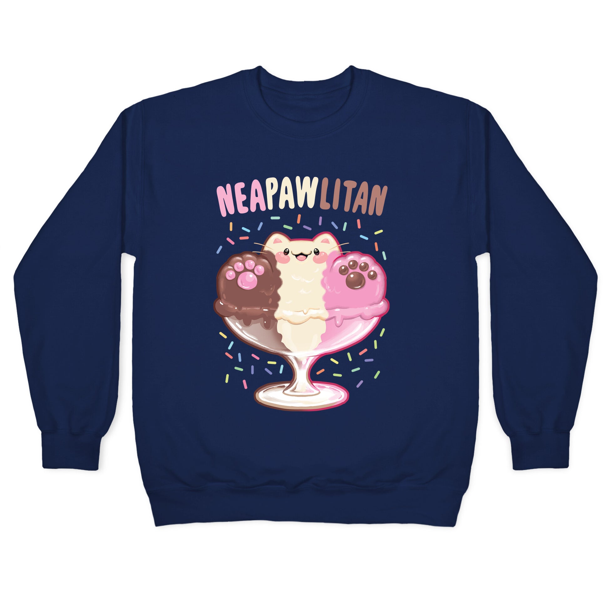Neapawlitan is the purrrfect treat for those who want the best of the classics! Pawcolate, Strawpurry, and vanillnya, all in one serving! Our Unisex Crewneck Sweatshirt is made from a soft 8-ounce fabric, and they feature a crew neck, with sleeve and bottom hems for durability. Great for layering. Preshrunk for your convenience! Printed in the USA. Made with 50% Cotton and 50% Polyester.