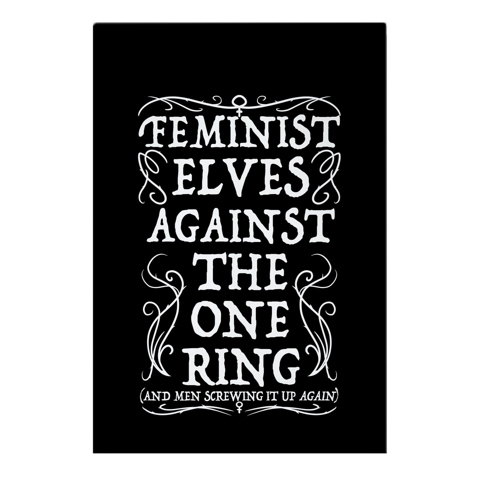 Feminist Elves Against the One Ring (and men screwing it up again). We love the powerful women in Lord of the Rings, Tauriel, Galdriel, Arwen, etc., and honestly, they probably wouldn't have majorly f***ed up Middle Earth if they had it. Female power! Show off your feminist, elvish, sass with this design!
